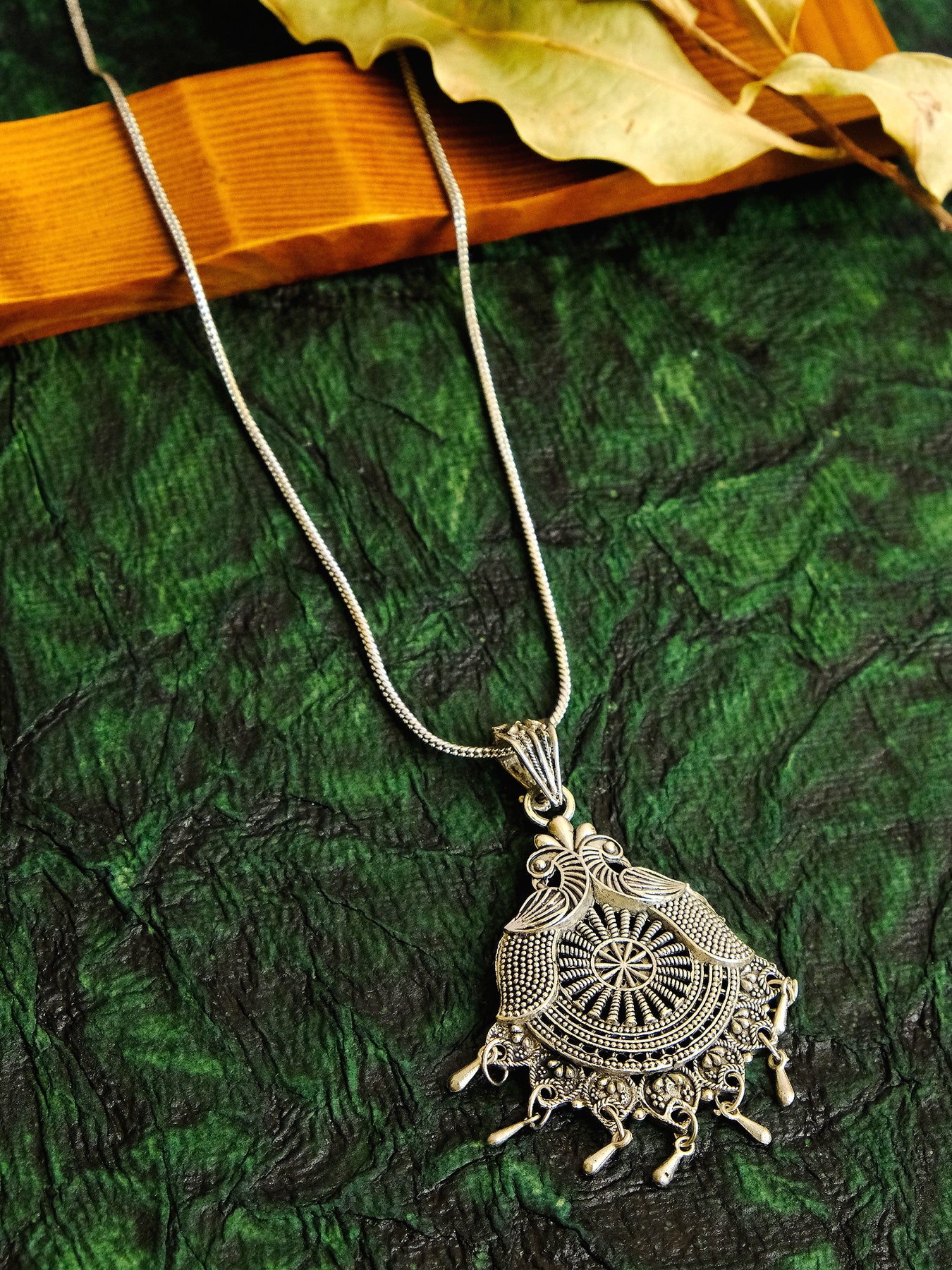Doused in a fusion of heritage and modernity, silver oxidised pendants are the epitome of stylish versatility. They easily transition from casual to formalwear, effortless on a breezy cotton dress, or adding a regal touch to a solid-colored saree. Garnering looks of admiration, these exquisitely detailed pieces prove the transformative power of minimalist oxidised silver pieces.