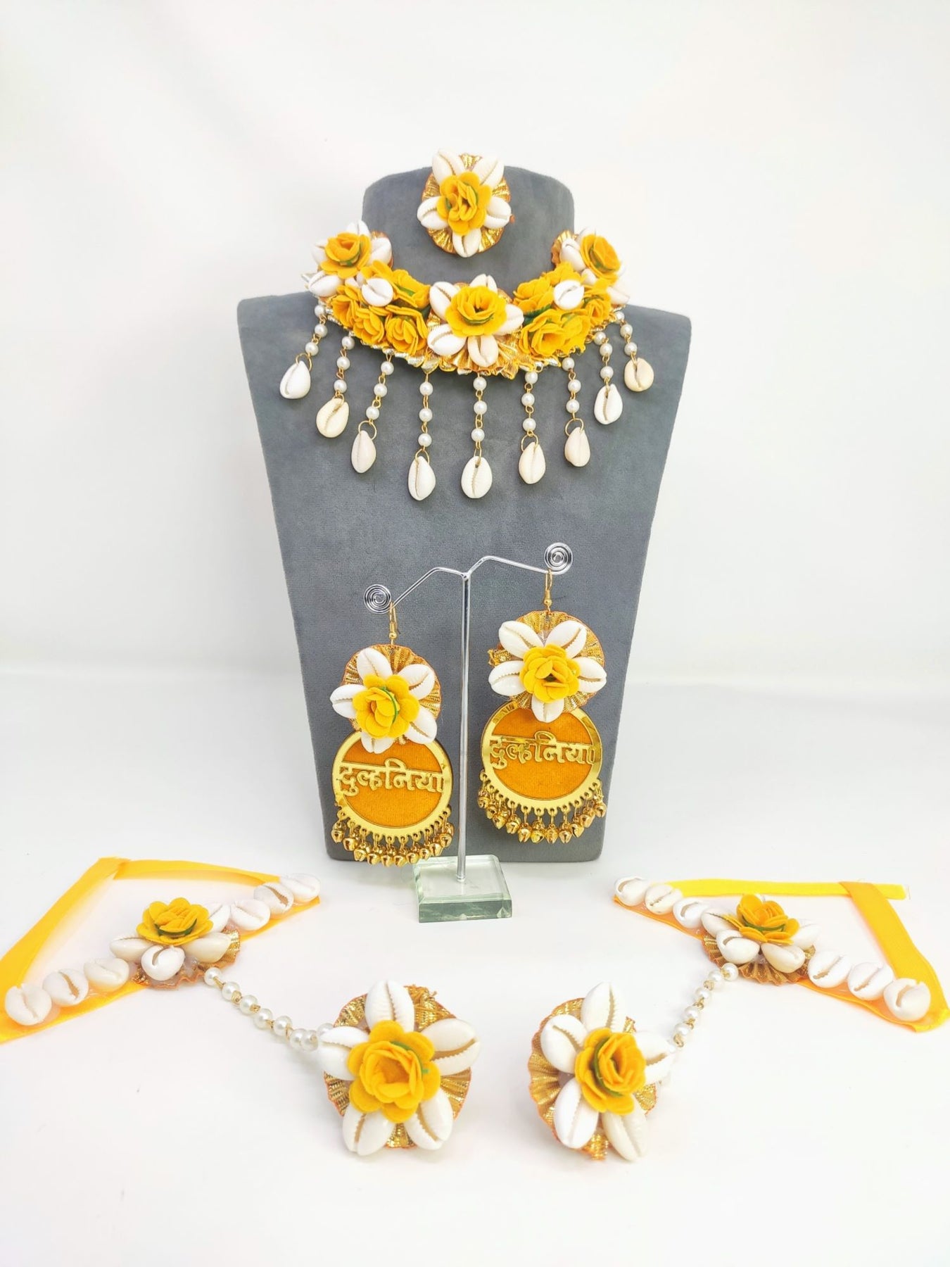 - Flower Jewellery for the Bride: Flower jewellery for the bride at her haldi ceremony is not just about following tradition; it's more about showcasing her unparalleled style and grace. With the radiant hues of flowers blended with intricate designs, these pairs beautifully with the yellow colour and creates a contrast that is utterly breathtaking.