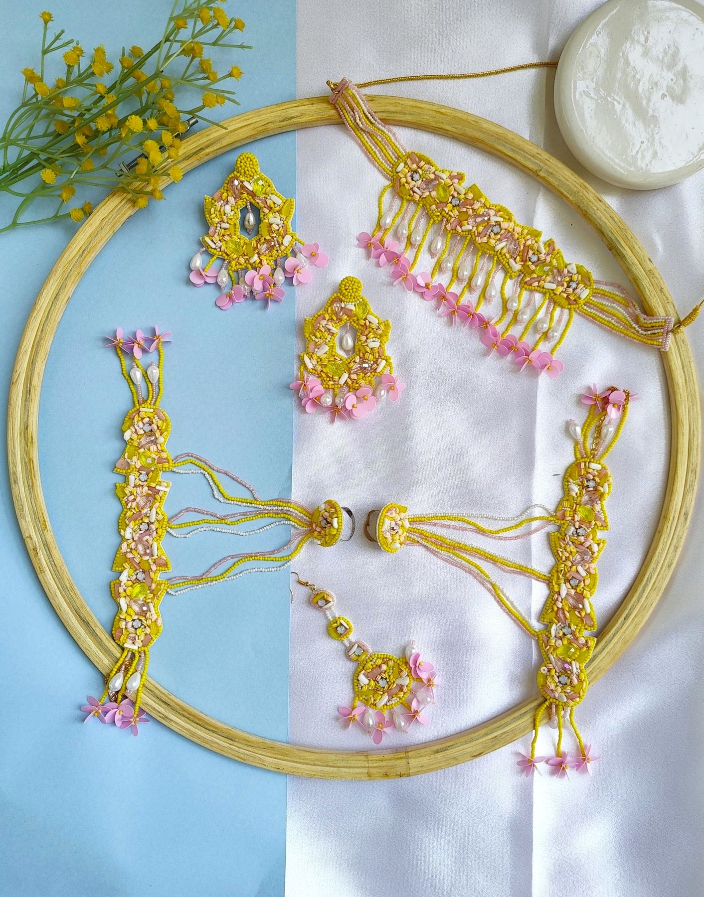One category of handmade jewellery that stands out is the Handmade Beaded Jewellery. This style brings together the vibrancy of beads and the craft of hand stringing them together. This form of jewellery is often seen in traditional Indian Haldi ceremonies, where the beauty of handmade jewellery earrings and sets truly shines.