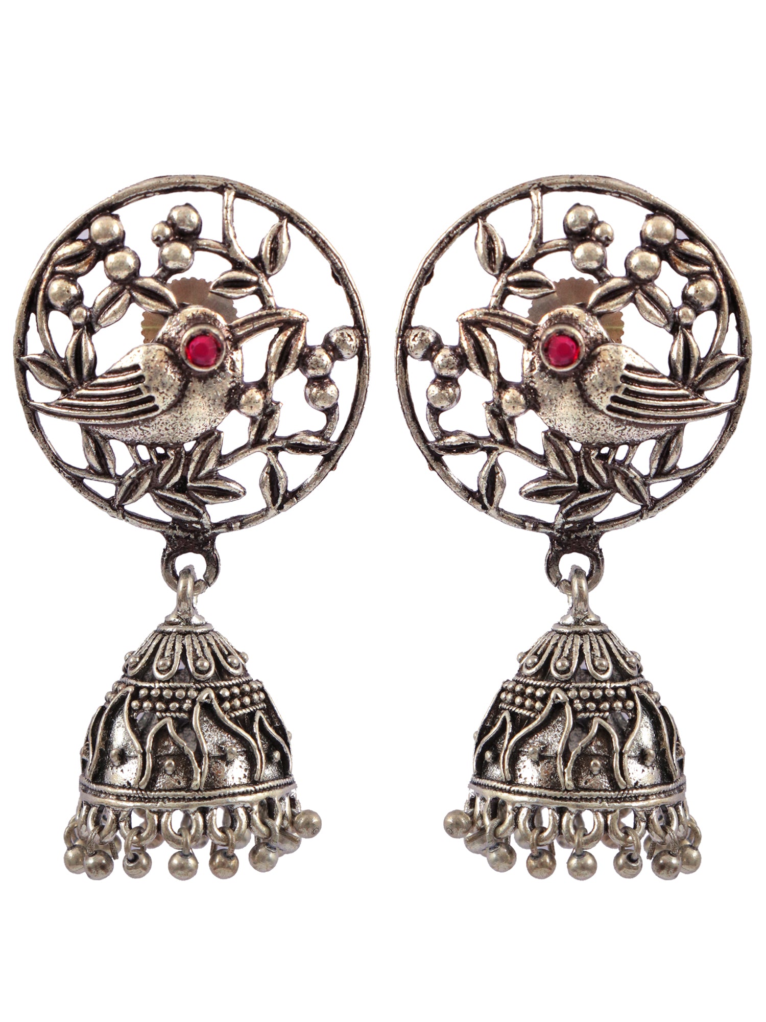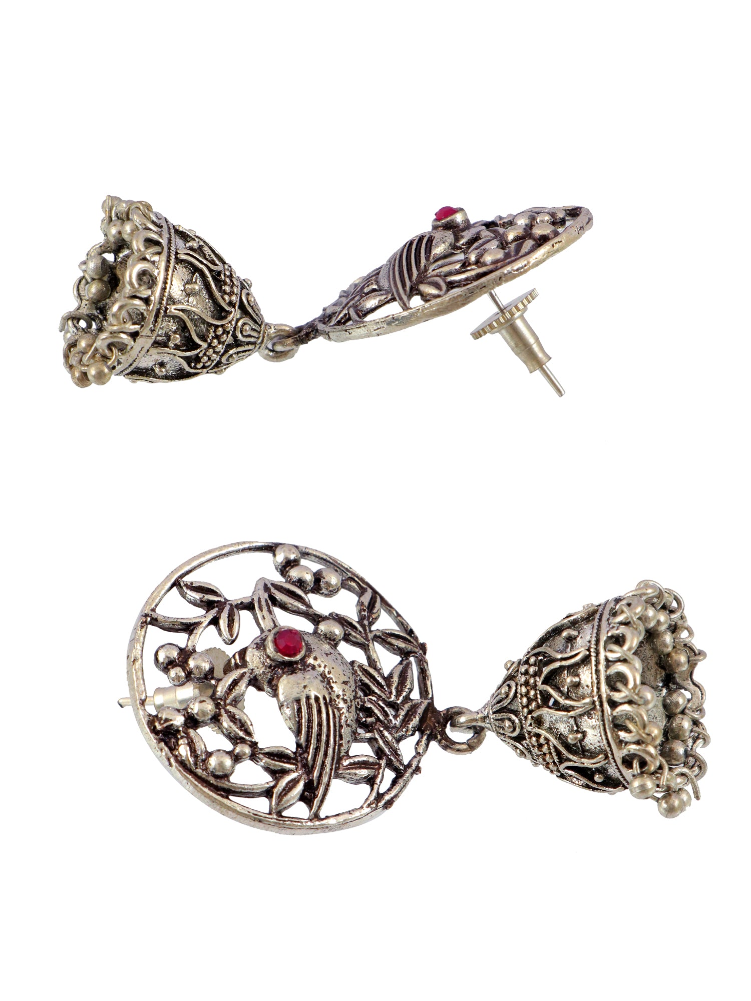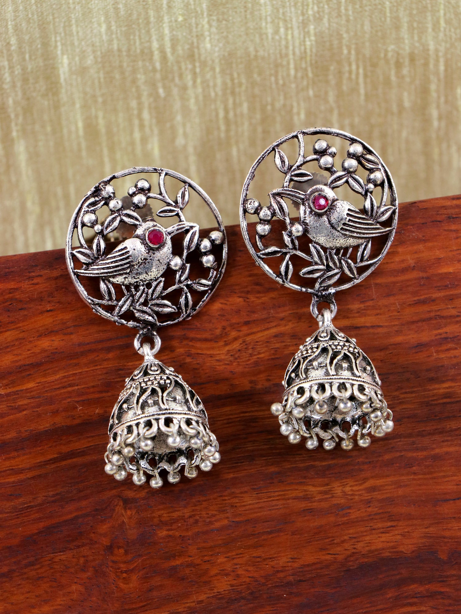 Antique Bird Style Oxidised Silver Jhumka Earrings - Small Silver Jhumki Design