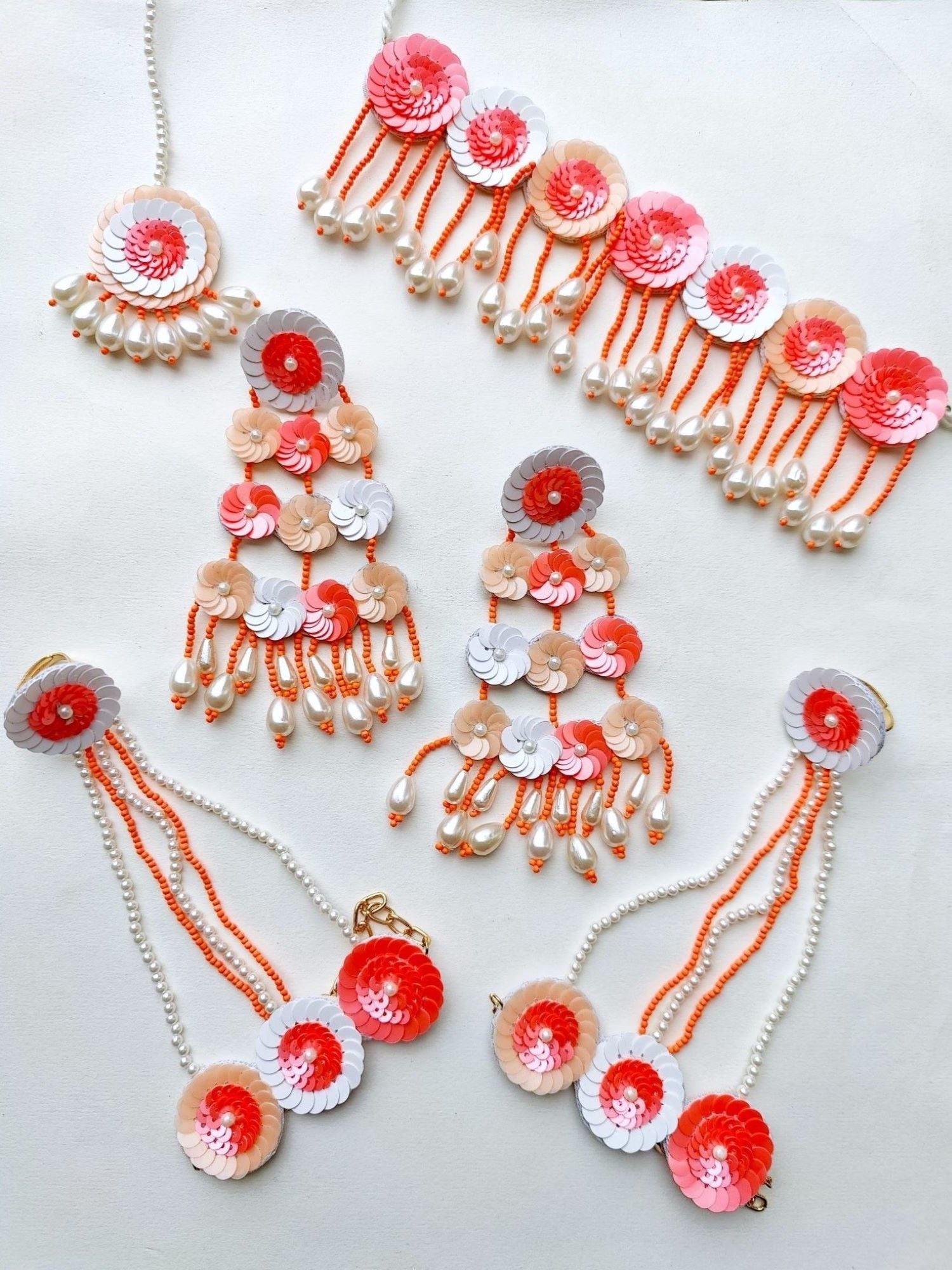 - Green-Pink Handmade Beaded Jewelery Set for Haldi/mehndi