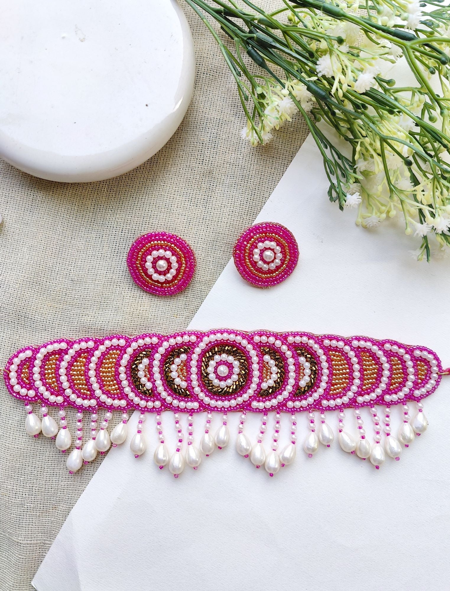 Handcrafted Pink Beaded Ensemble: Lightweight Choker Jewellery Set for Women