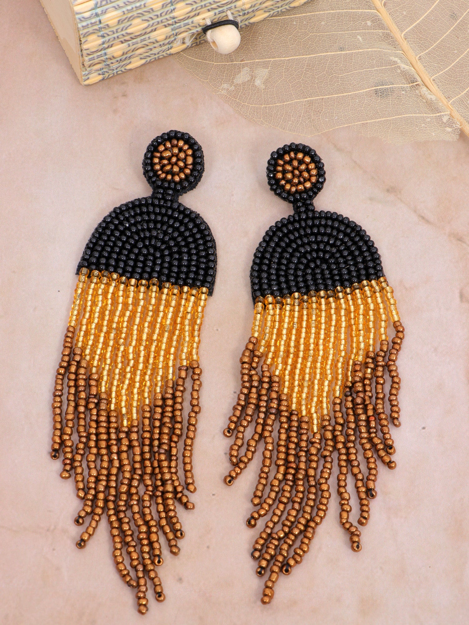 The earrings feature an intricate design of black & Gold beaded tassels, arranged in a beautiful and flowing pattern that captures the essence of bohemian style. The lightweight design makes them comfortable to wear, while the dramatic length and bold design make them perfect for adding a touch of sophistication to any party outfit.