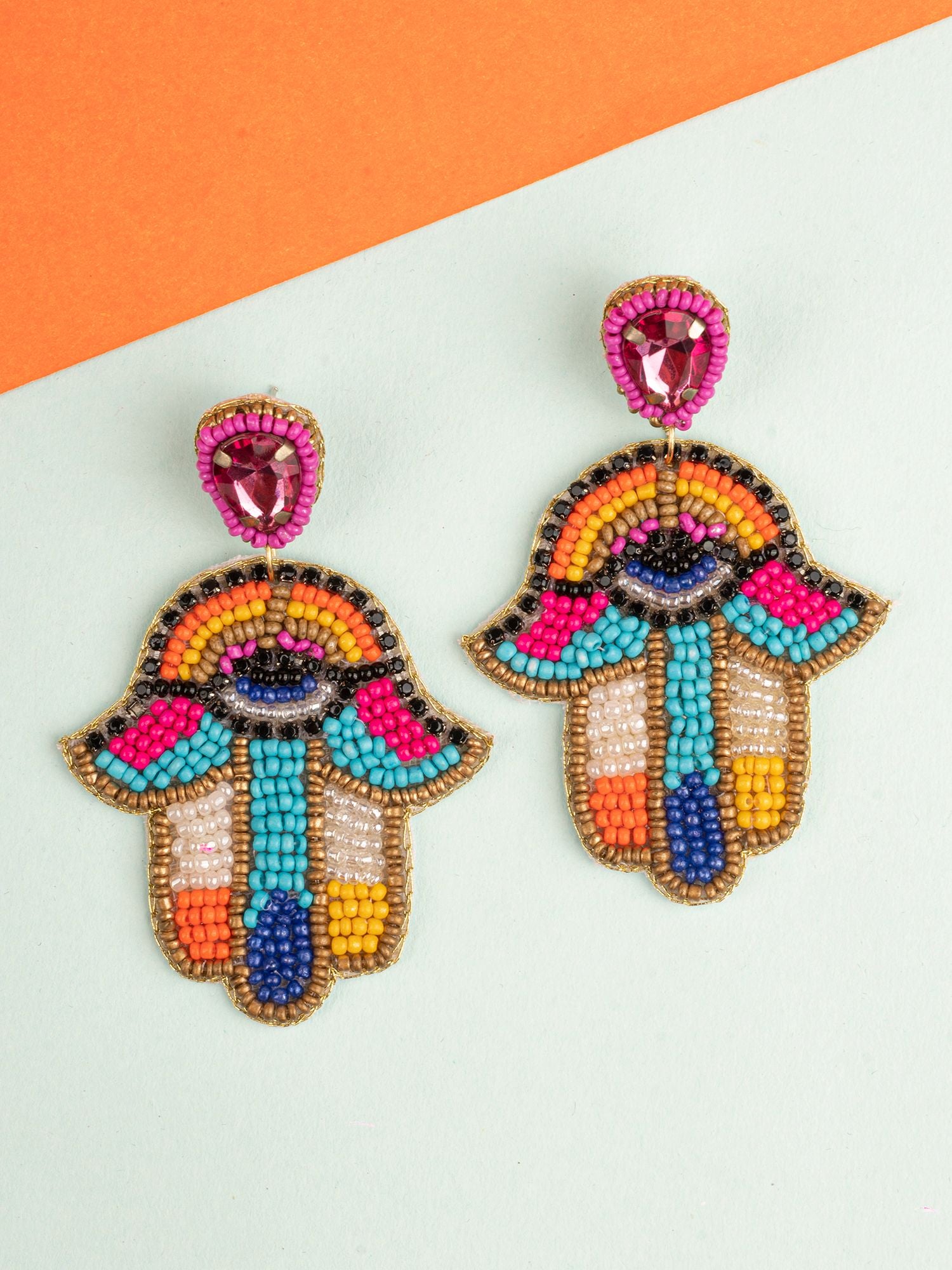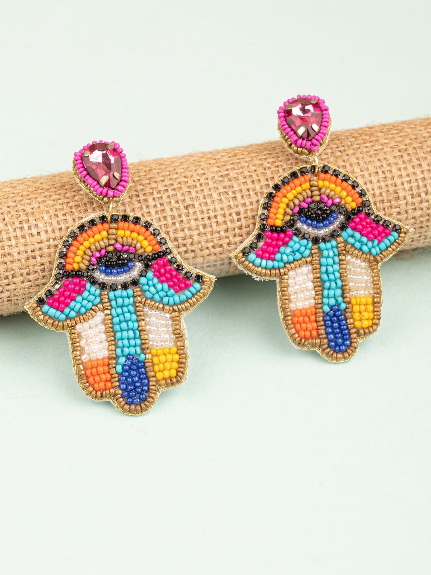 Elegant Handmade Hamsa Evil Eye Beaded Earrings - Lightweight Multicolor Danglers for Women & Girls