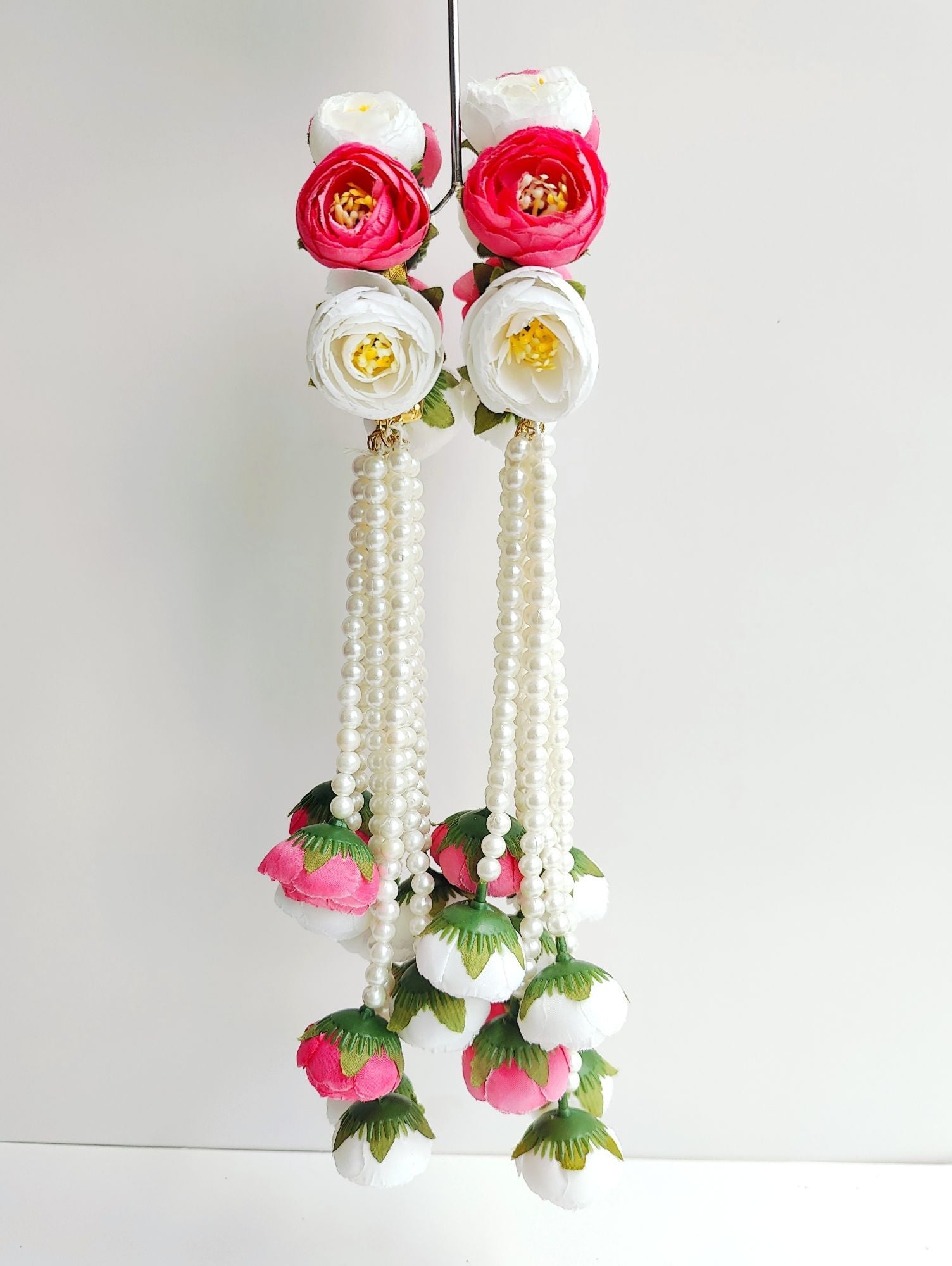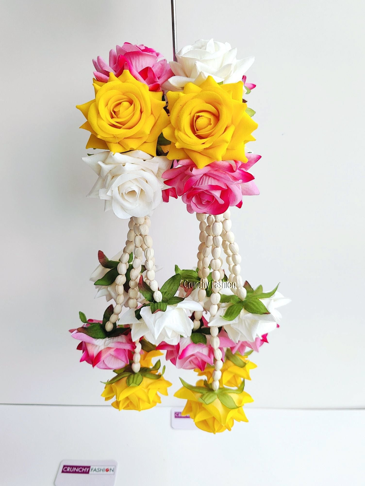 Designer bridal Kalire in pink, yellow, white, perfect for weddings & haldi, made from artificial flowers & pearls.