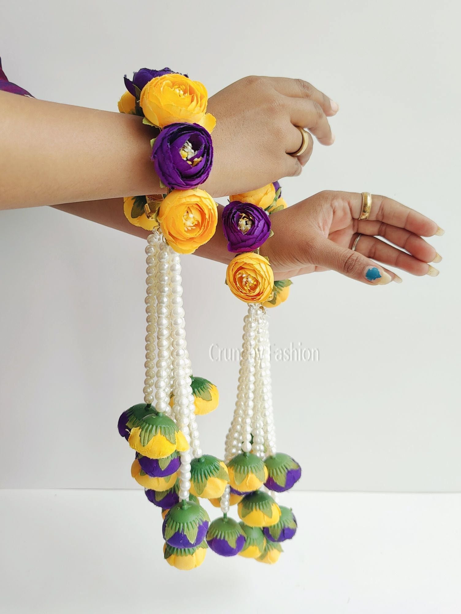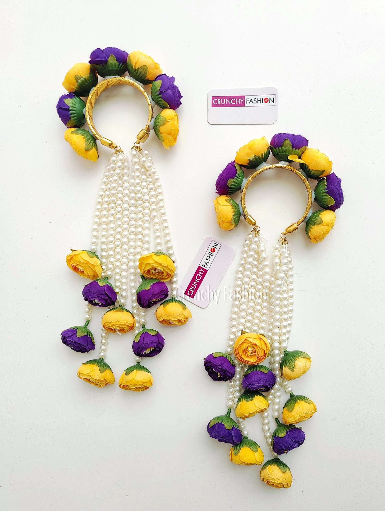 Designer Yellow-Purple Bridal Kalire with Artificial Flowers & Pearls, ideal for Weddings, Haldi, Mehandi, Baby Showers