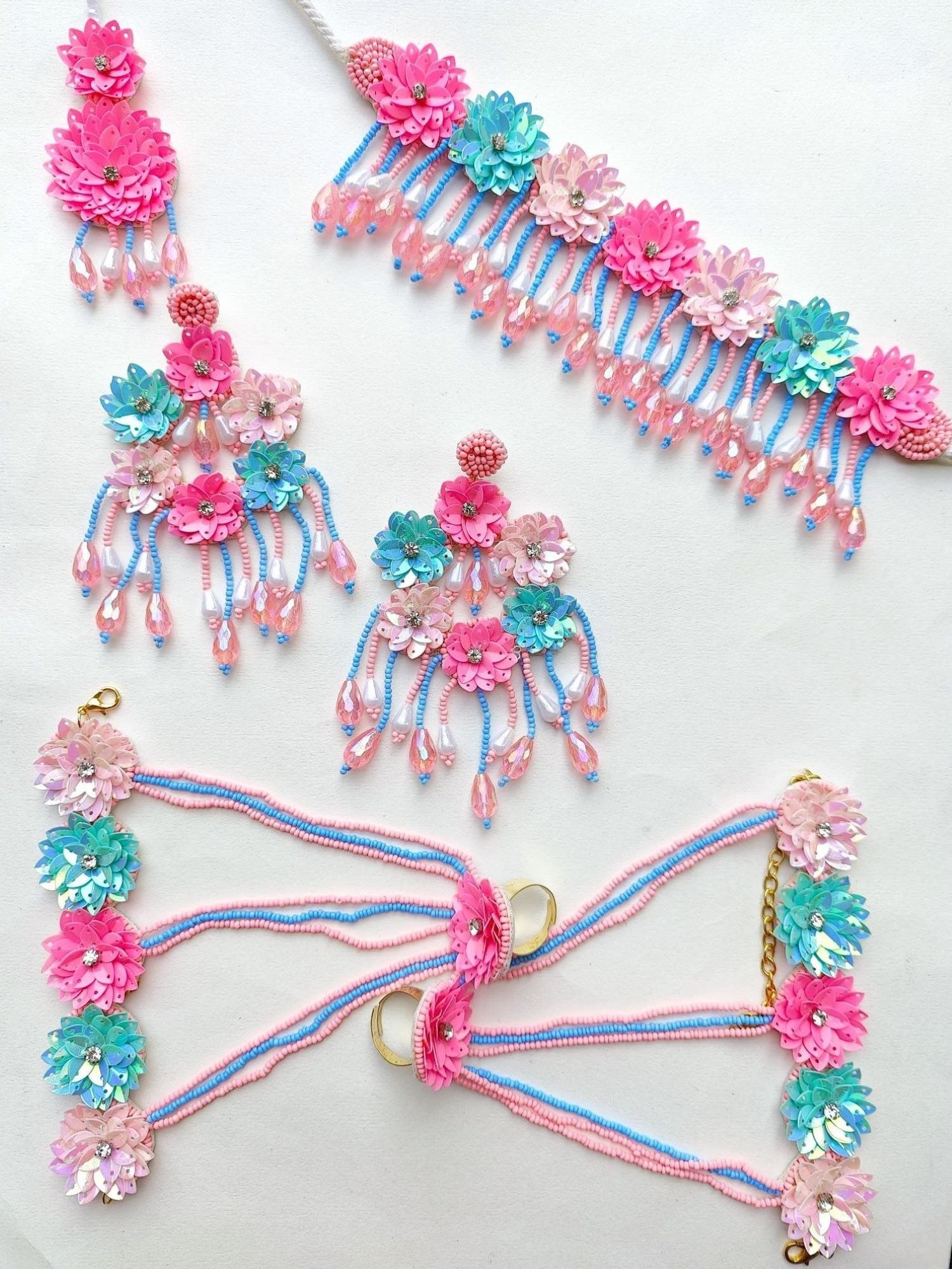 Blossom Bliss: Sky Blue-Pink Handmade Beaded Floral Haldi Jewelry Set