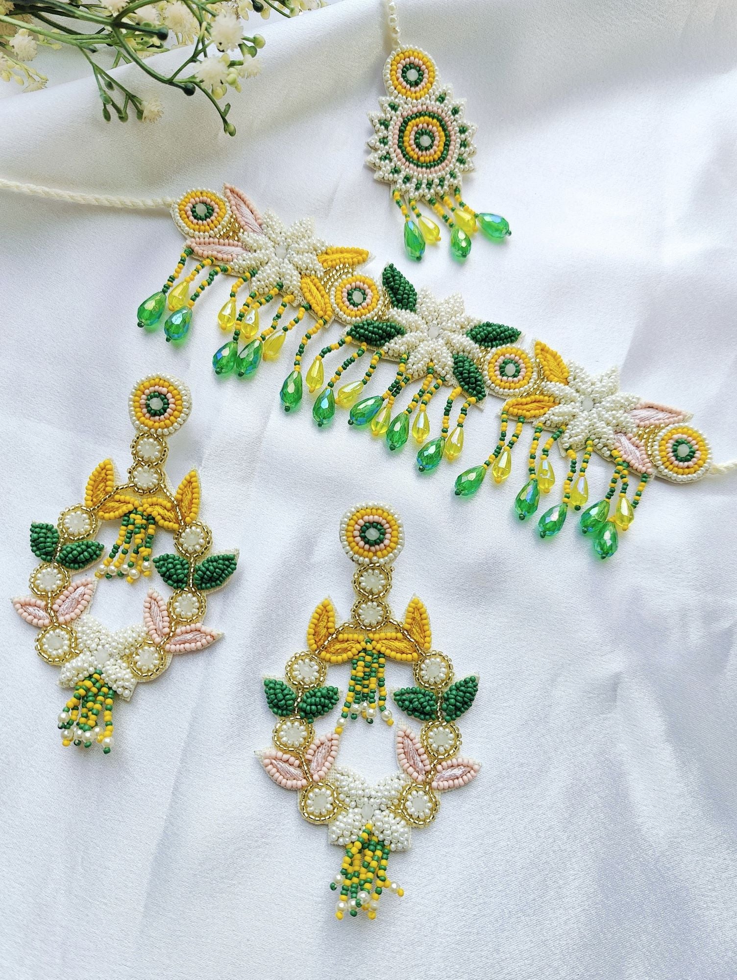 - Green-Yellow Bridal Handmade Floral Jewellery Set for Haldi-Mehndi, Carnivals