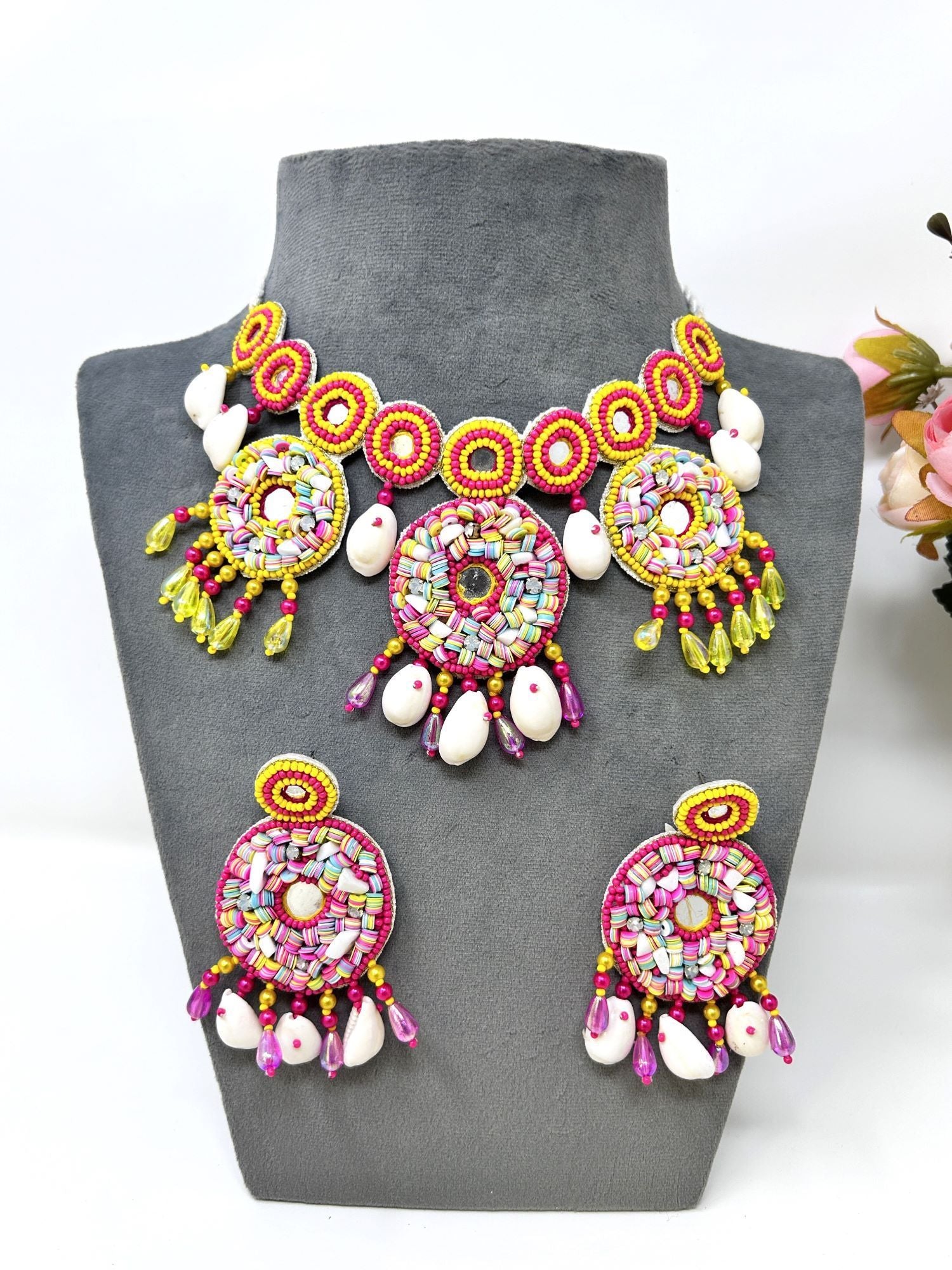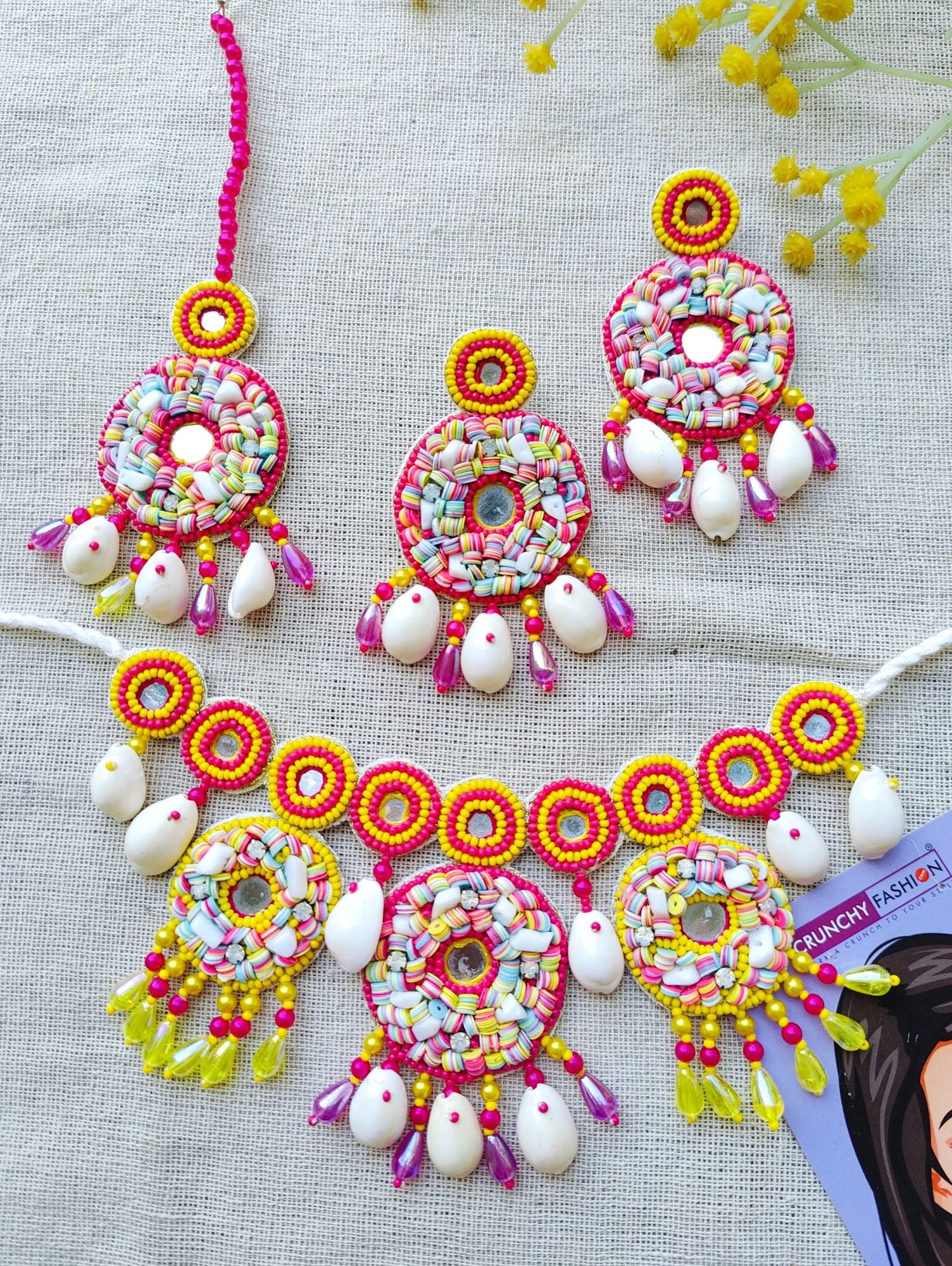 - Handmade Pink-Yellow Pearl & Sea Shell Haldi Mehndi Jewellery Set for Brides