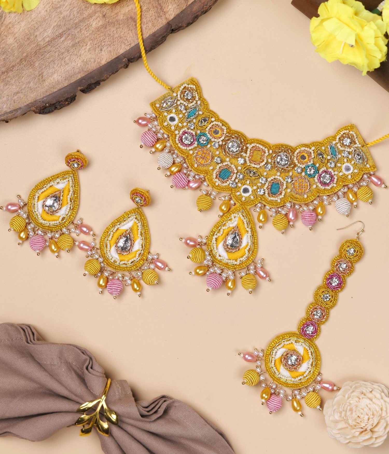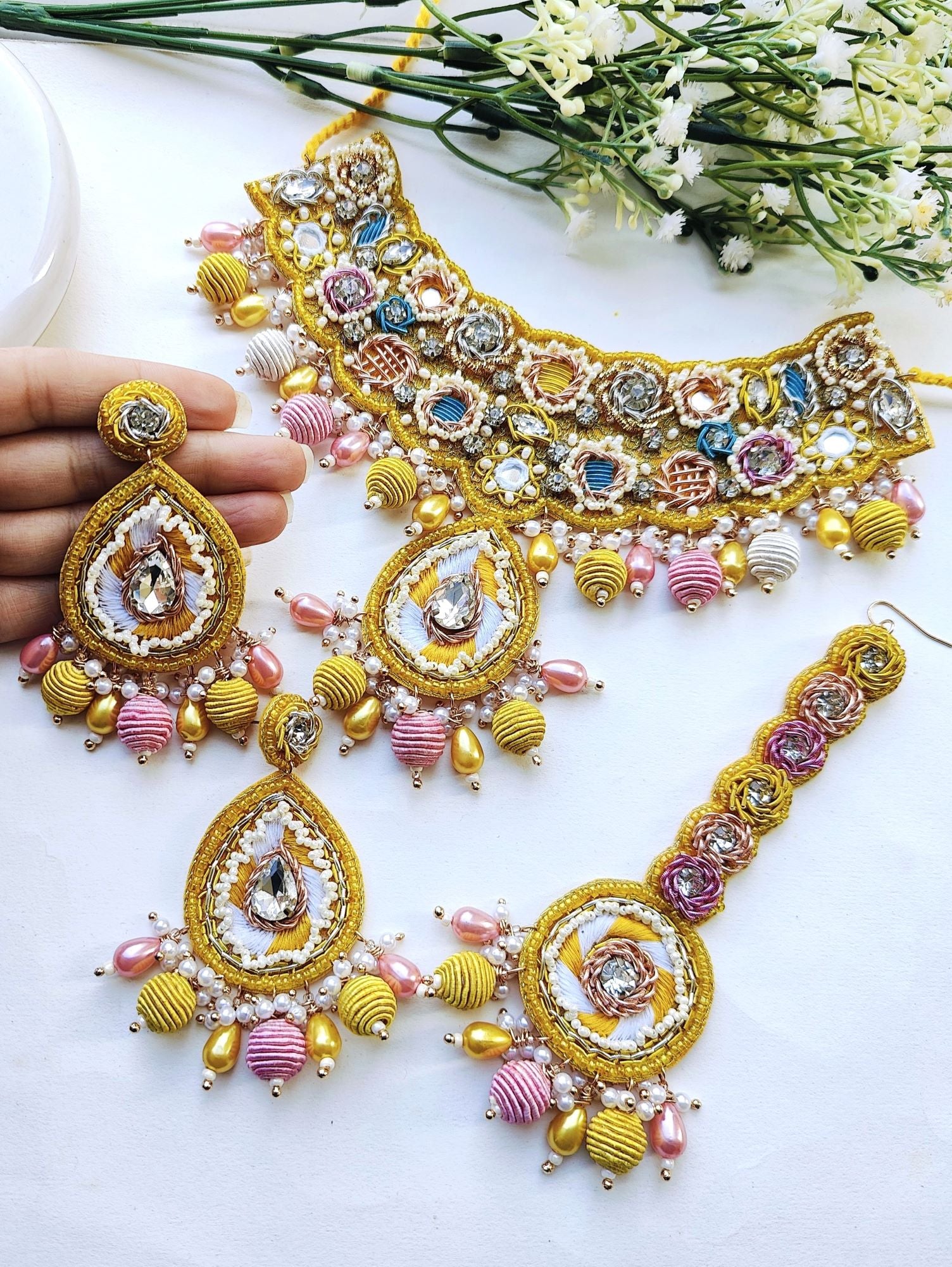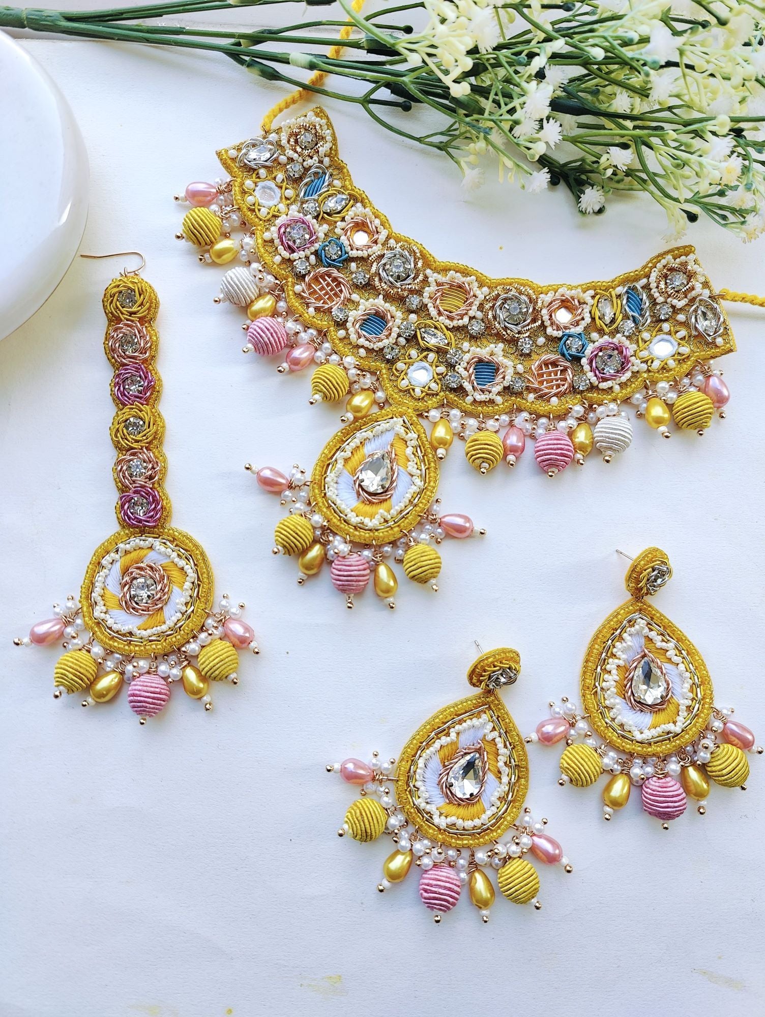 - Luxurious Green Floral Handmade Haldi Jewelry Set for Bridal Events