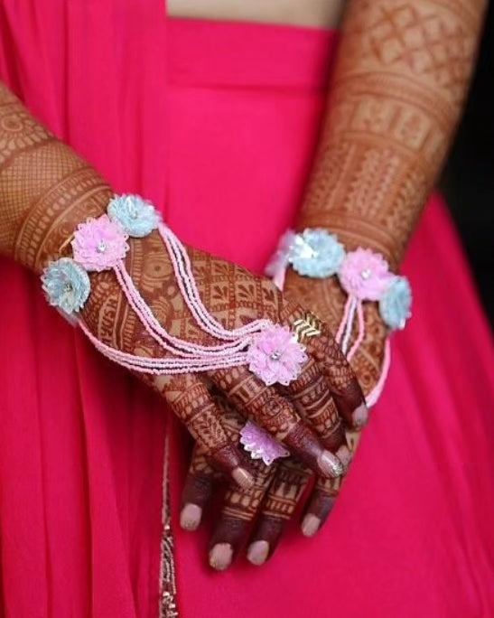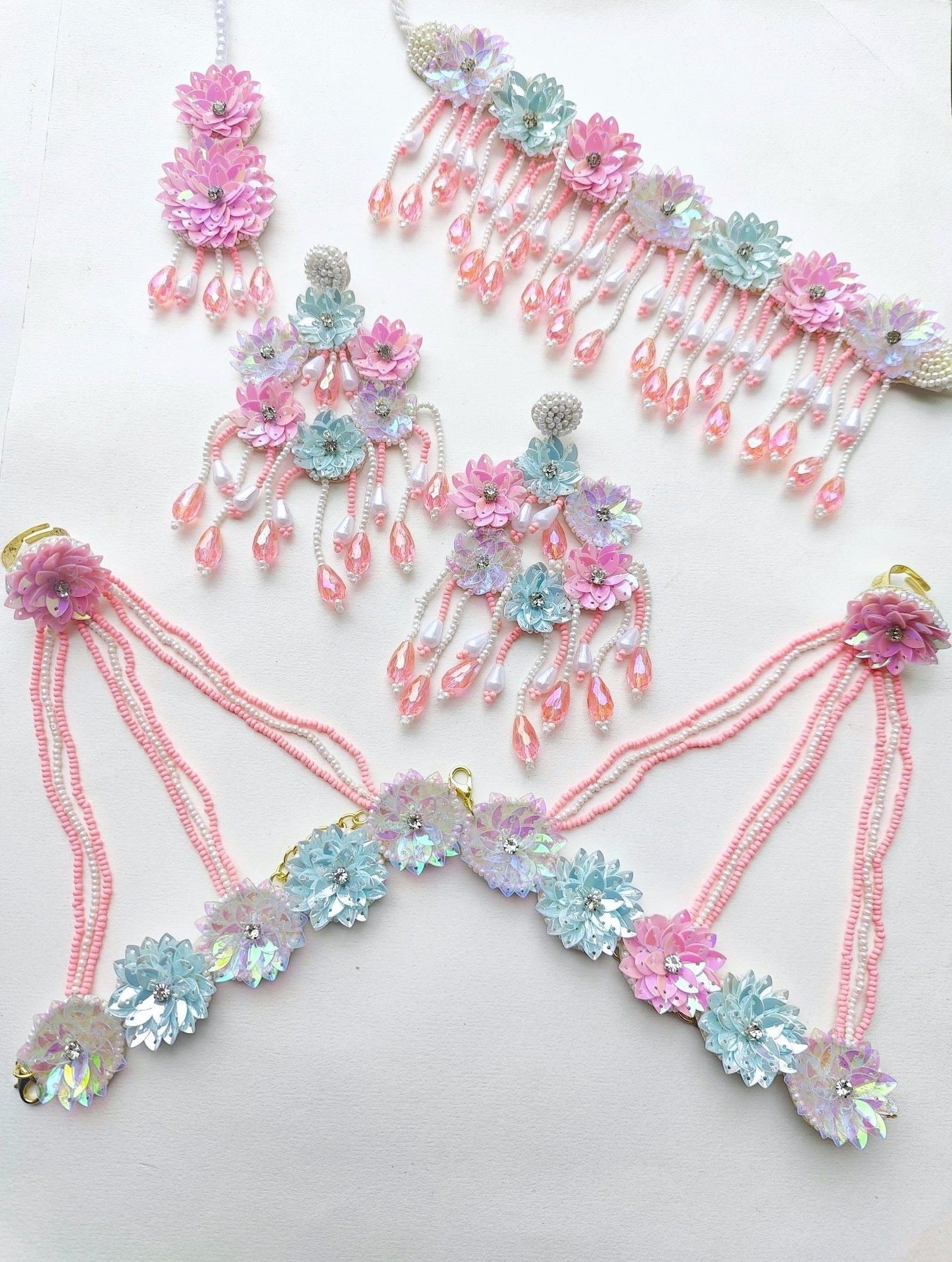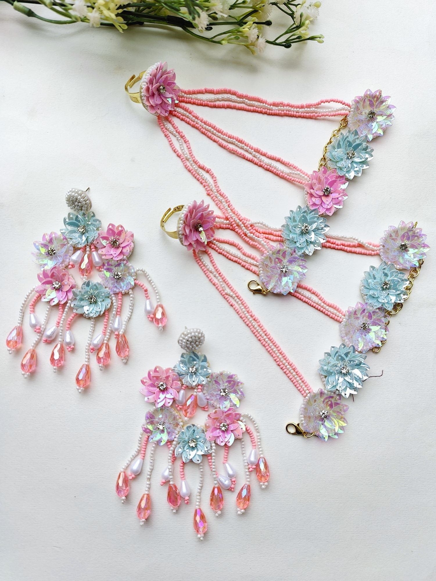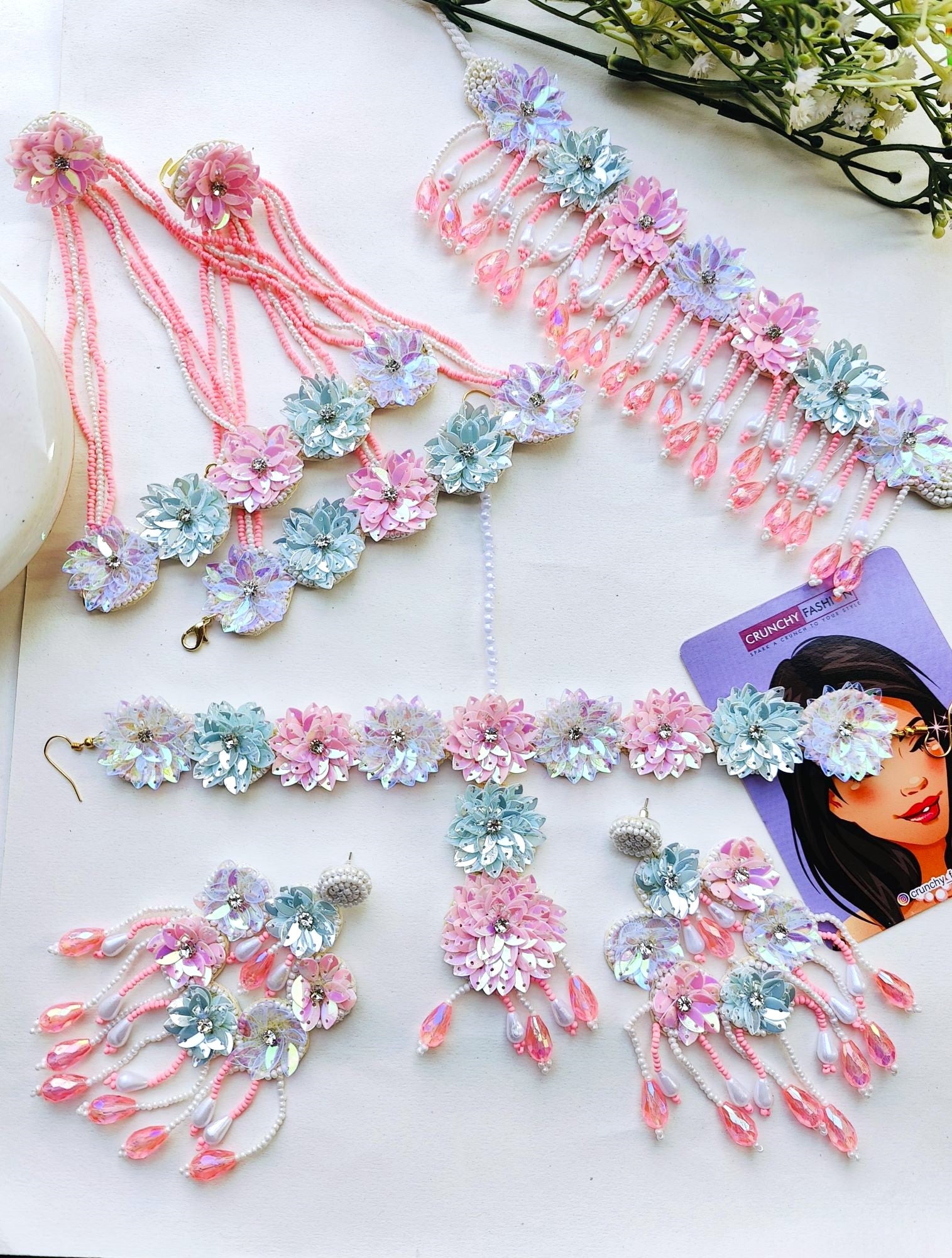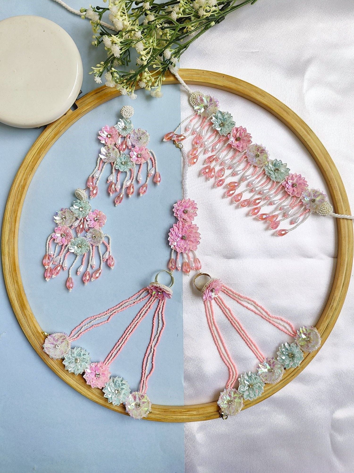 - Handcrafted Pastel Pink & Powder-Blue Floral Beaded Ensemble