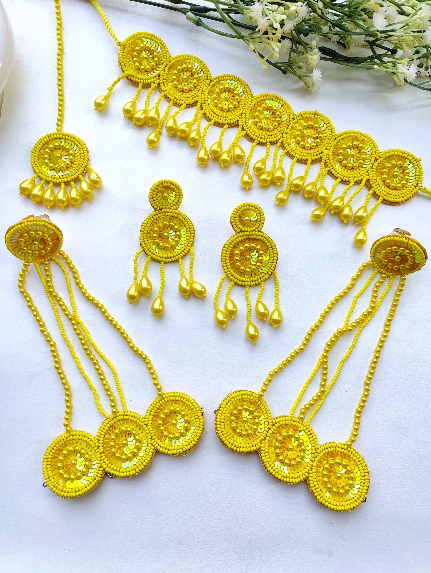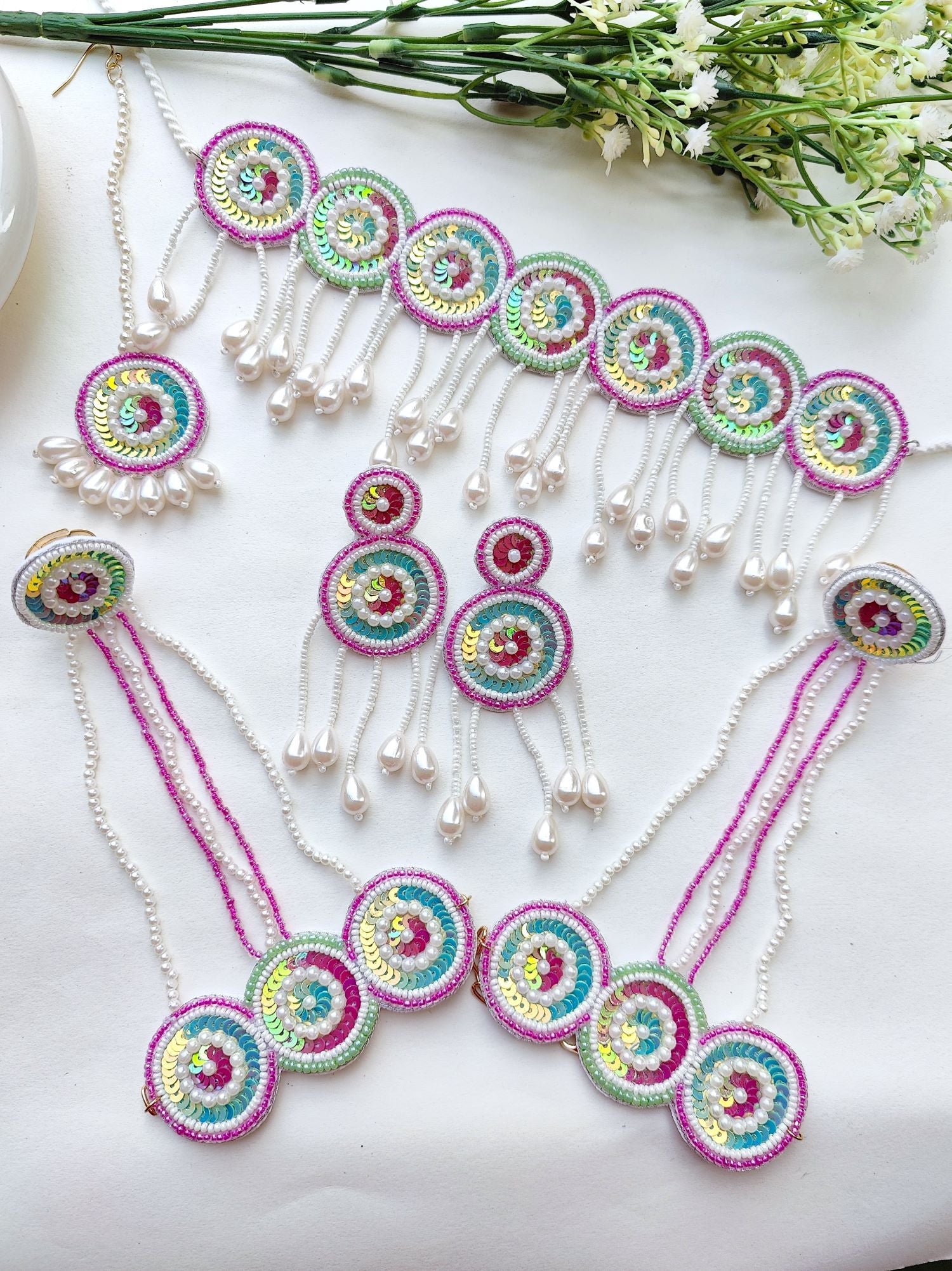 - Blossom Charm: Purple-Green Handmade Beaded Floral Jewelry Set for Haldi & Mehndi