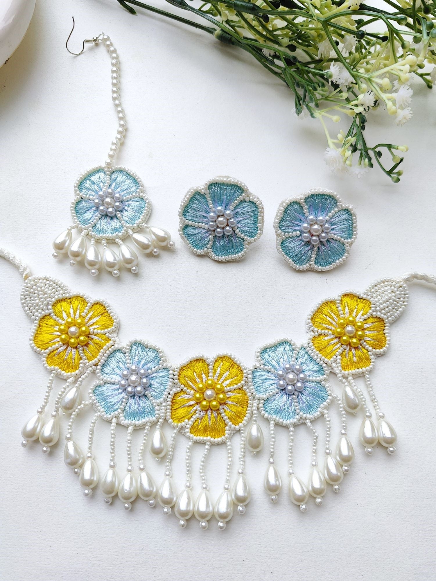 - Bridal Elegance: Handcrafted Yellow-Sky Blue Beaded Floral Set for Haldi Ceremonies
