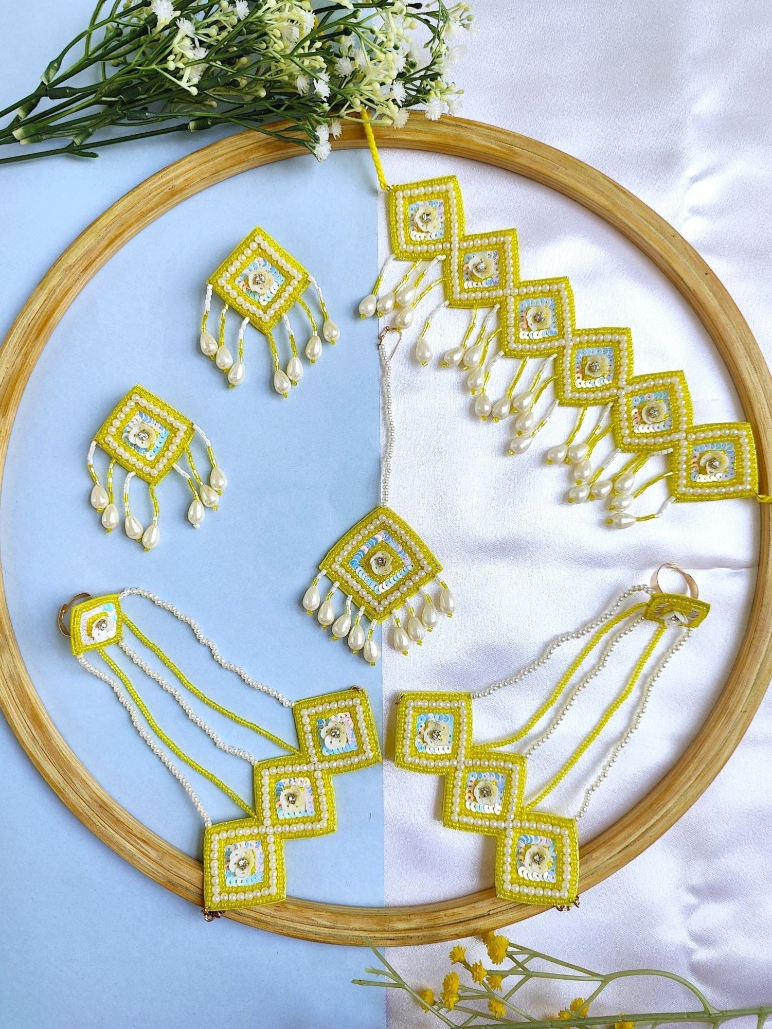 - Blossom Aura: Yellow and White Handcrafted Beaded Choker Set for Haldi-Mehndi Celebrations