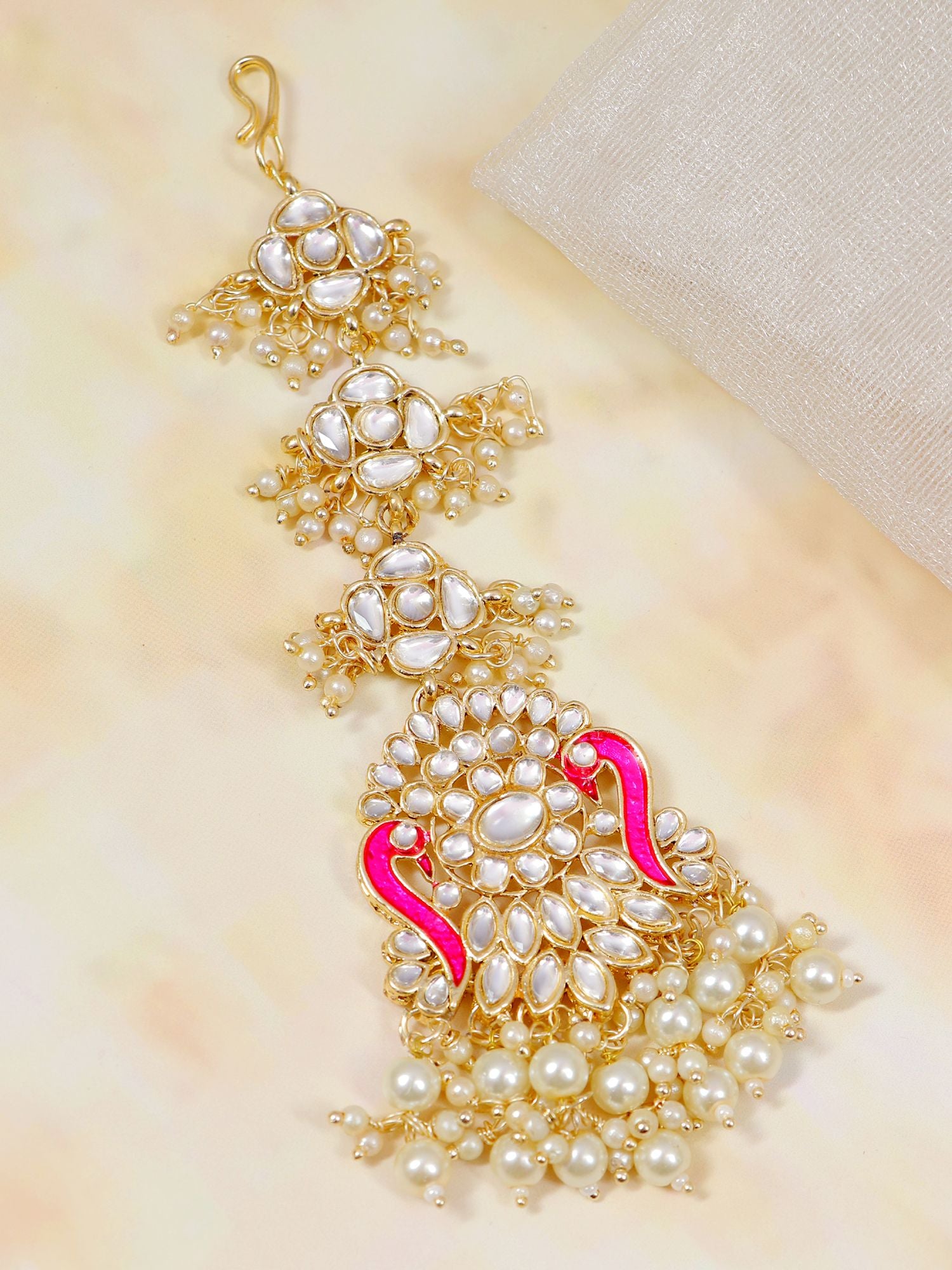 - Gold-Plated Peacock Design Kundan Stone White & Pink Embedded Maang Tika