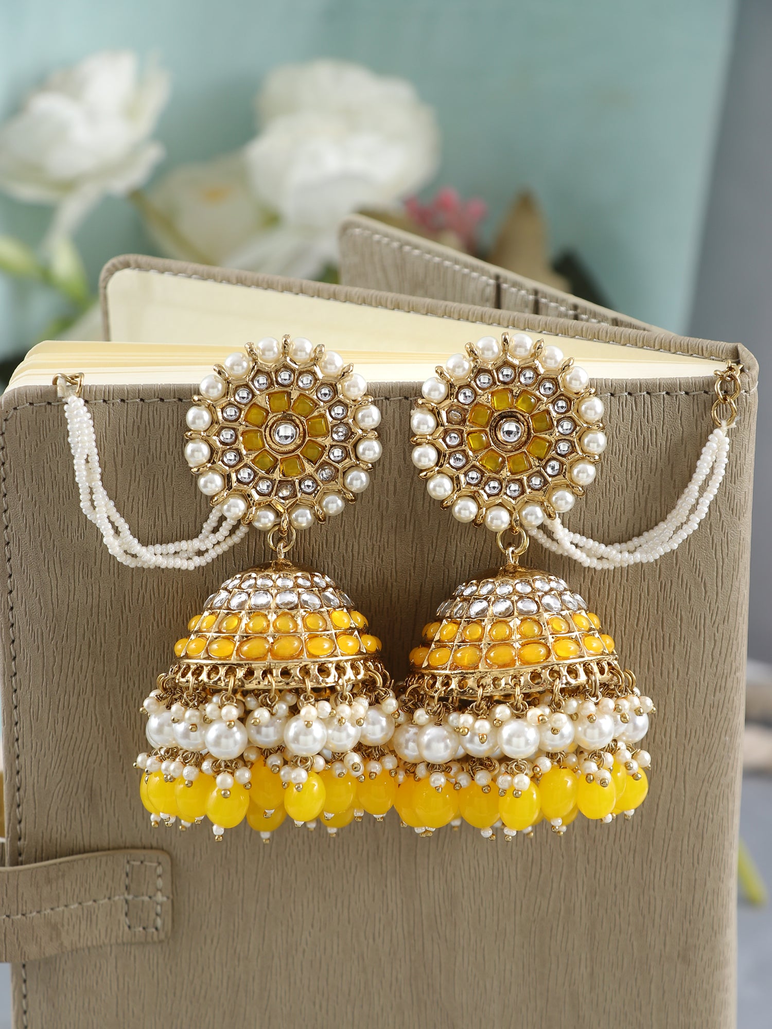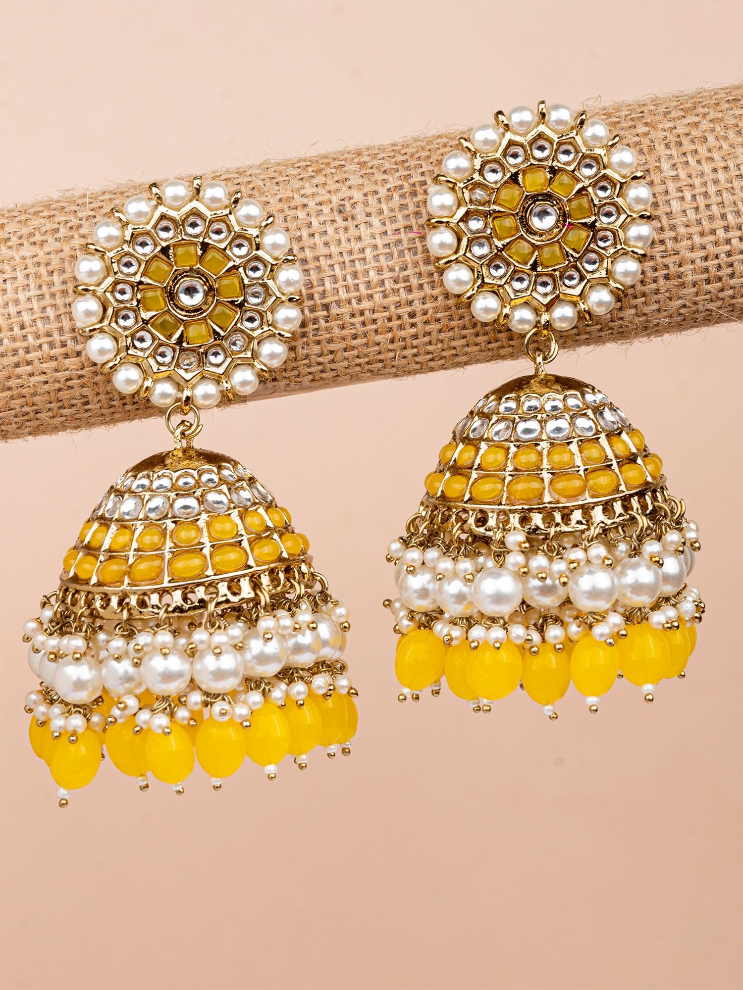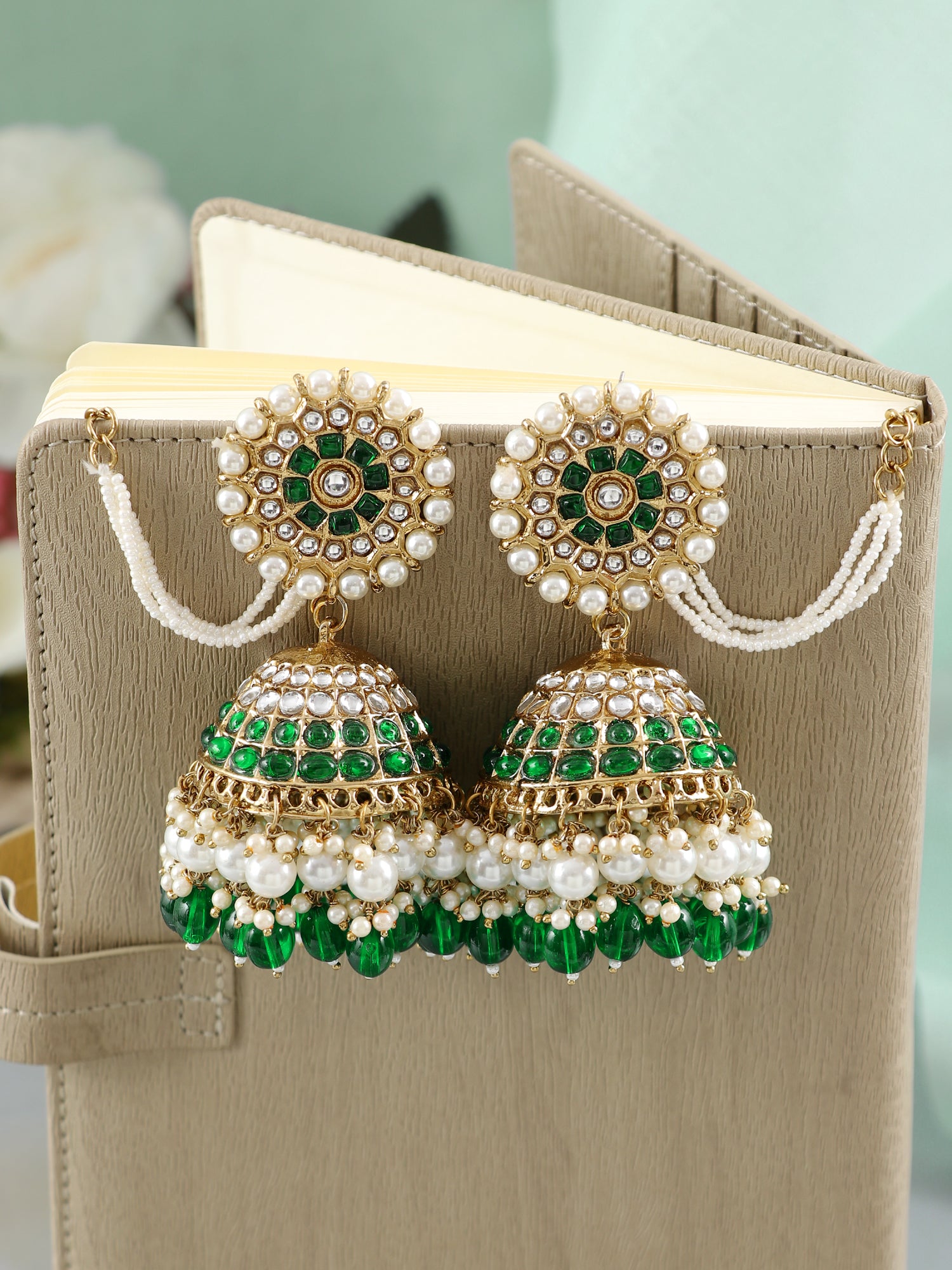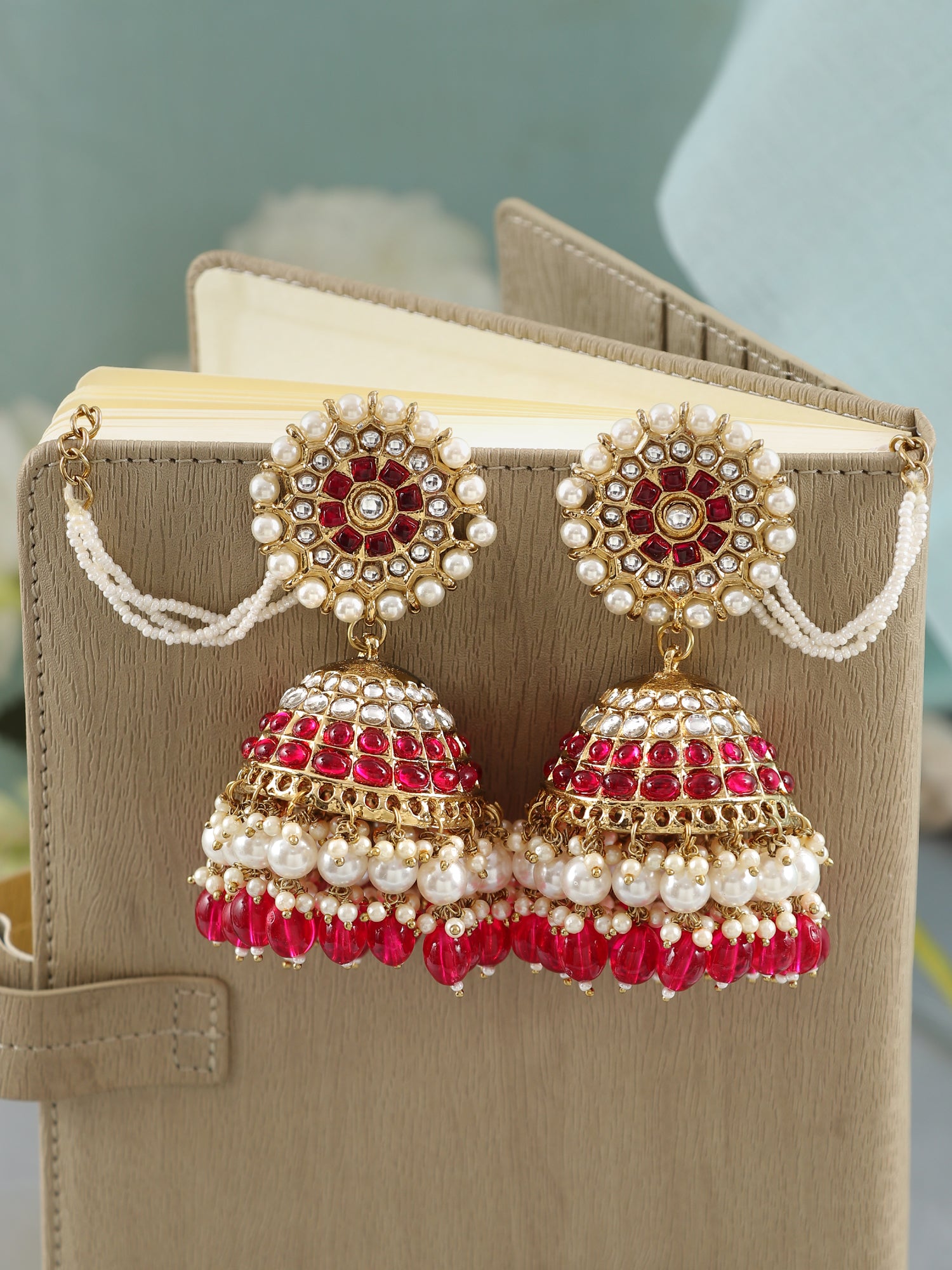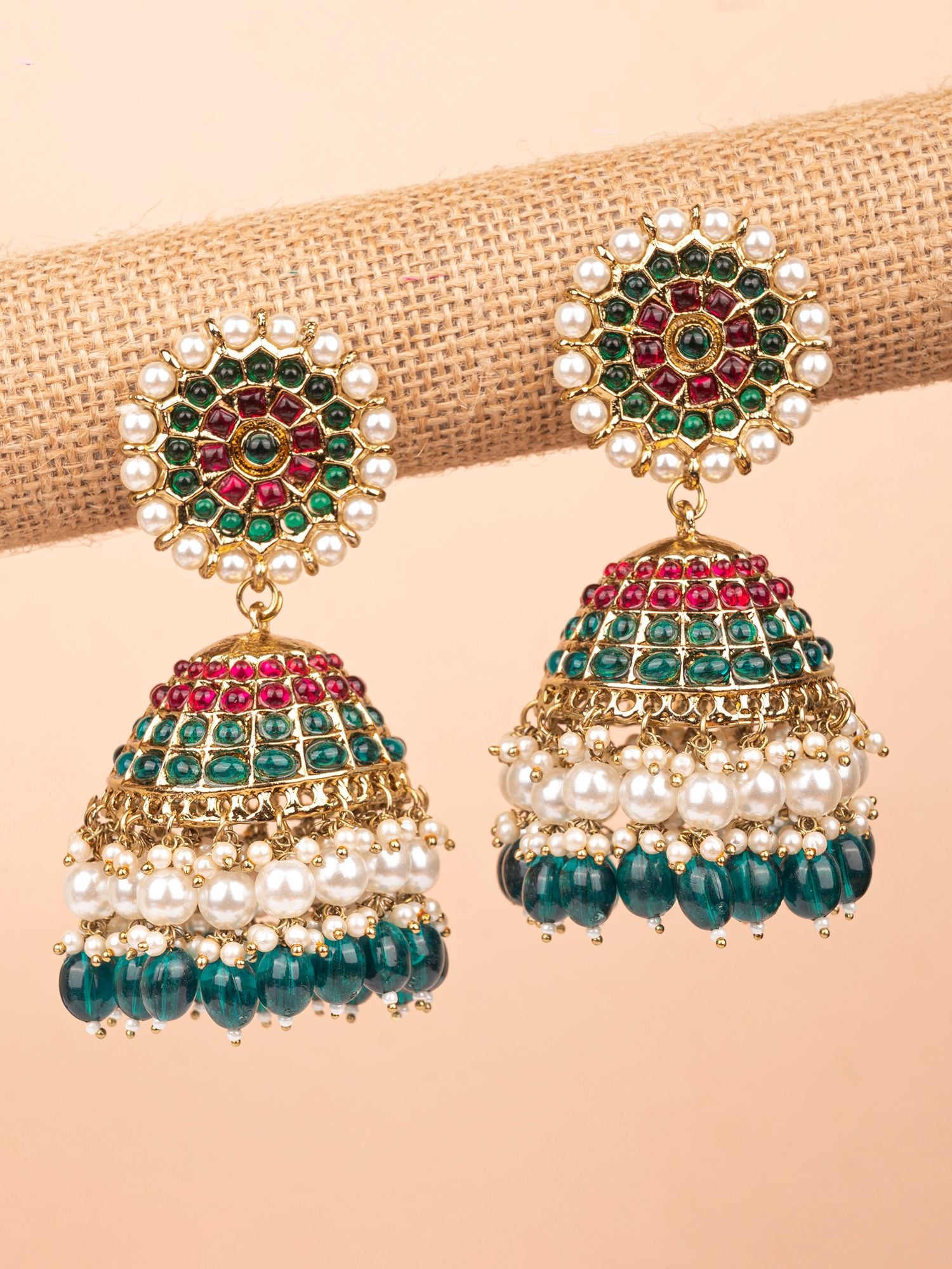 - Pink-Green Kundan Studded Wedding Jhumka Earrings for Women