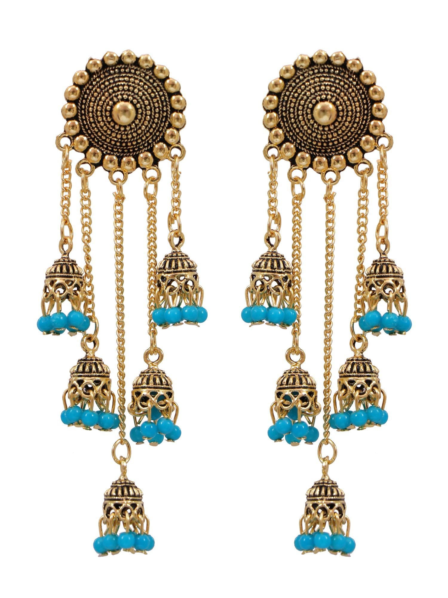 Introducing our 'Fashionable Gold & Sky-Blue Jhumka Earrings', a perfect blend of unique, fashionable and beautiful design from our ethnic collection. Perfectly crafted, these sky-blue and gold-plated jhumka earrings feature an enchanting asymmetric design with a round-shaped beaded tassel that captivates attention. Perfectly suited for both casual and formal occasions, these earrings are lightweight, chic and comfortable to wear. Ideal earrings for girls or women, they make for an excellent choice for gifting to your loved ones. Let these jhumka earrings enhance your look with a touch of sparkle and match flawlessly with your sky-blue saree or other attires. Don't wait! Get these exquisite gold-plated jhumka earrings now and take a plunge into a world of timeless fashion.