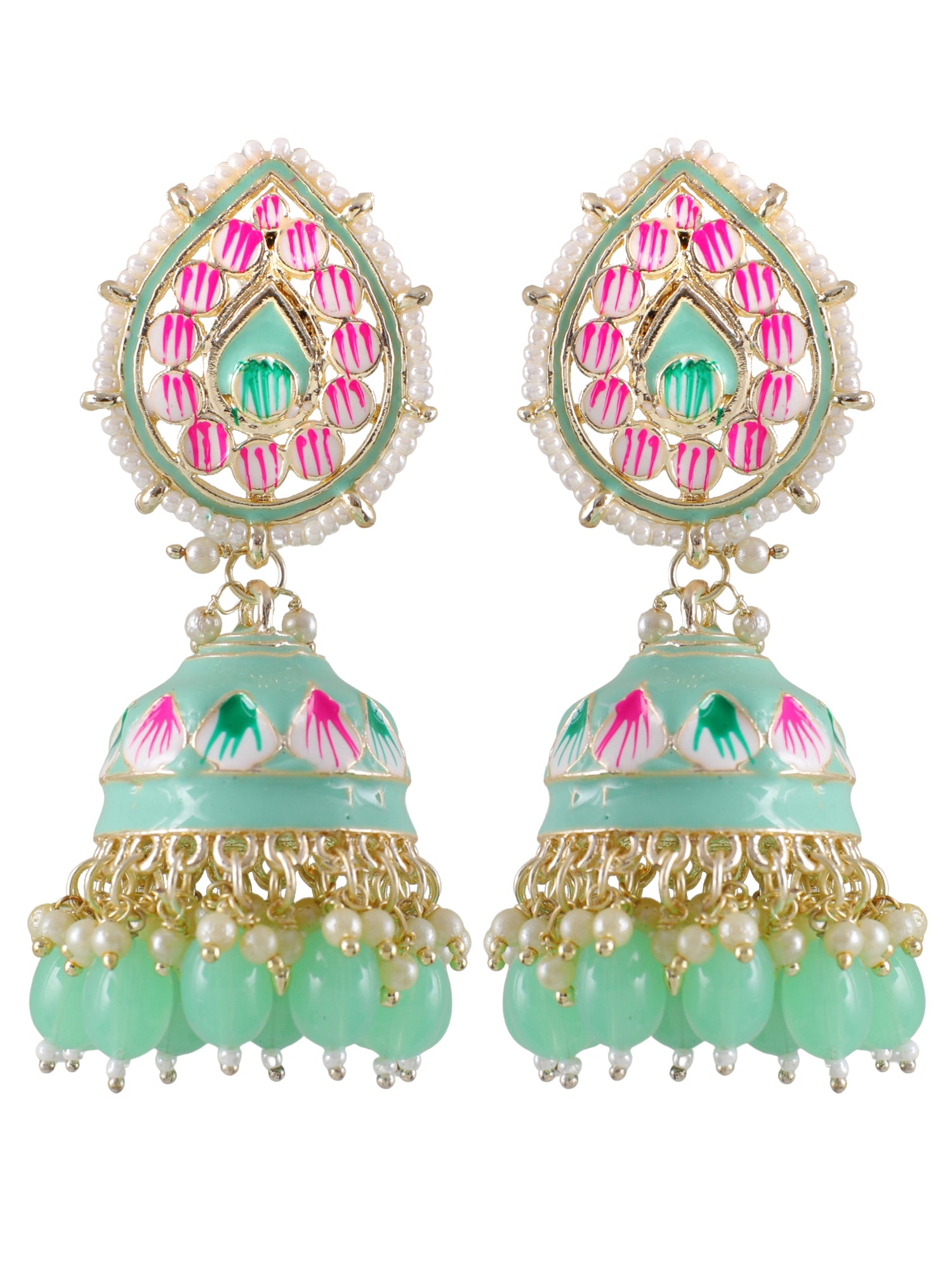 - Party Ready Light Green Meenakari Jhumka: Ethnic Drop Earrings with Moti Work