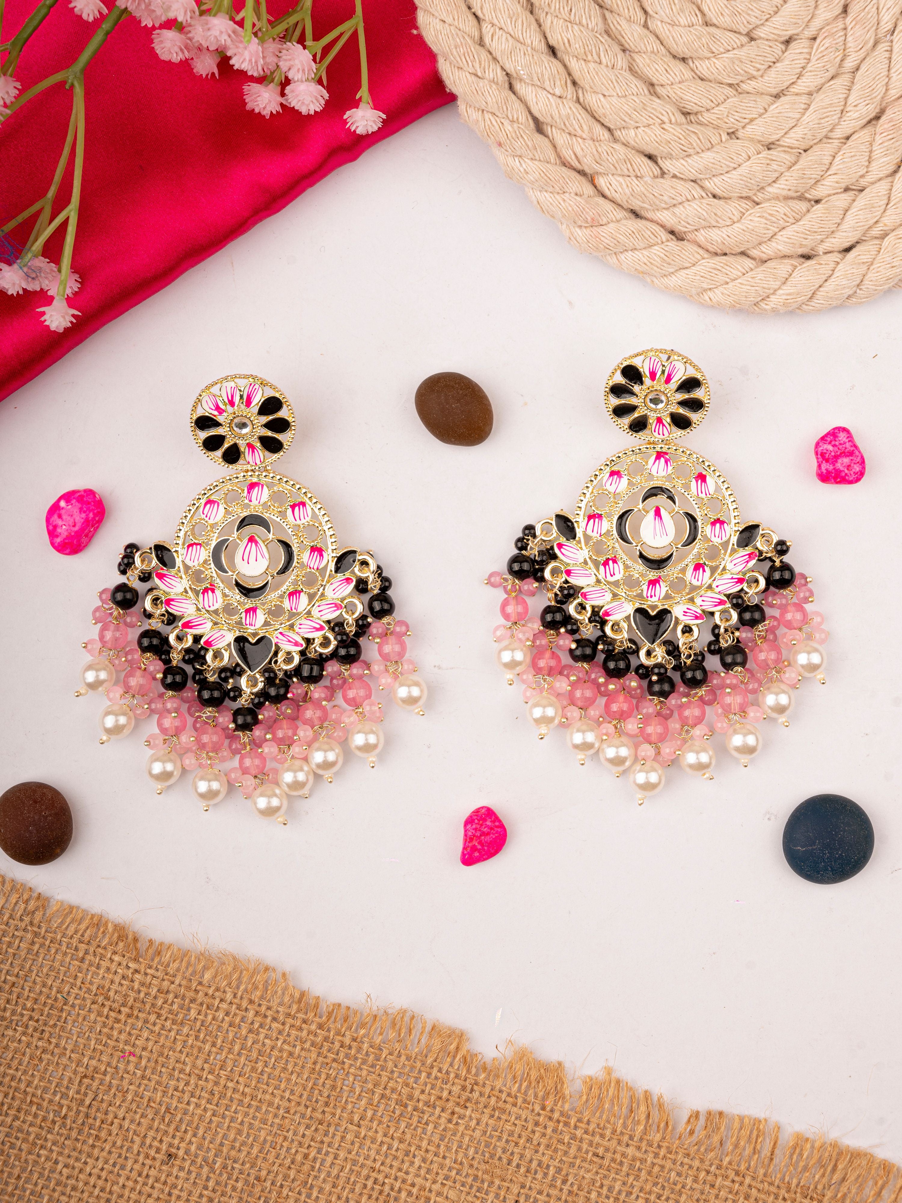 Gold Plated Chandbali Jhumka Earrings with Black-Pink Meenakari Work & Kundan-Pearl Drops