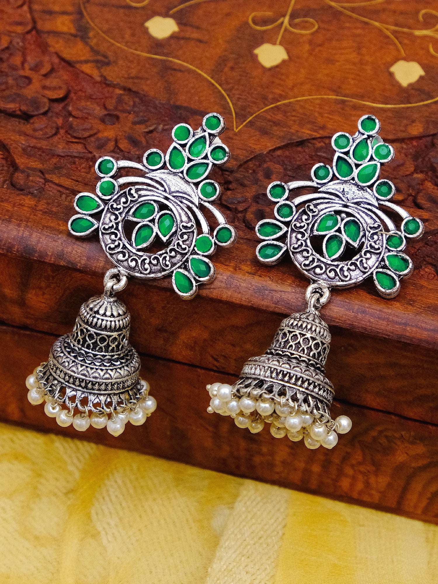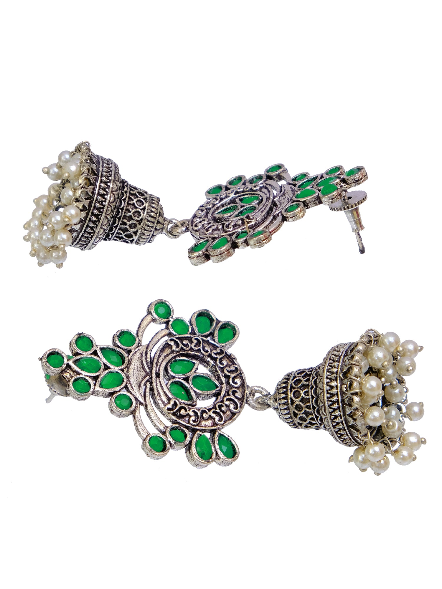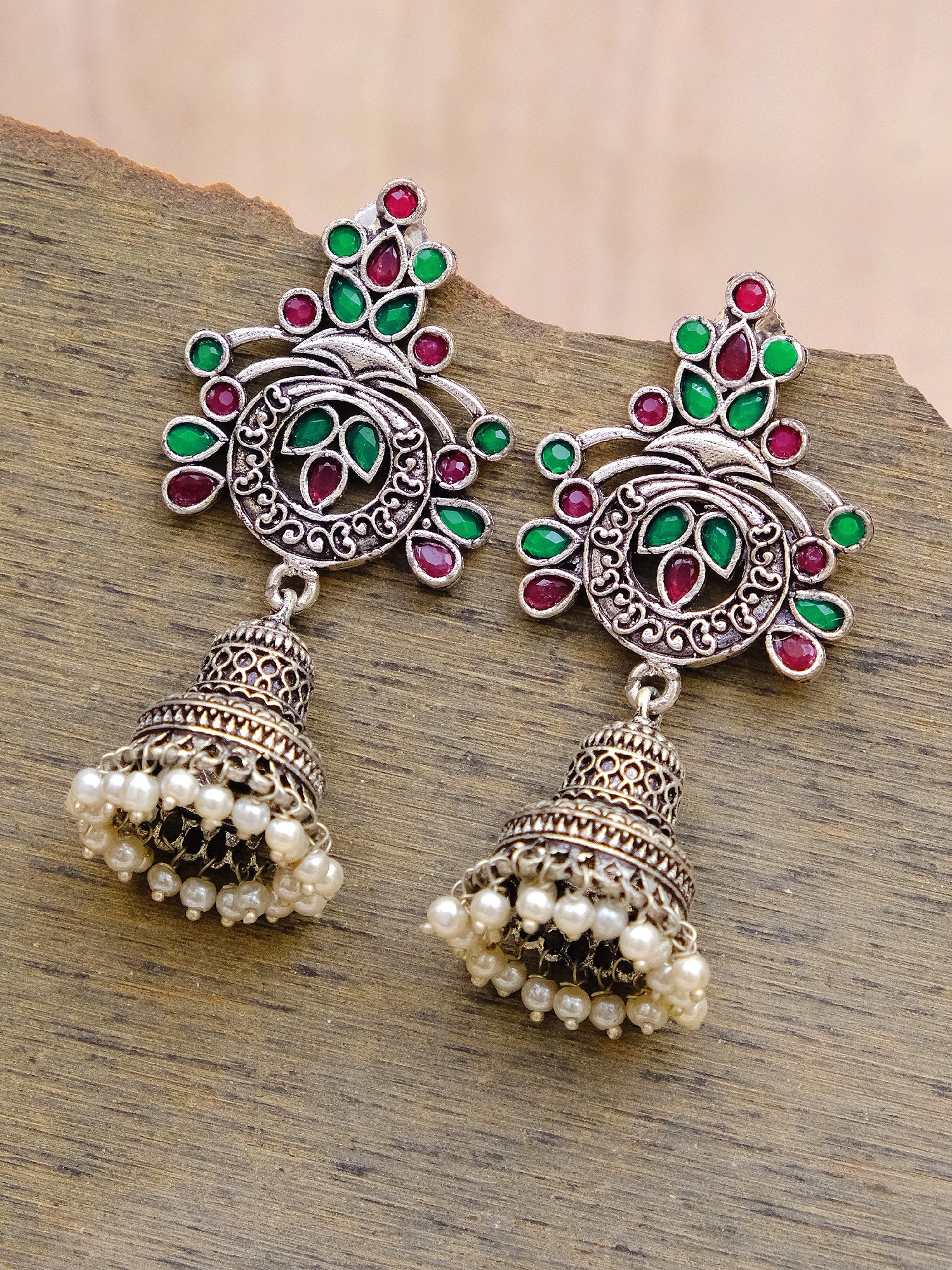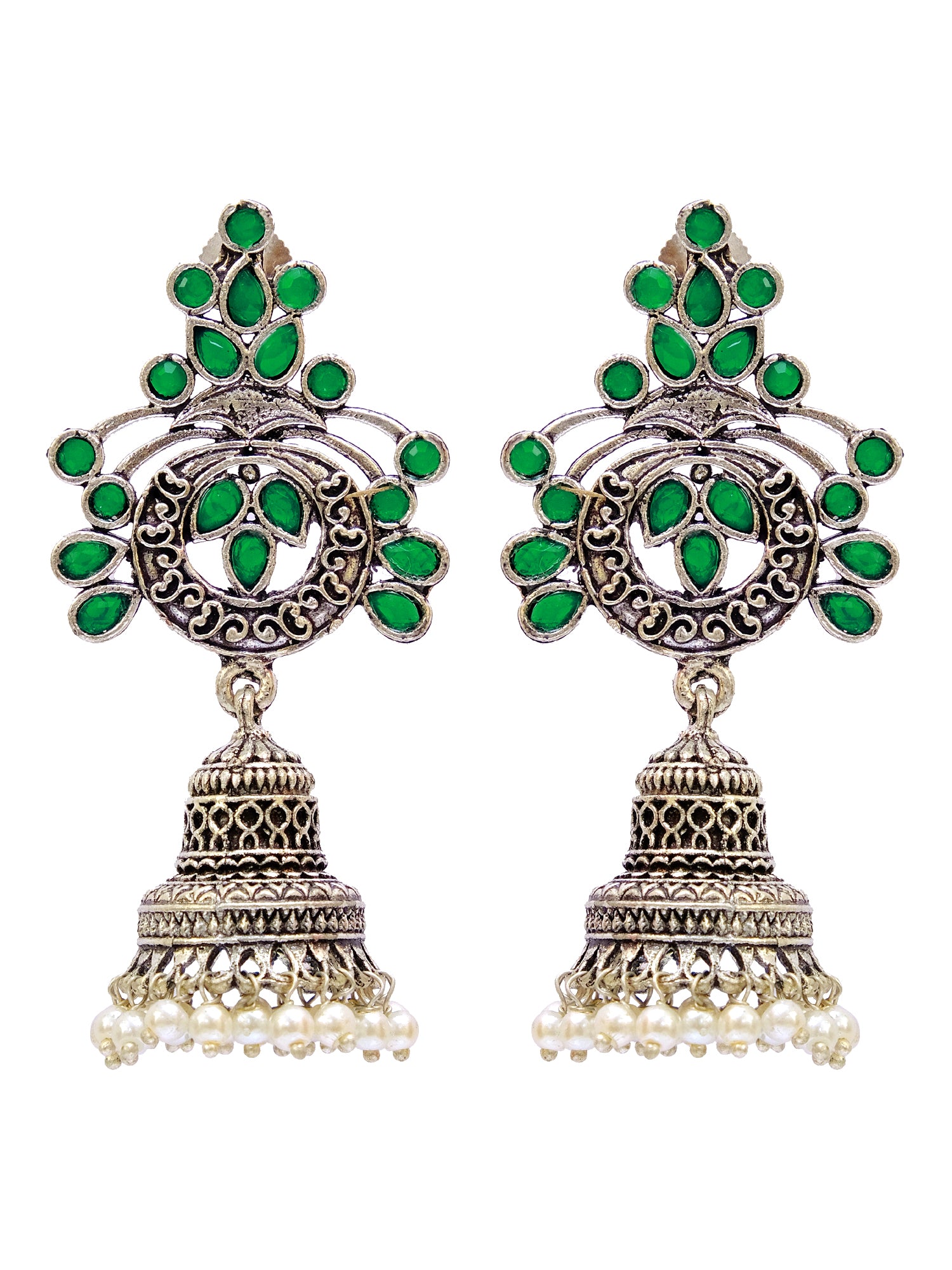 Oxidised German Silver Meenakri Floral Jhumka Earrings with Pearls for Women