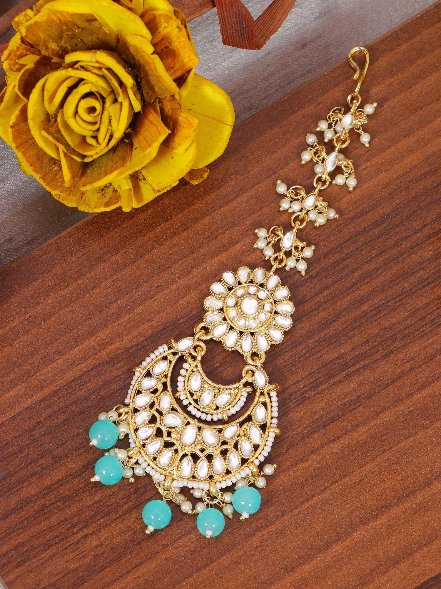 Kundan Studded Aqua Blue Drops Party Wear Maang Tikka for Women