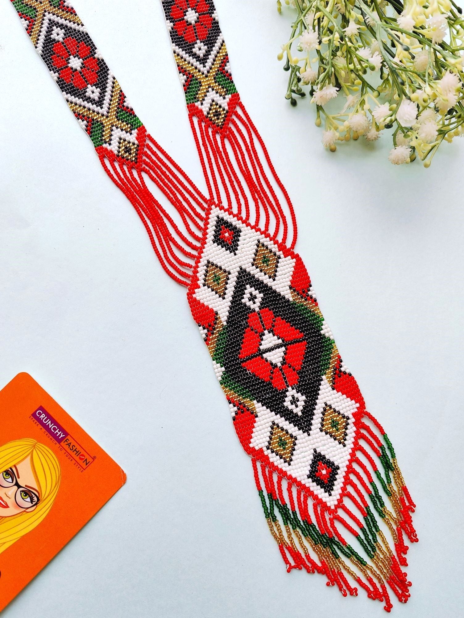 Handcrafted Radiant Red & White Long Boho Beaded Necklace