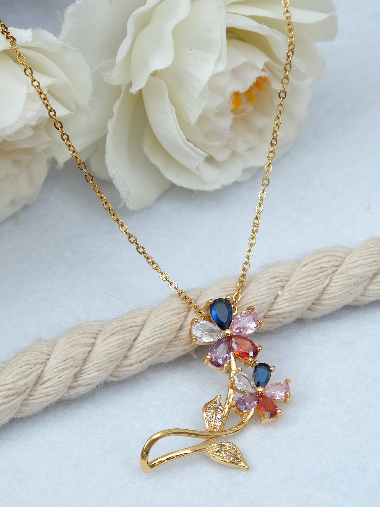 Eternal Glow Navaratna Crystals Floral Pendant Chain Necklace for Women | Anti-Tarnish & Water Proof