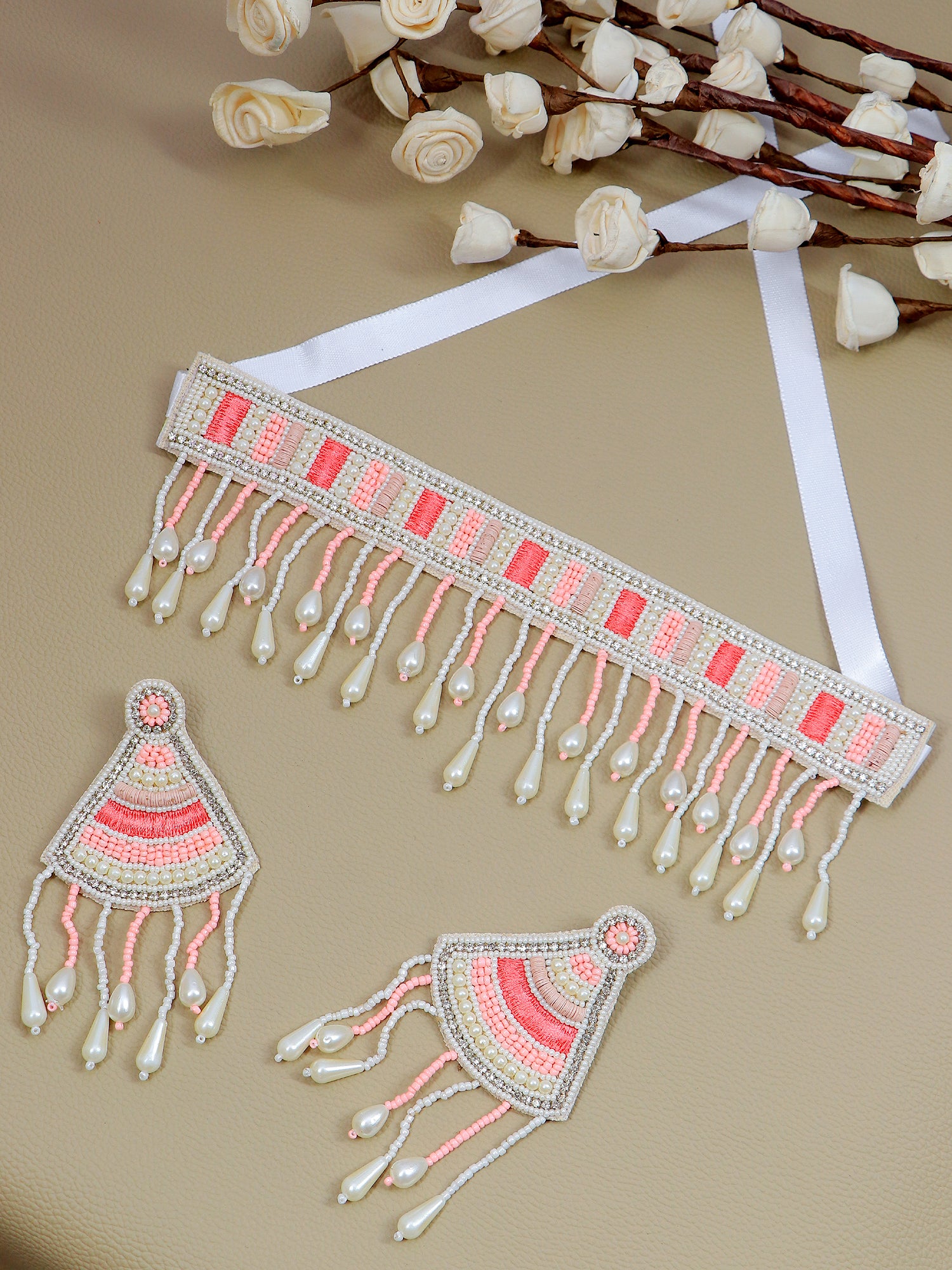 Gulizar Choker Necklace Set  - Pink Handmade Beaded Necklace and Earrings Jewellery Set