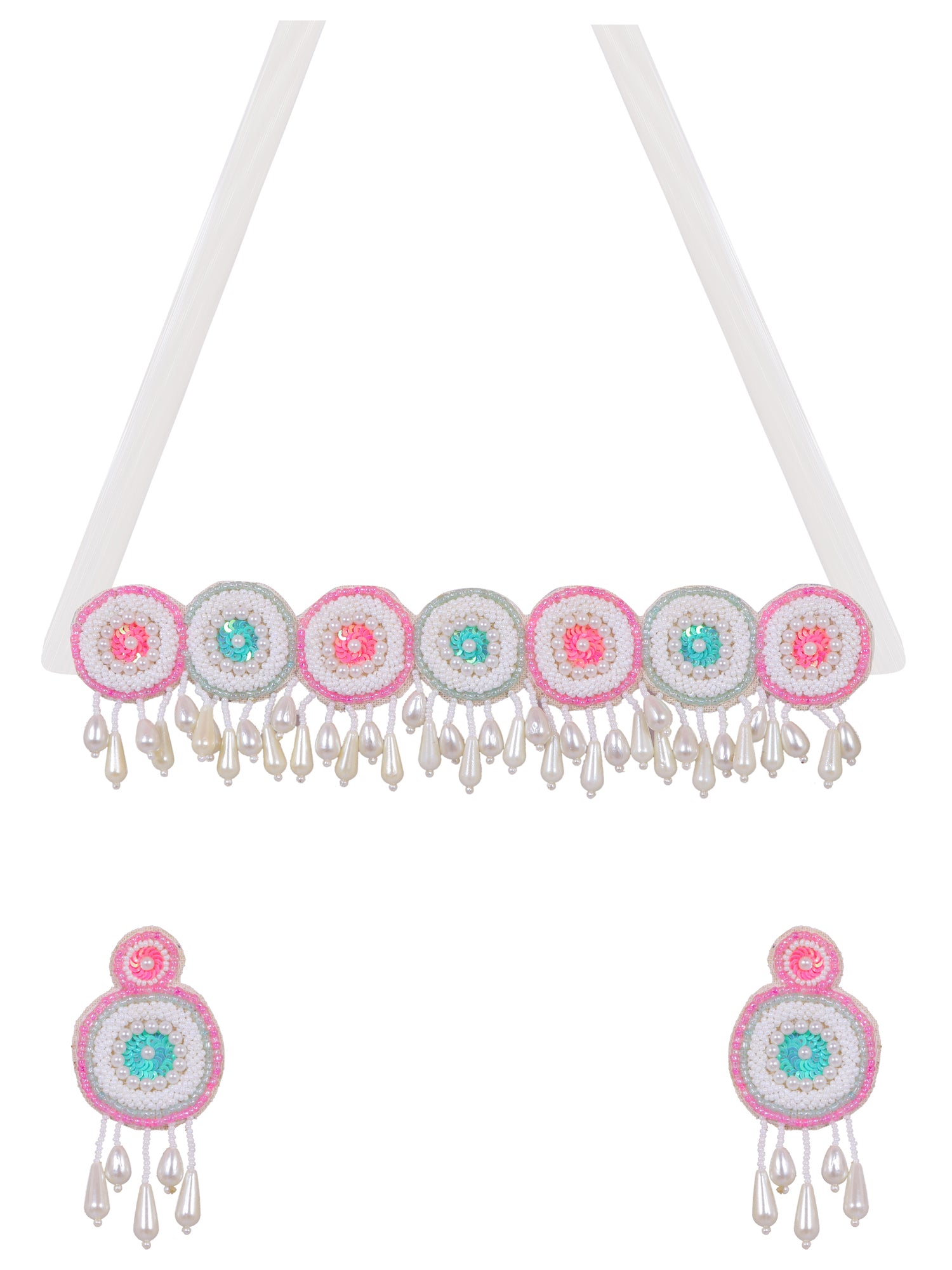 Bahaar Bliss: Handmade Pink & Turquoise Beaded Choker Necklace and Earring Set
