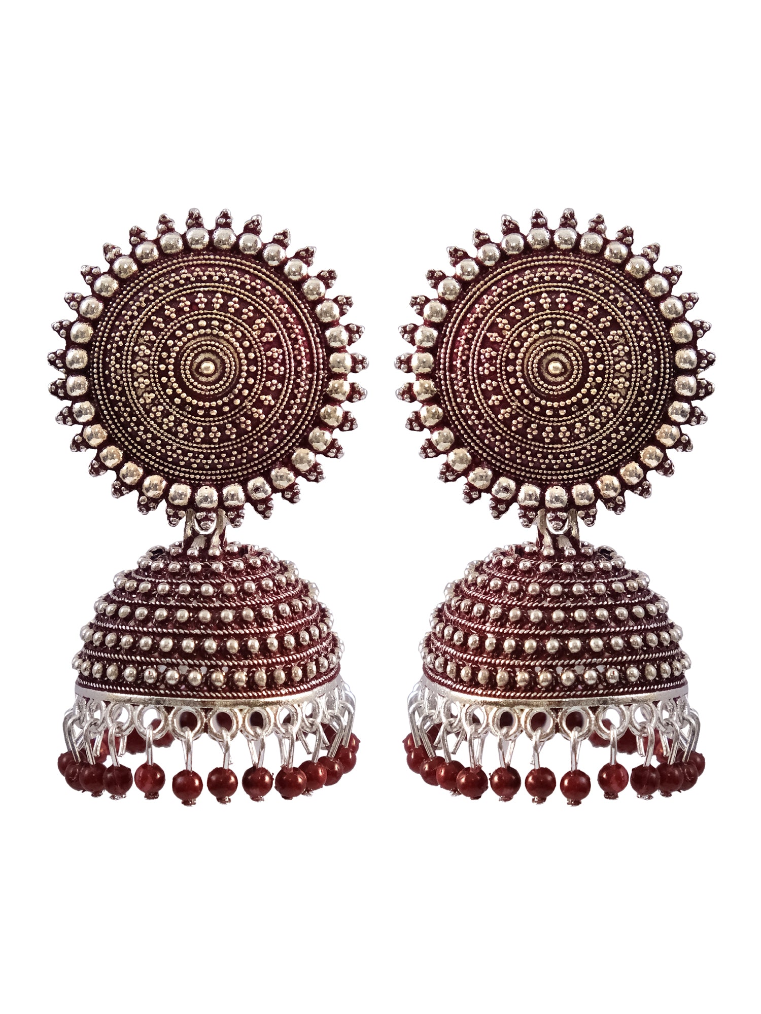 - New Design Oxidized German Silver Maroon Jhumka Earrings Set for Women