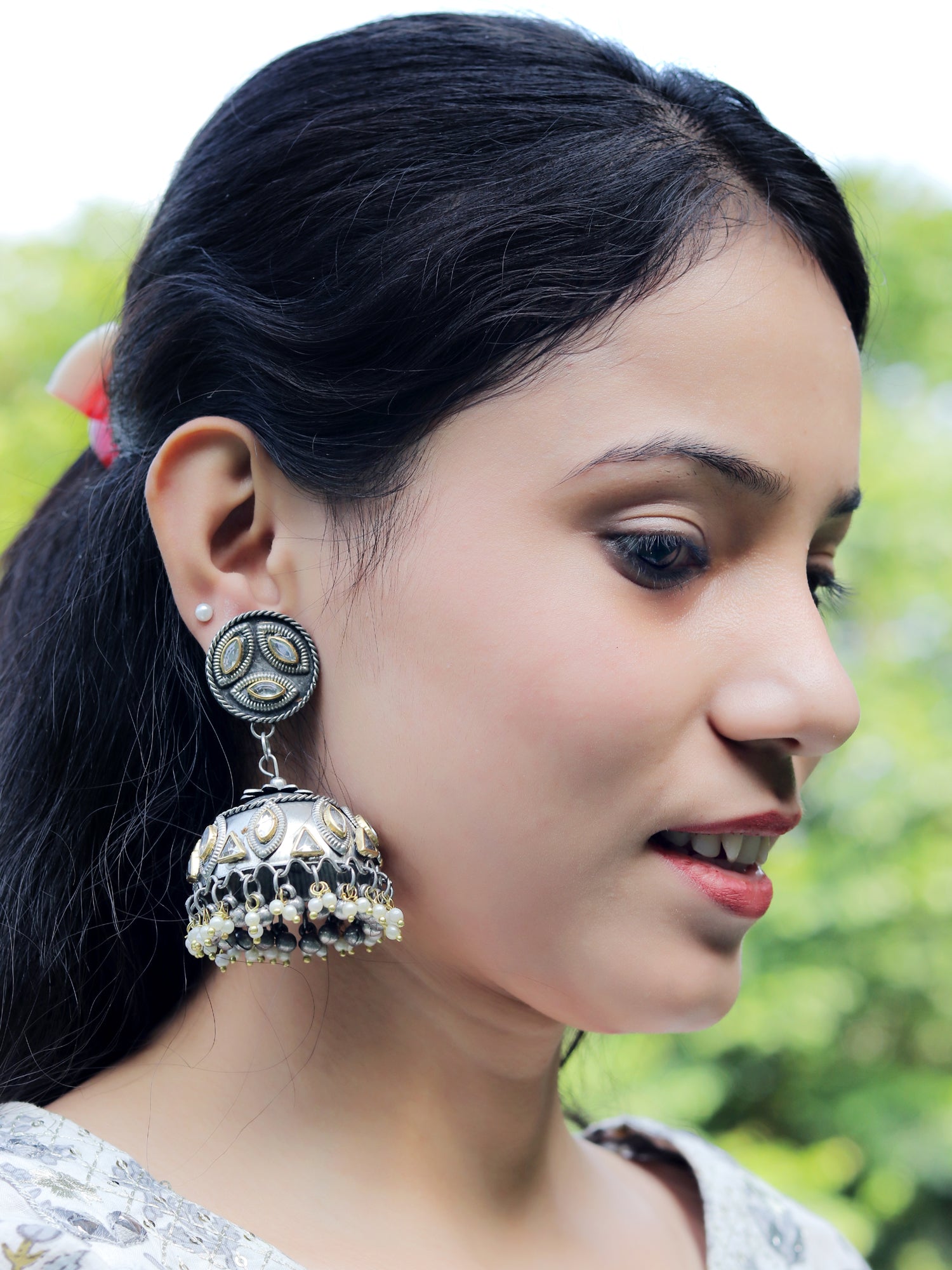 Falak Oxidised Silver Jhumka Earrings for Girls and Women- Boho Fashion Kundan Studded Jhumka Earrings for Girls