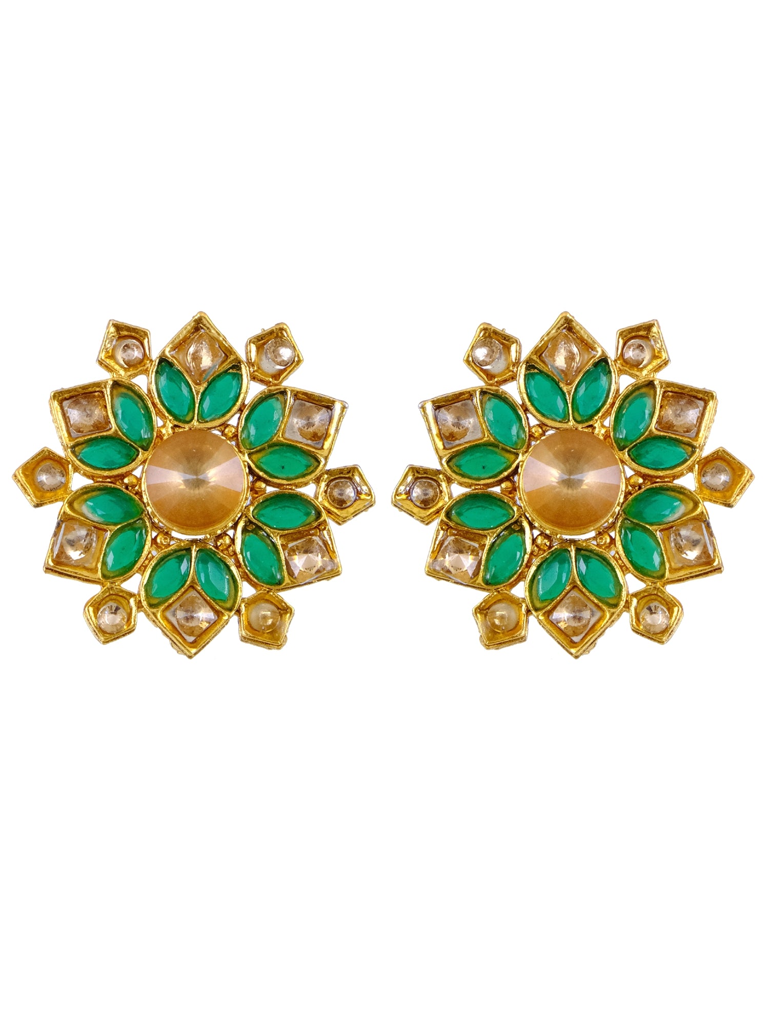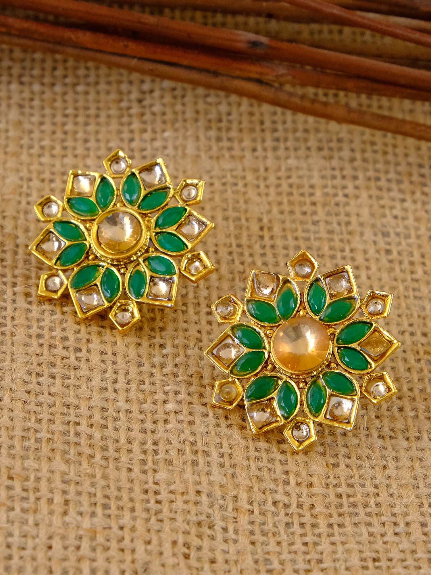 Gleaming Gold-Plated Green Kundan Flower Stud Earrings