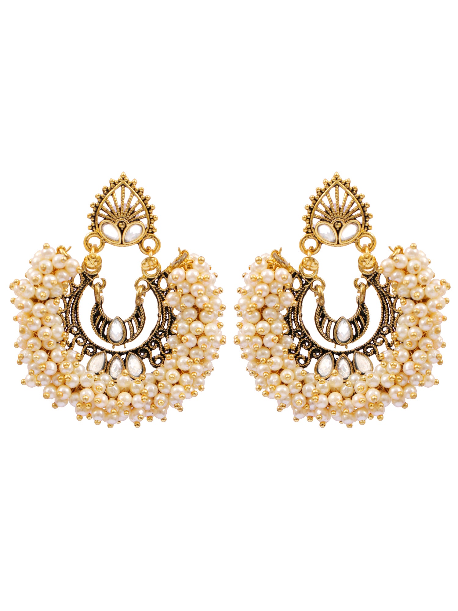 Women's Gold Plated Oxidised Chandbali Earrings with White Pearls and Kundan Stones