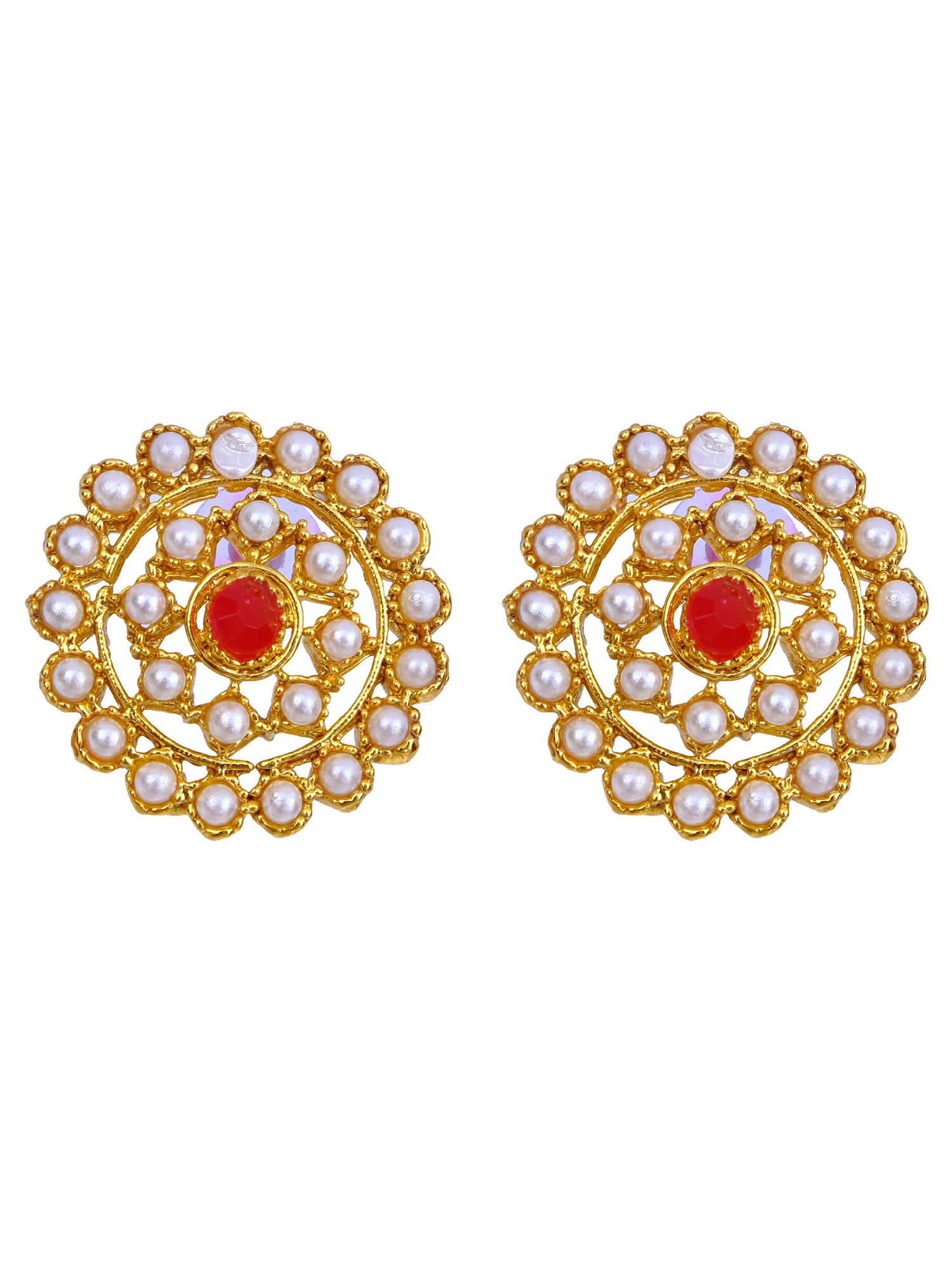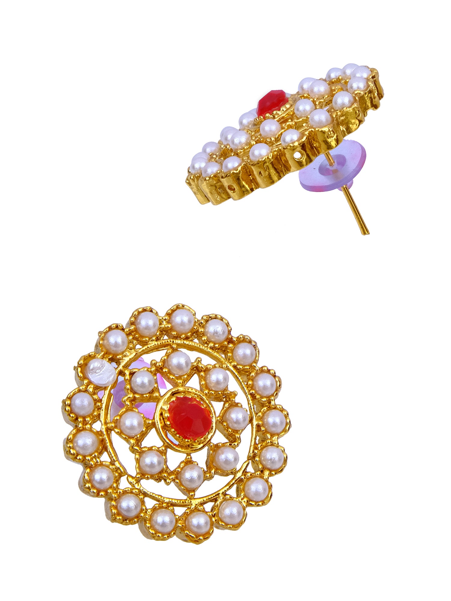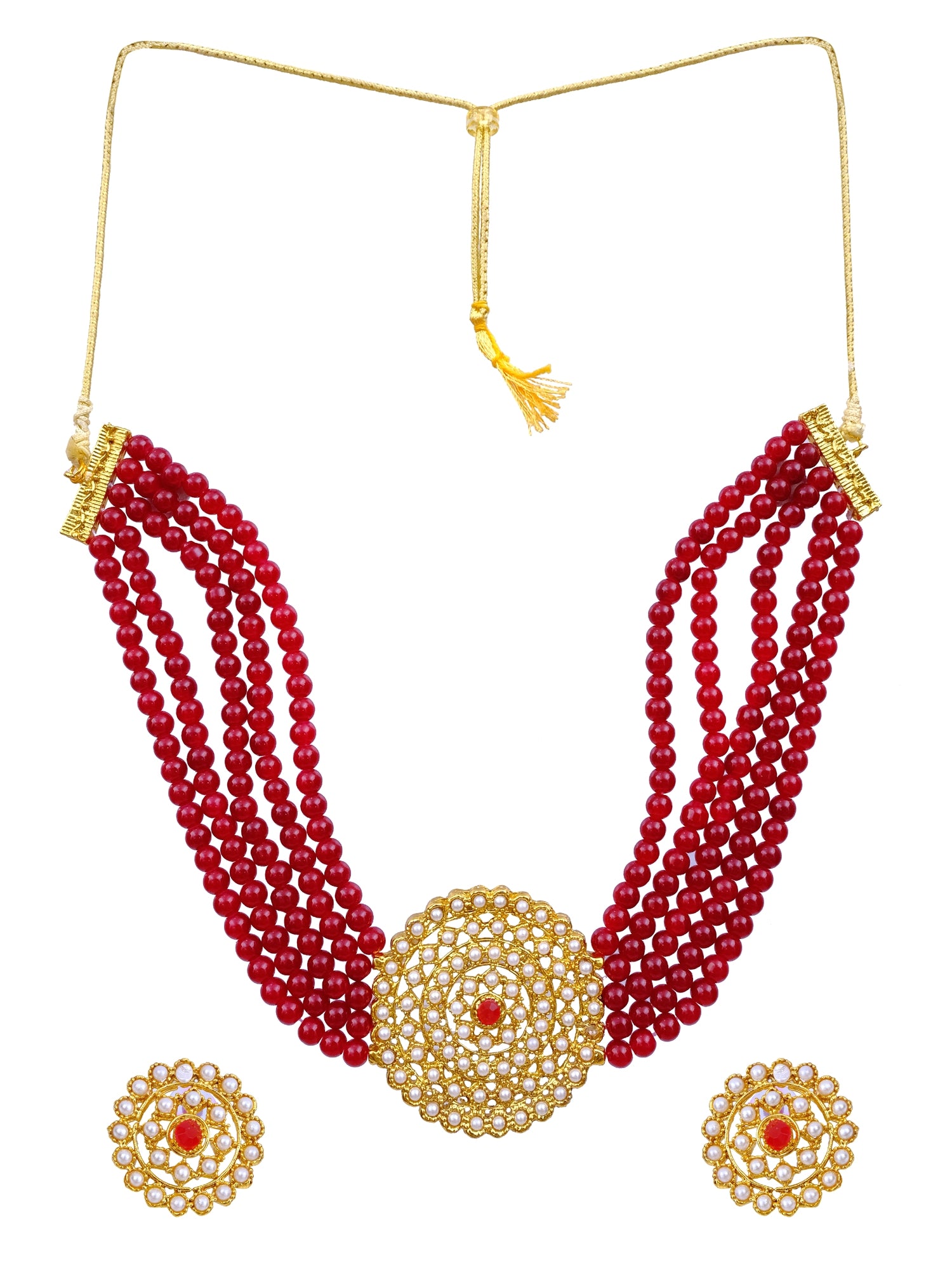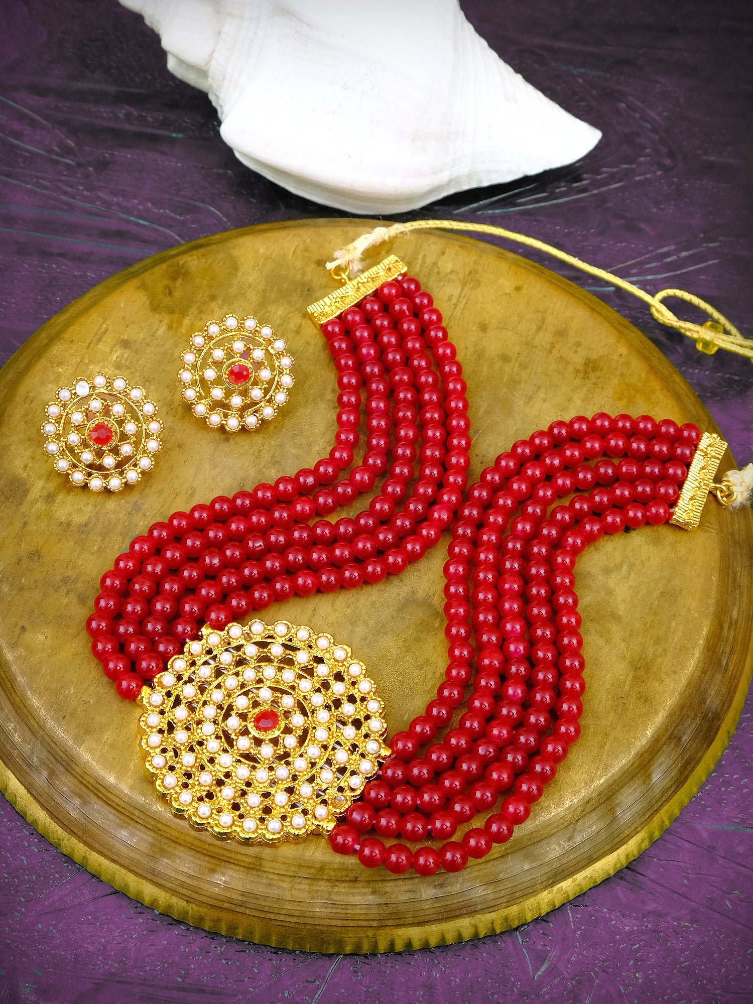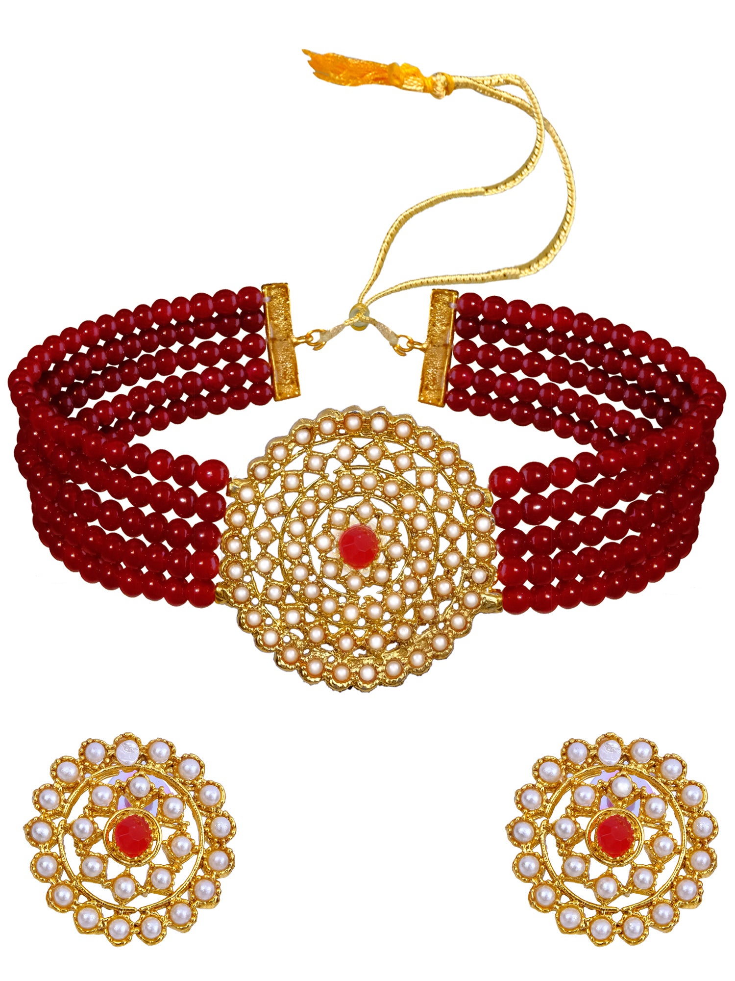 Red-Gold Pearl Choker and Earrings Set - Bridal Necklace Set with Moti Necklace Designs