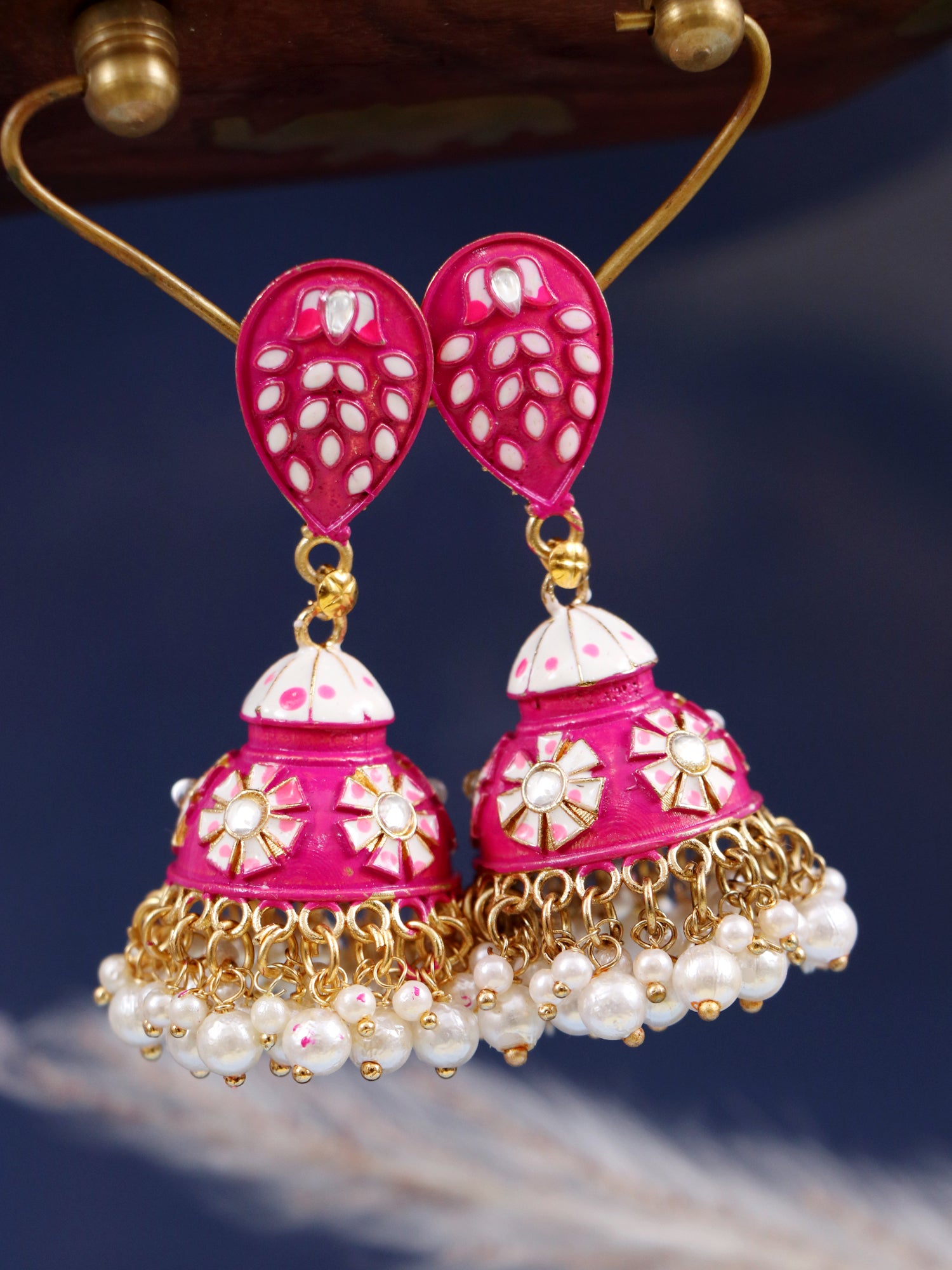 Pink, gold-plated, white pearl and cowrie shell jewellery set with flower design for women's festive occasions