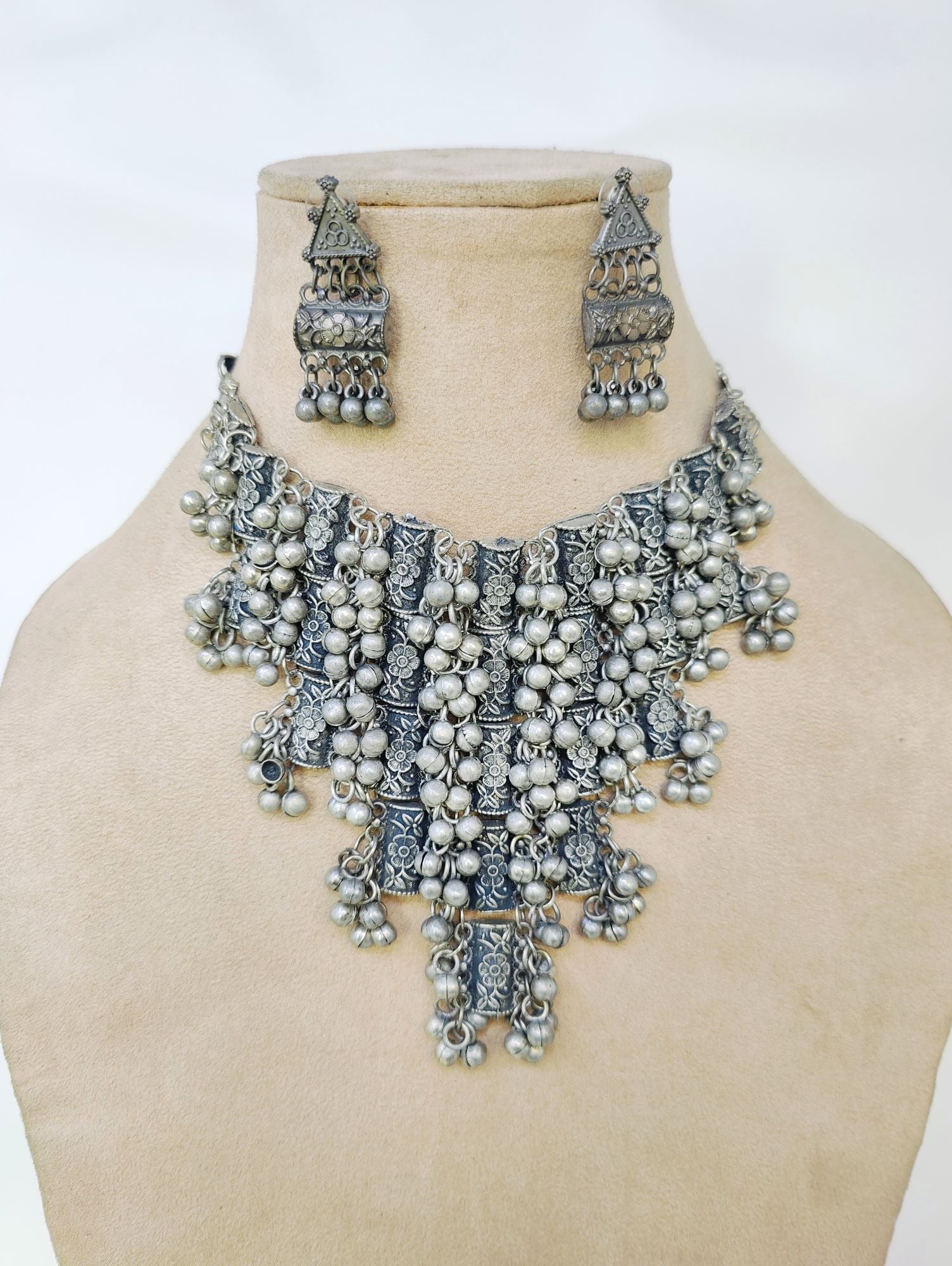 Afghan Boho Charm Oxidized Silver Choker Jewelry Set for Women and Girls