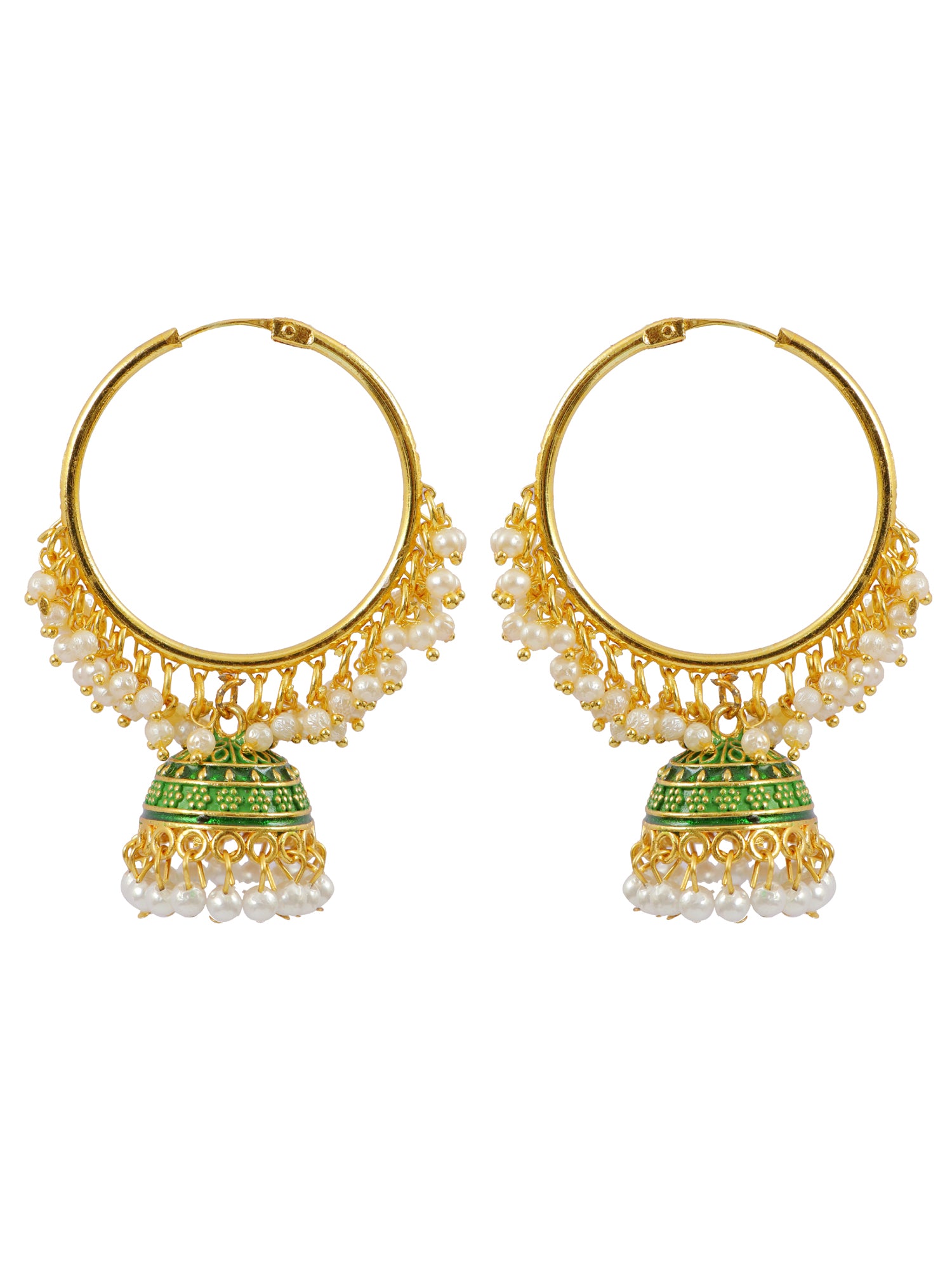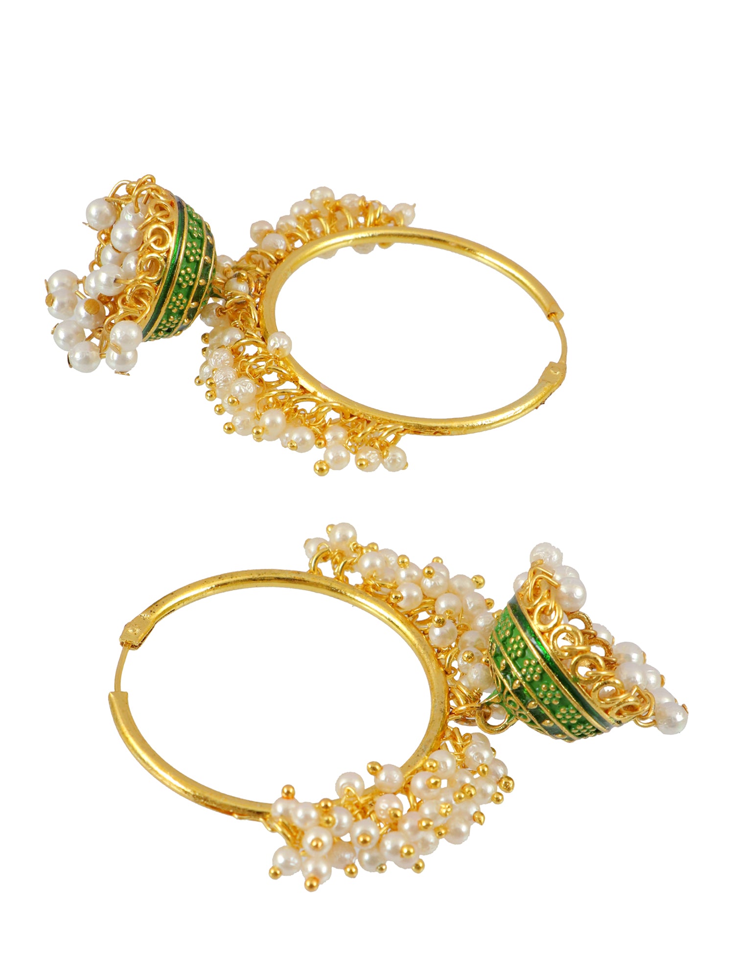 Ethnic Gold Plated Green Hoop Jhumka Earrings with Pearls for Women and Girls