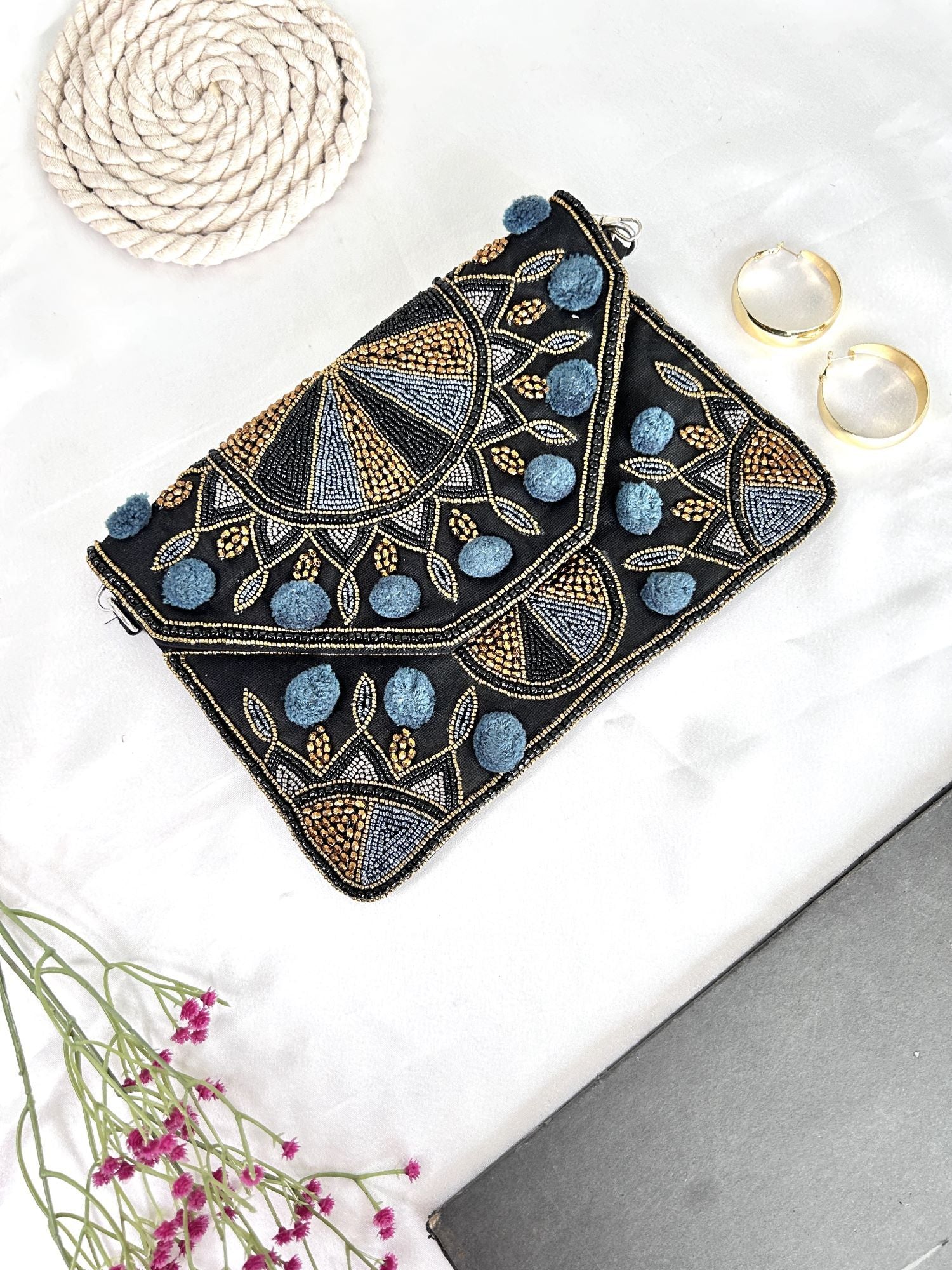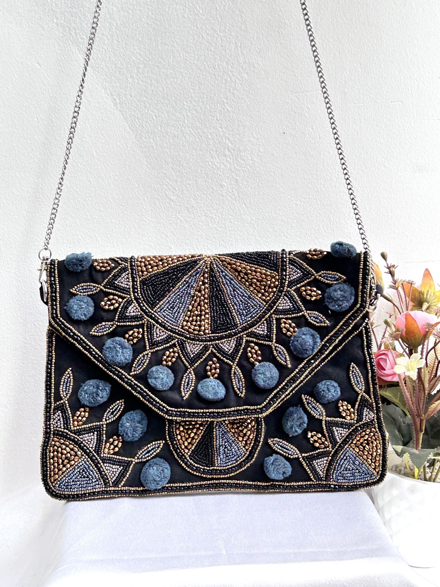Black-Grey Beaded Boho Fashion Handbag for Women & Girls