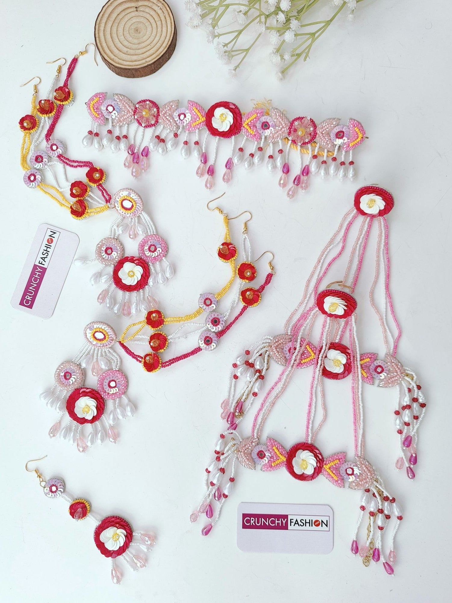 Kanika Haldi Jewellery Set- Pastel Pink-Green Necklac Full Necklace Set with Ear Chains