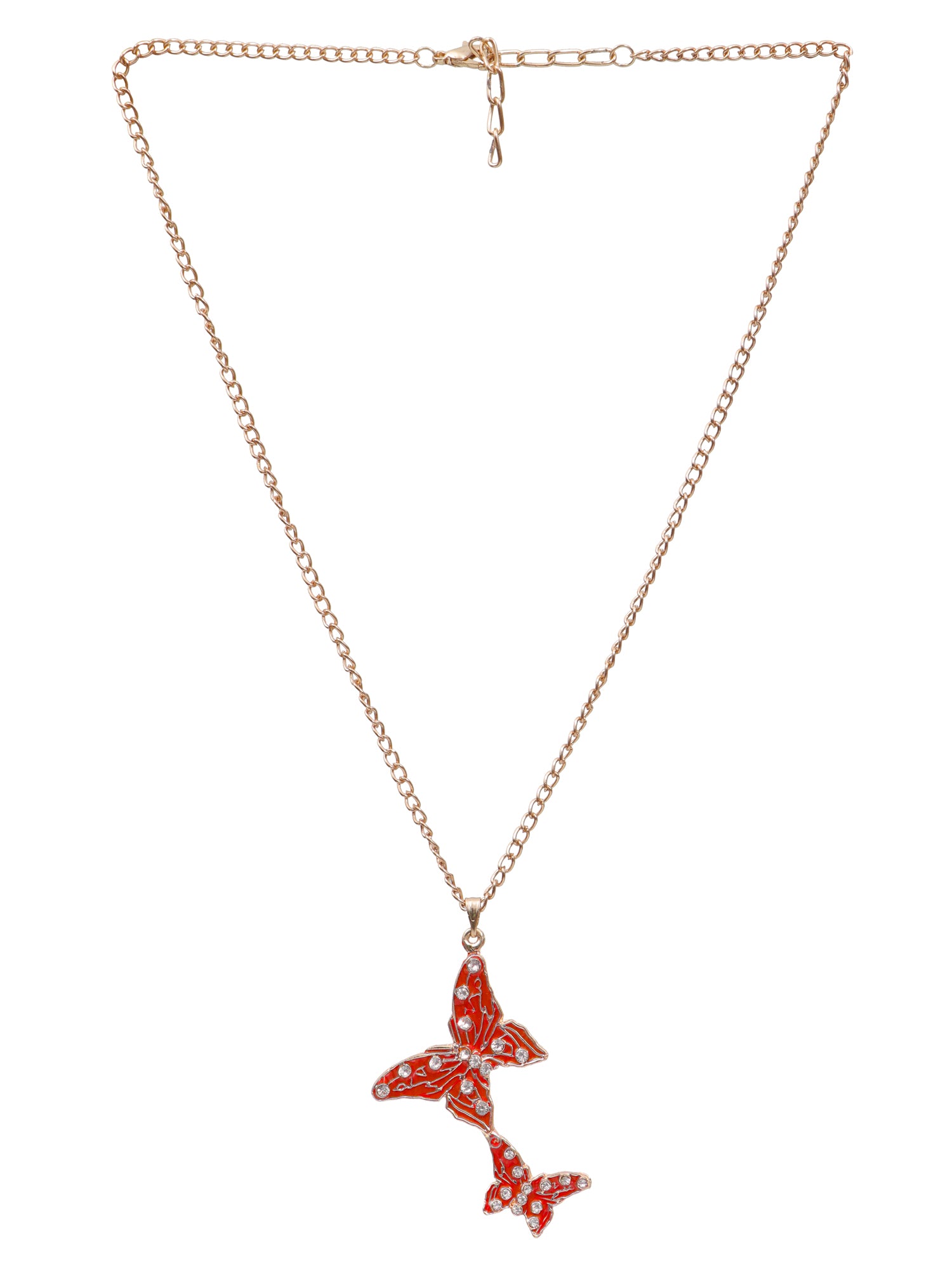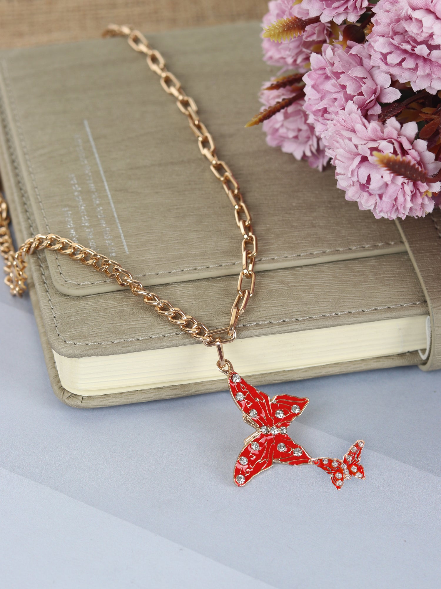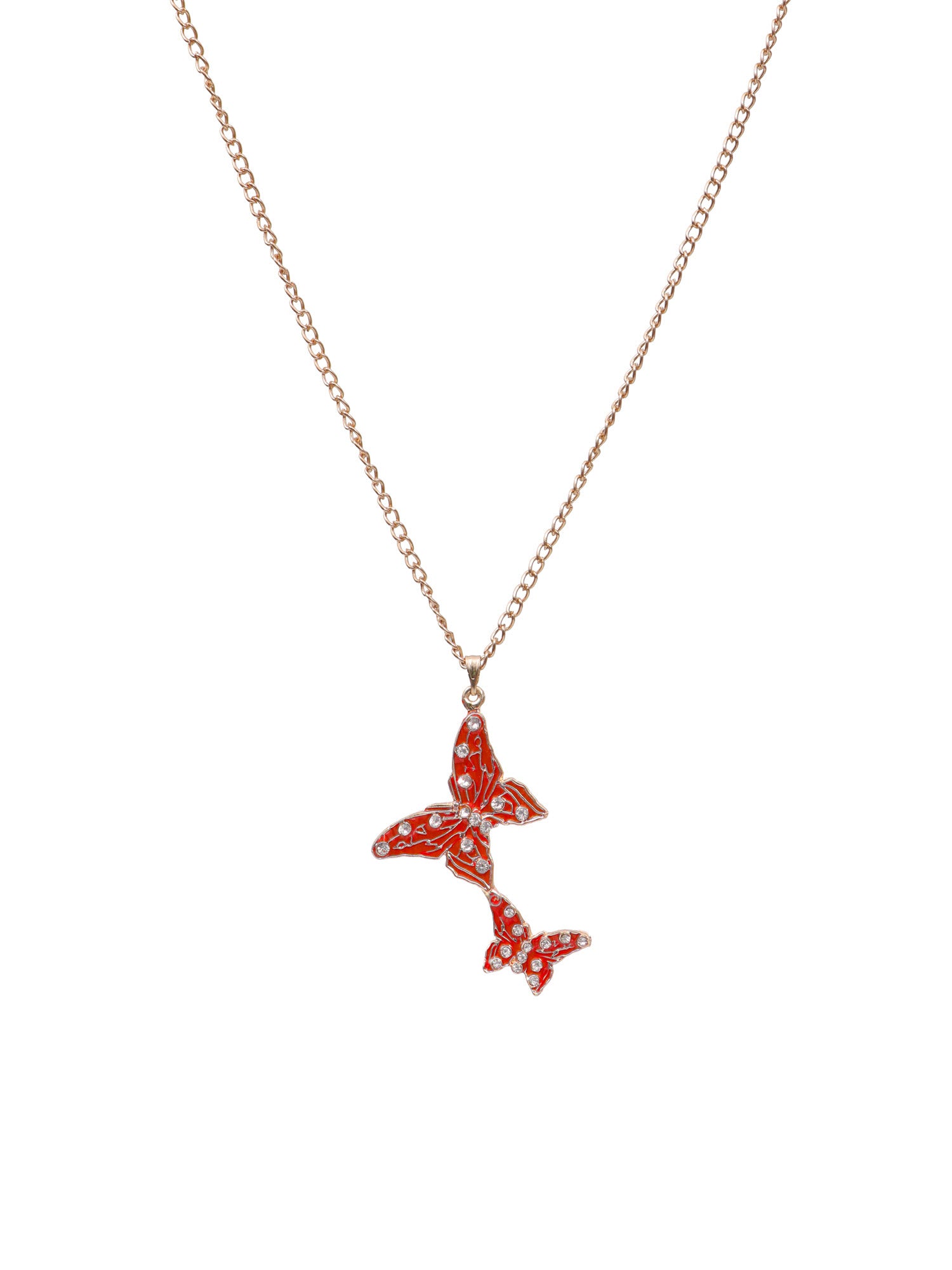 Introducing our beautiful Crystal Studded Pink Enameled Butterfly Pendant Necklace, the perfect statement piece for any occasion. This necklace features a delicate butterfly pendant, crafted from high-quality metal and coated with a layer of pink enamel for a smooth, glossy finish. The butterfly is adorned with sparkling crystals that add an extra touch of elegance and shine. The pendant is suspended from a delicate silver-plated chain that adds a touch of elegance to the piece. The chain is adjustable to fit any neck size, making it a great fit for anyone. The combination of the pink enamel, crystals, and the butterfly shape give it a unique and elegant appeal that will never go out of style. This necklace is perfect for adding a touch of luxury to your everyday look or as a special gift for loved ones. It's lightweight and comfortable to wear, making it a perfect addition to your jewelry collection.