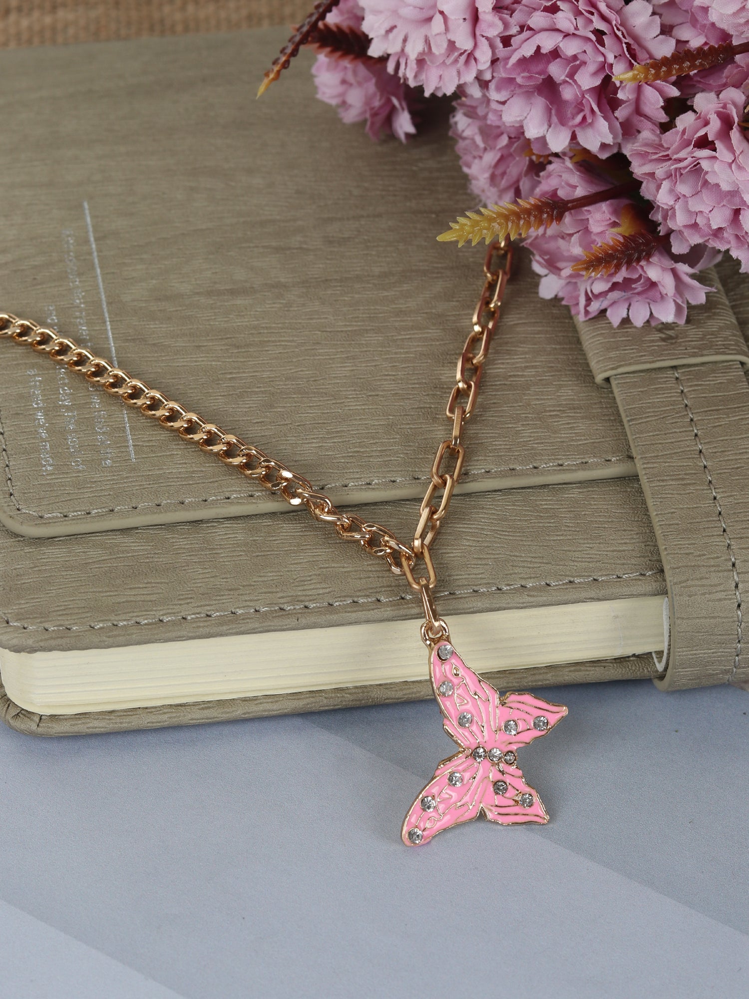 Introduce our stunning Crystal Studded Enameled Butterfly Pendant Necklace, a perfect statement piece for any occasion. The necklace features a delicate butterfly pendant crafted from high-quality metal and coated with pink enamel for a smooth finish. The butterfly is adorned with sparkling crystals adding an extra touch of elegance. Suspended from a delicate silver-plated chain, adjustable to fit any neck size. The unique and elegant appeal of this necklace is perfect for any occasion whether it's a casual or formal event. Lightweight and comfortable to wear, an ideal gift for loved ones or as a treat for yourself.
