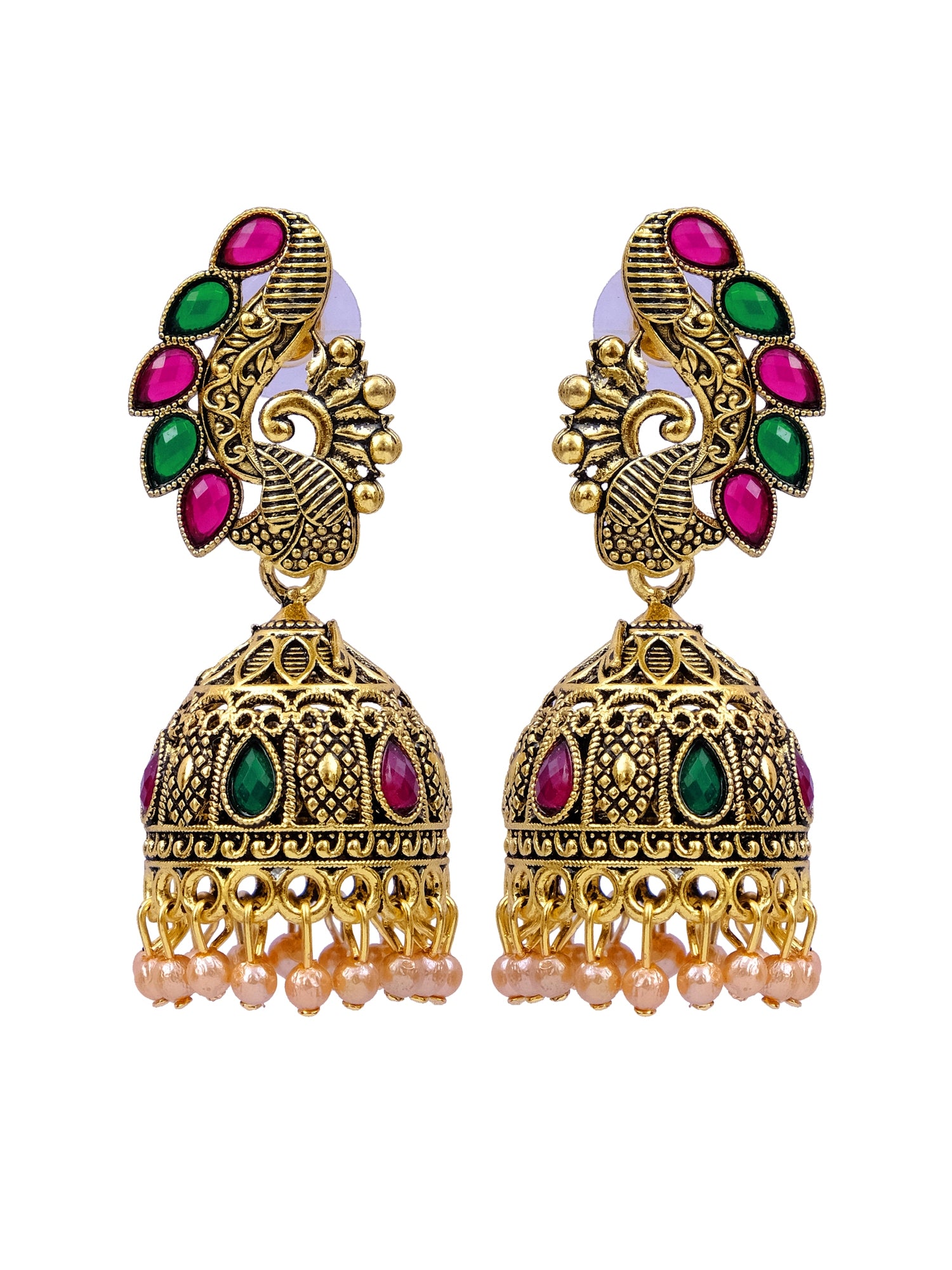 Women's Multicolor Peacock Jhumka Gold Earrings with Pearl Adornments