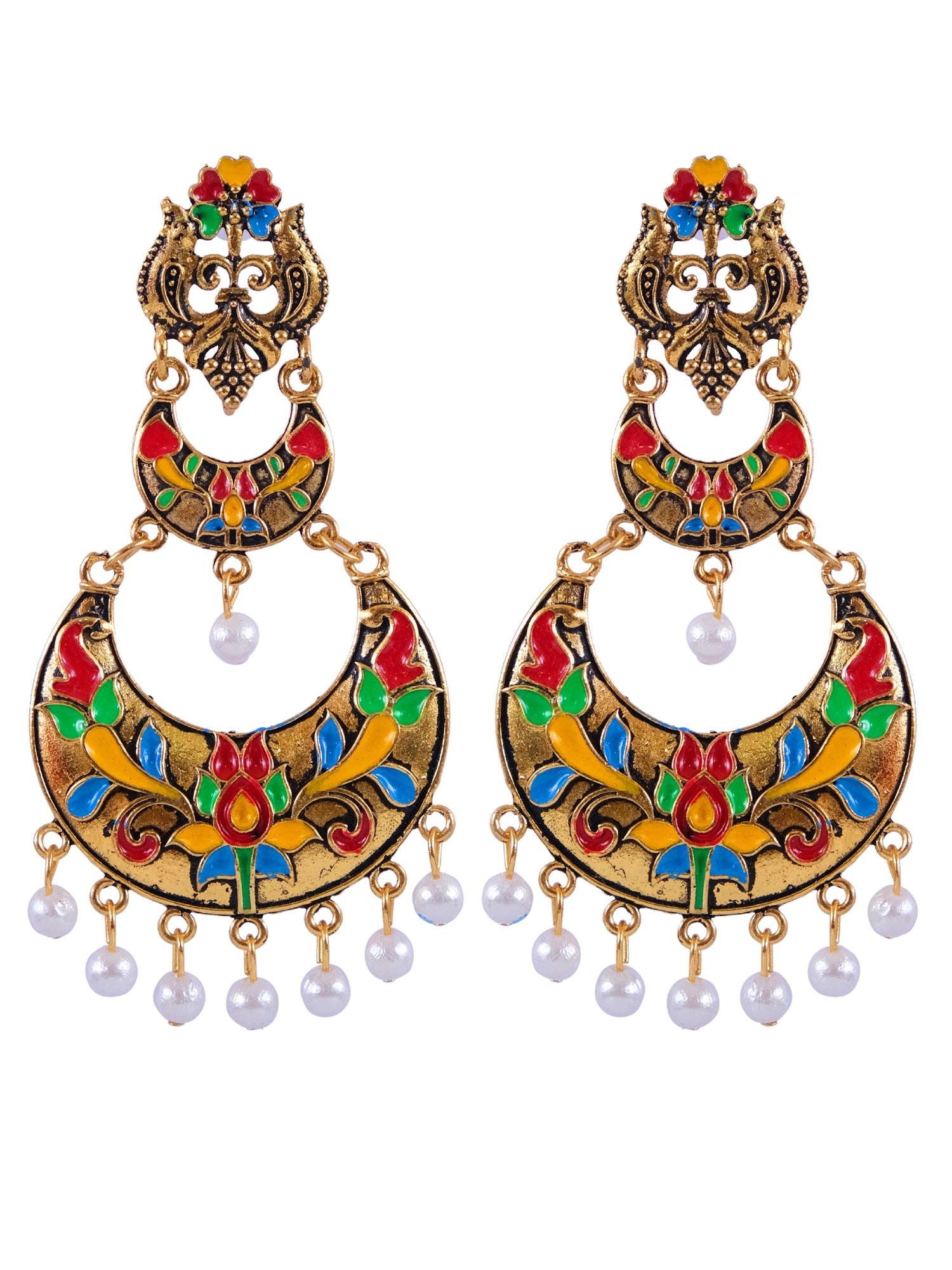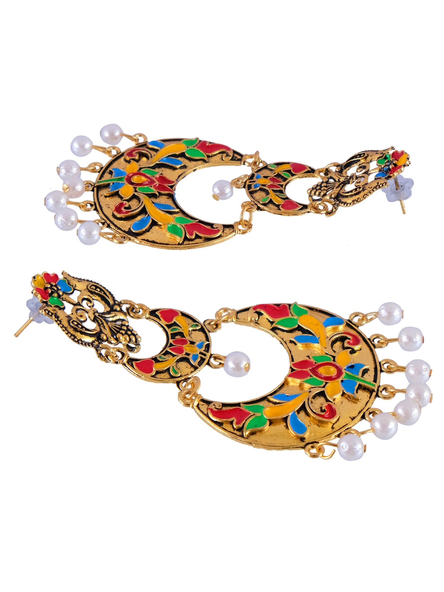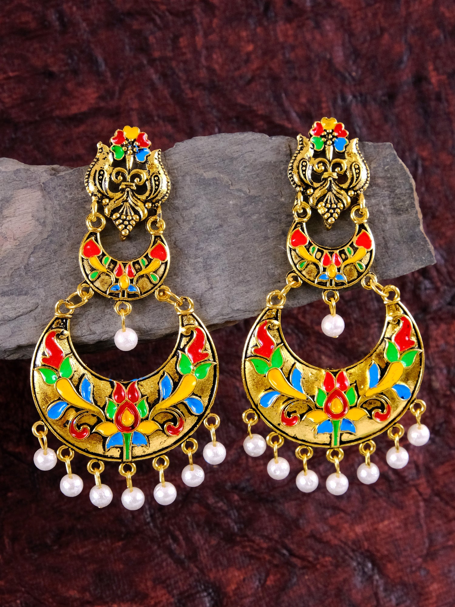 Traditional Gold-Plated Earrings For Women - Long Danglers with Multicolor Oxidised Meenakari Chandbali Design