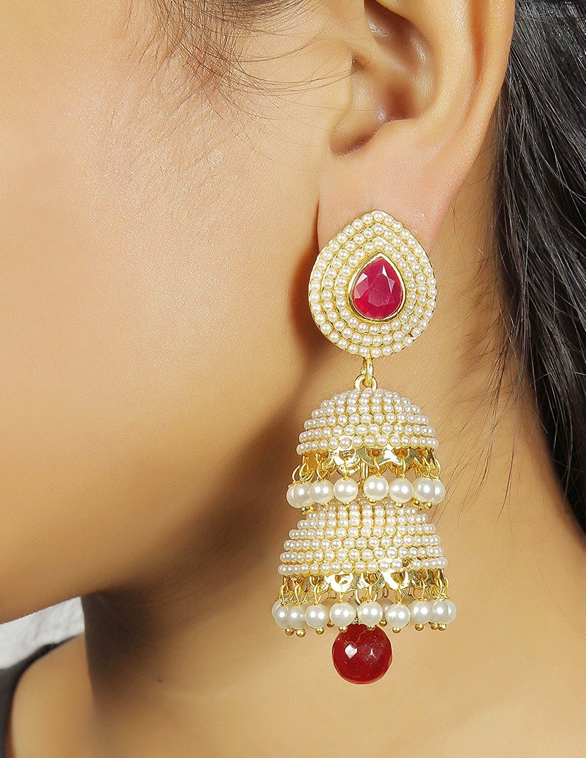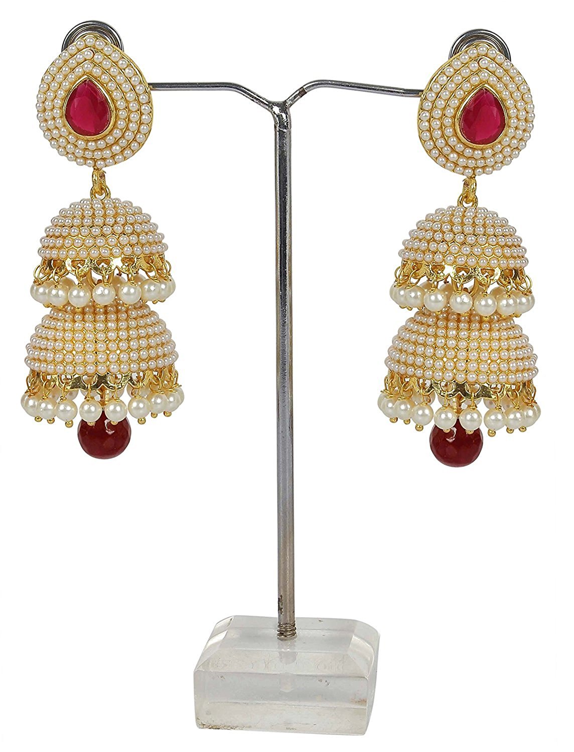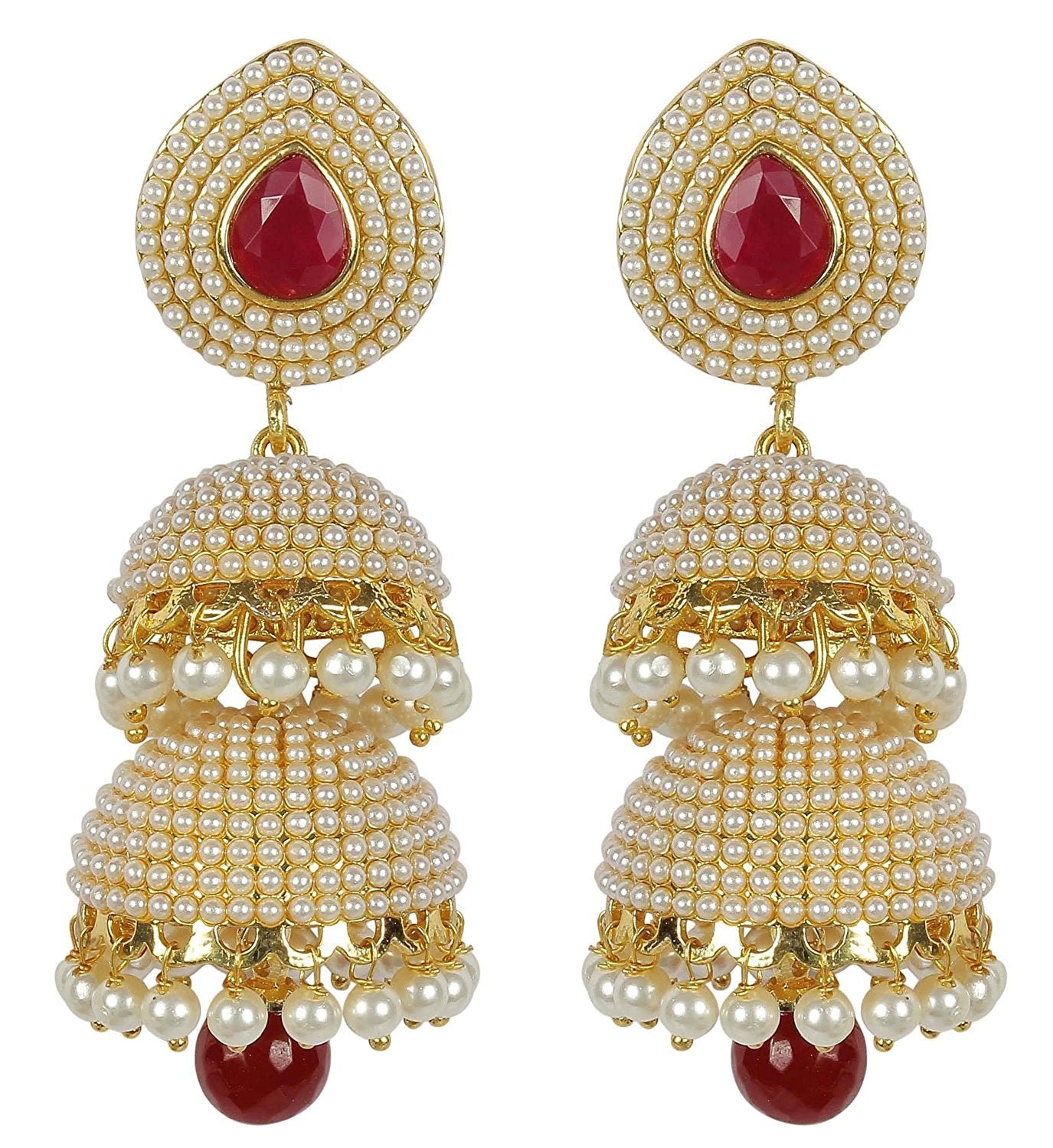 White Pearls Jhumka Earrings with Red Drop for Women & Girls