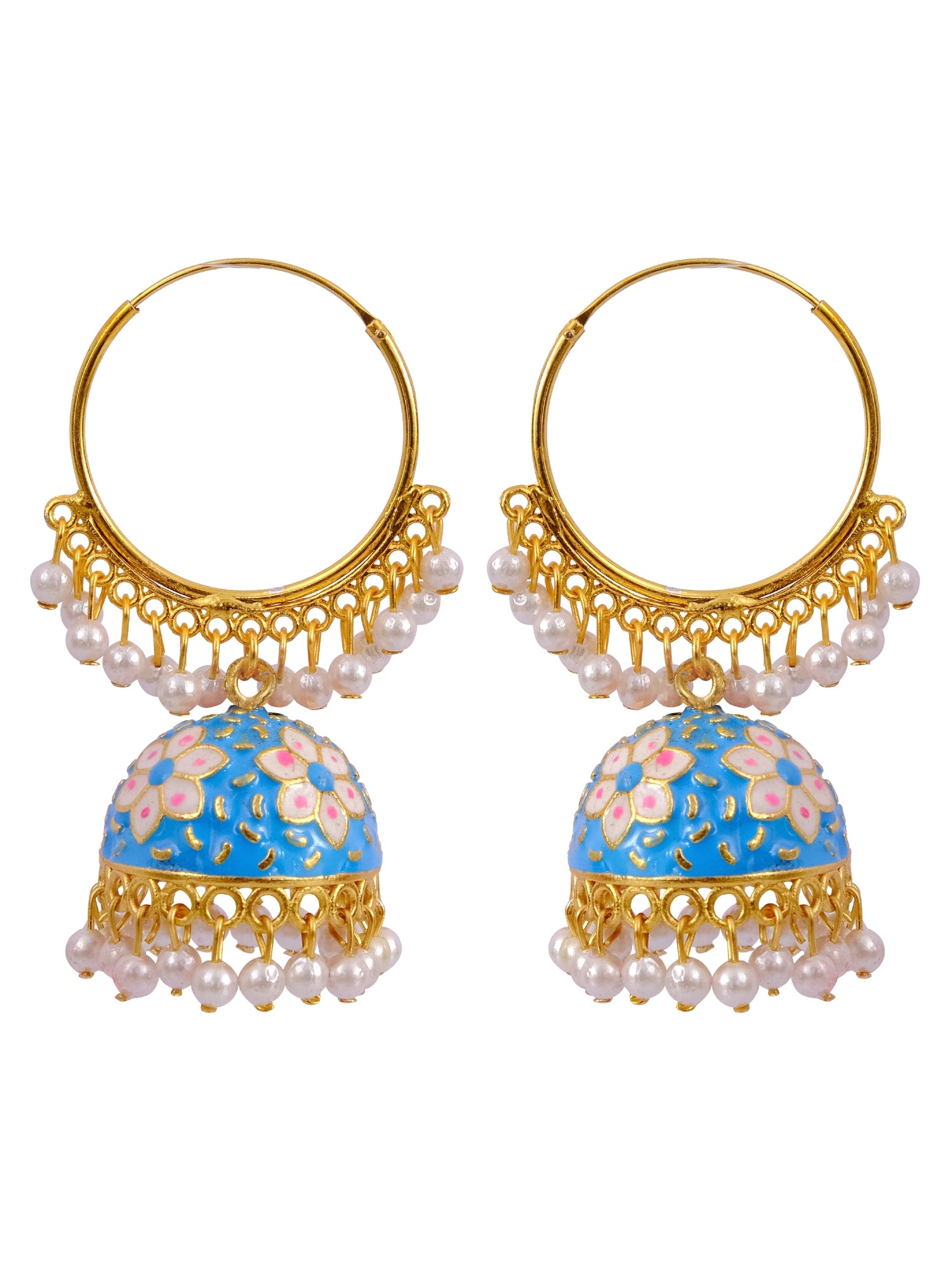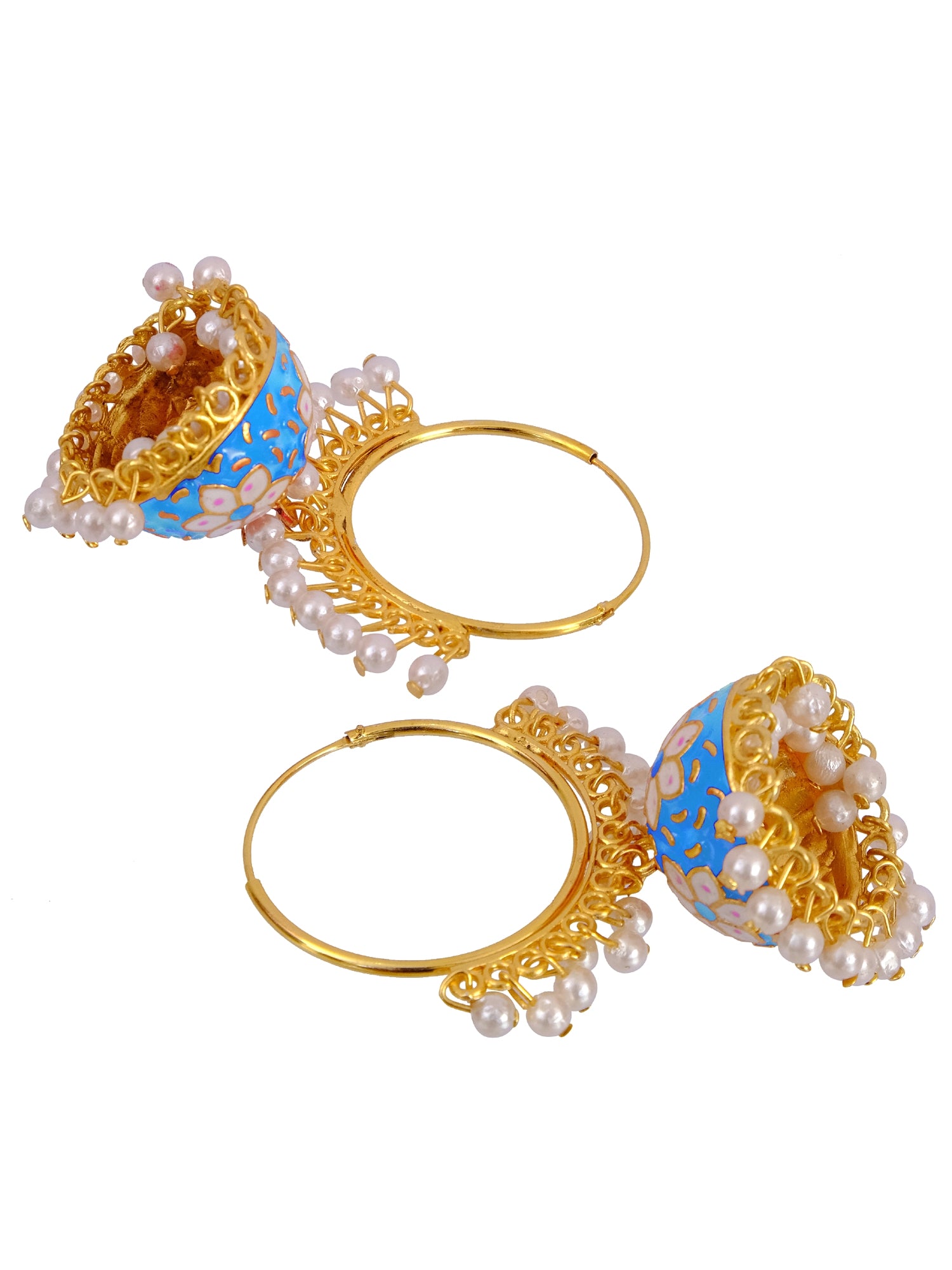 Gold plated Kundan Flower Meenakari Blue Hoop Jhumka Earrings With White Pearl Earrings RAE0860
