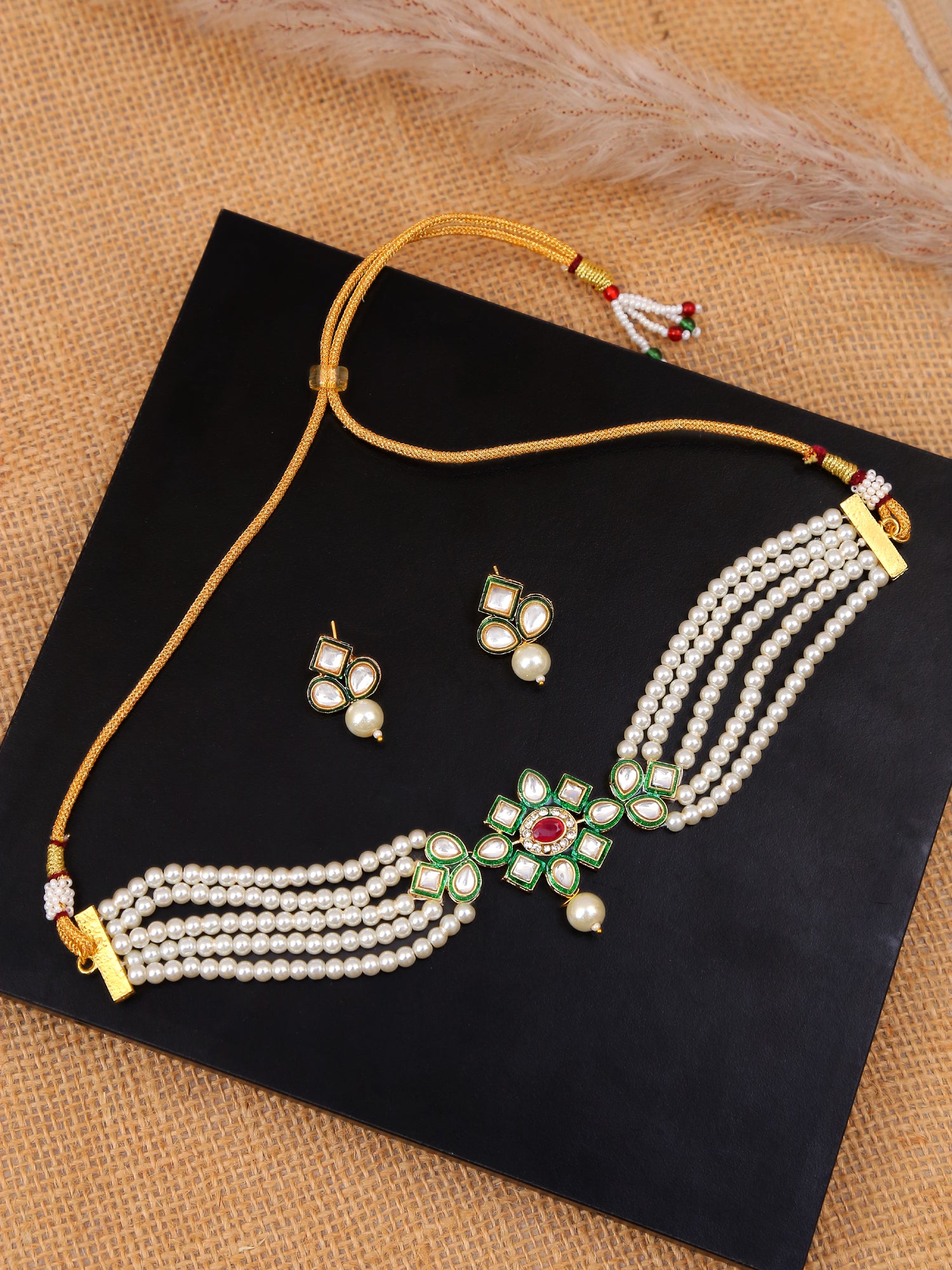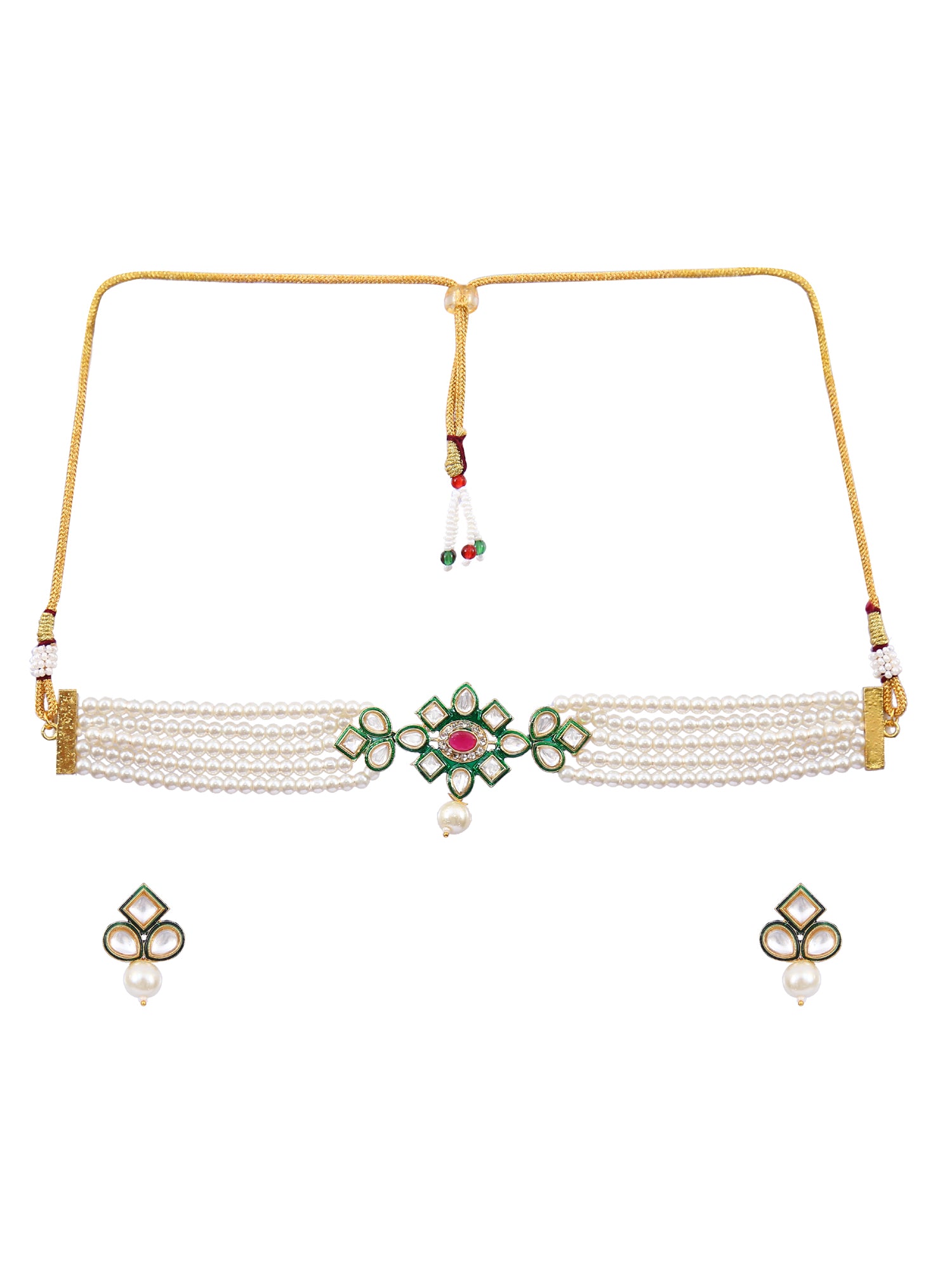 - Gold-Plated White Pearl Kundan Choker Necklace & Earrings Set RAS0408