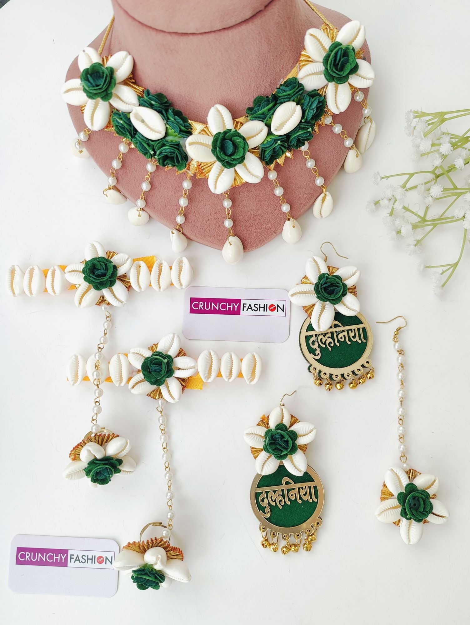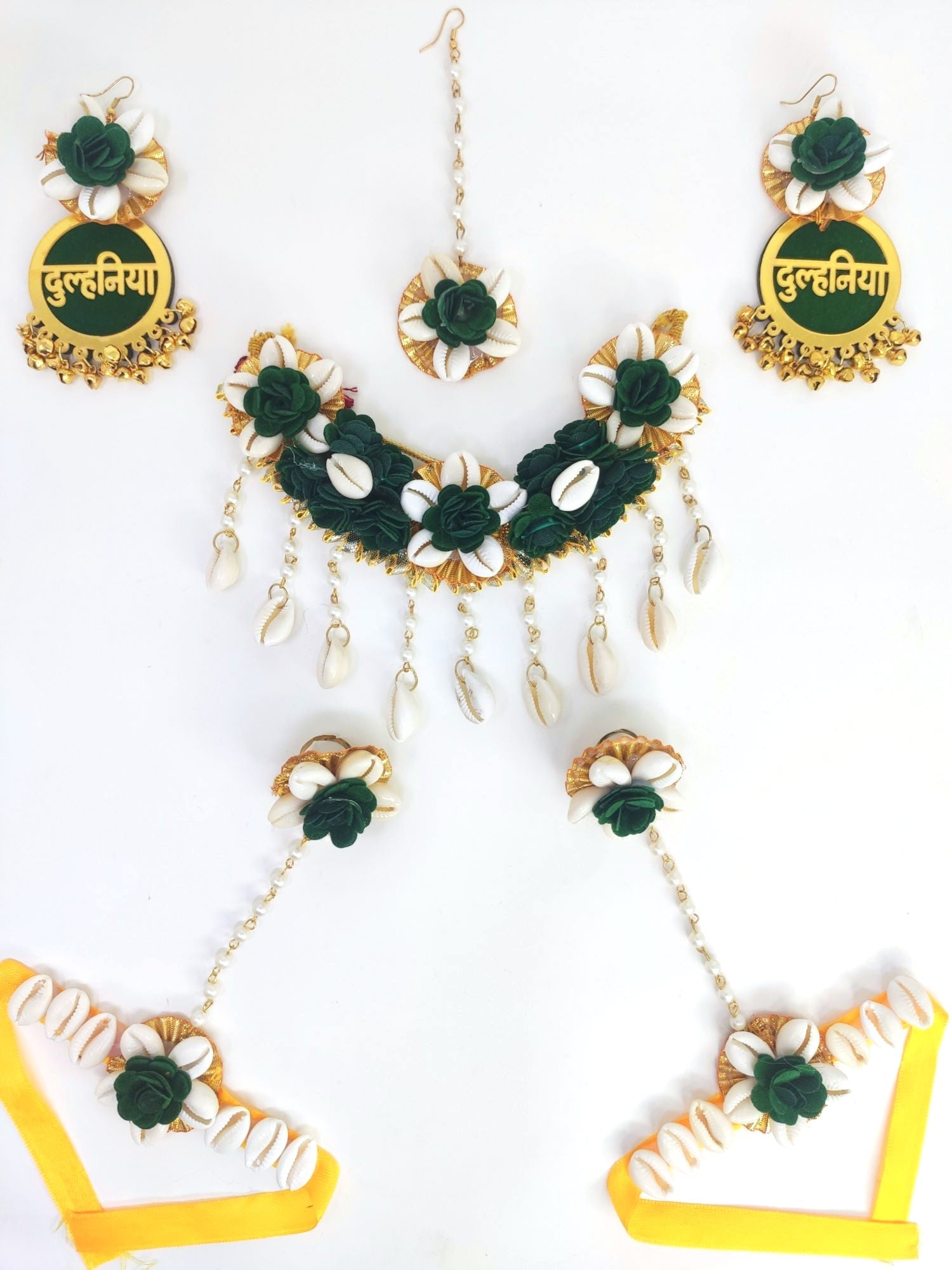 Multicolor ethnic floral jewellery set with pearls and cowrie shells for haldi and mehndi