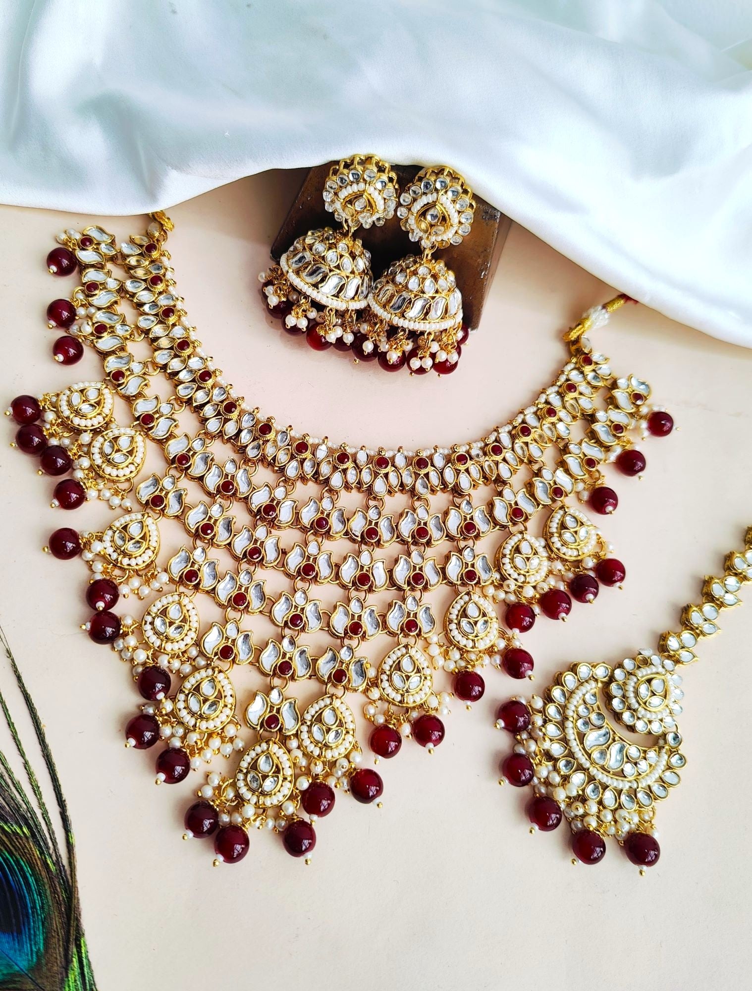 Maroon gold-plated polished alloy necklace and earring set, ideal for women and girls on engagements, anniversaries, festivals, and weddings. Traditional yet modern kundan bridal jewellery set.