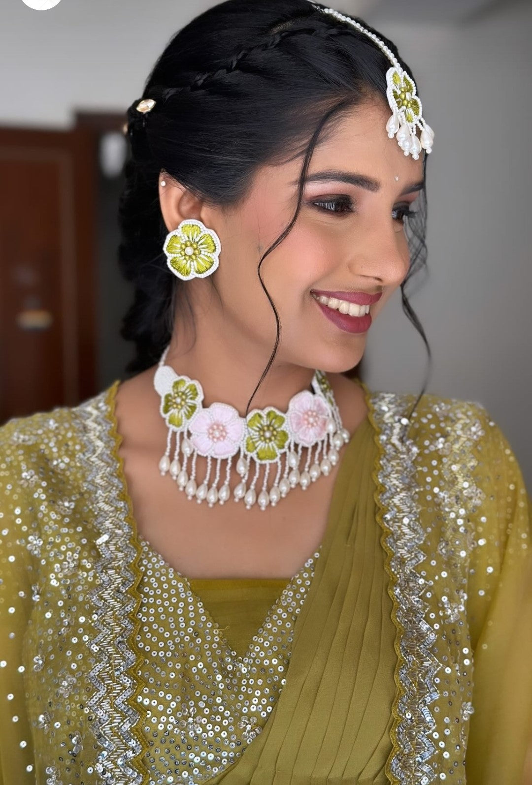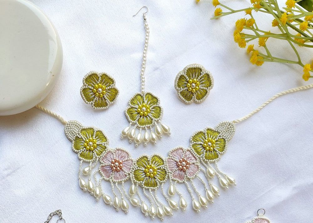 Handcrafted Baby Pink-Green Floral Jewellery Set for Haldi & Mehndi(Necklace, Earrings & Tikka)