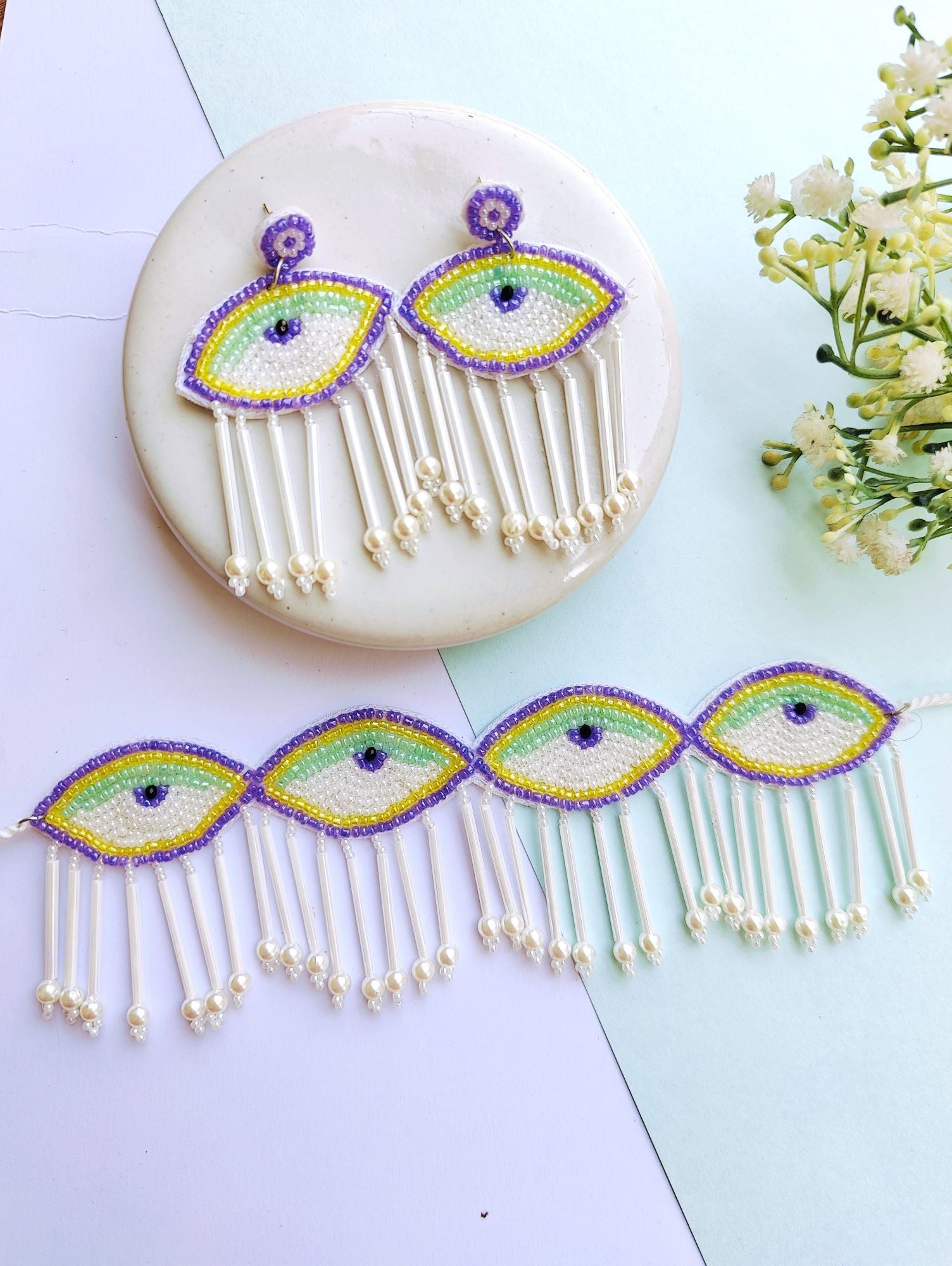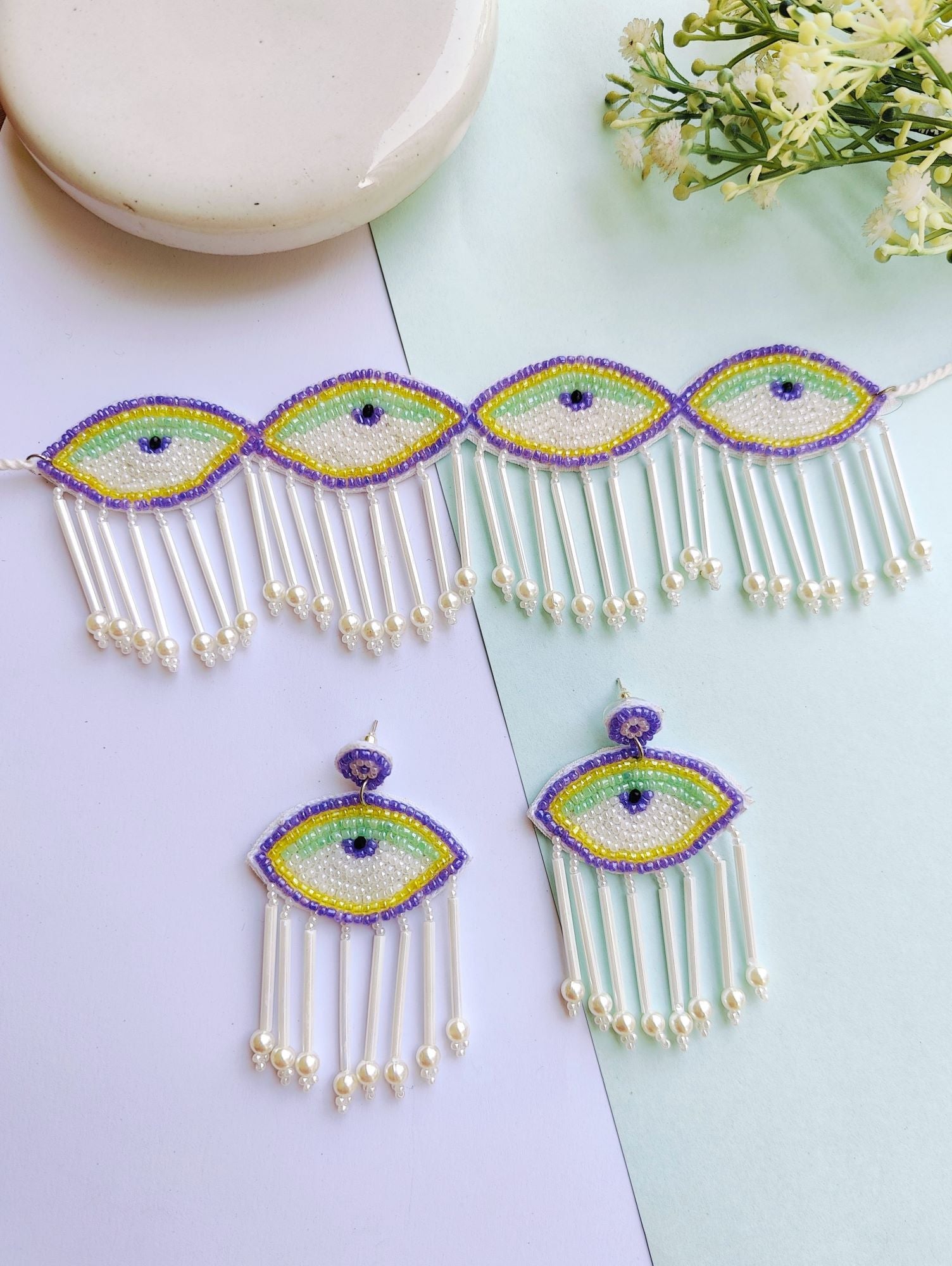 Lavender-White Handmade Evil Eye Beaded Choker & Earrings Ethnic Set